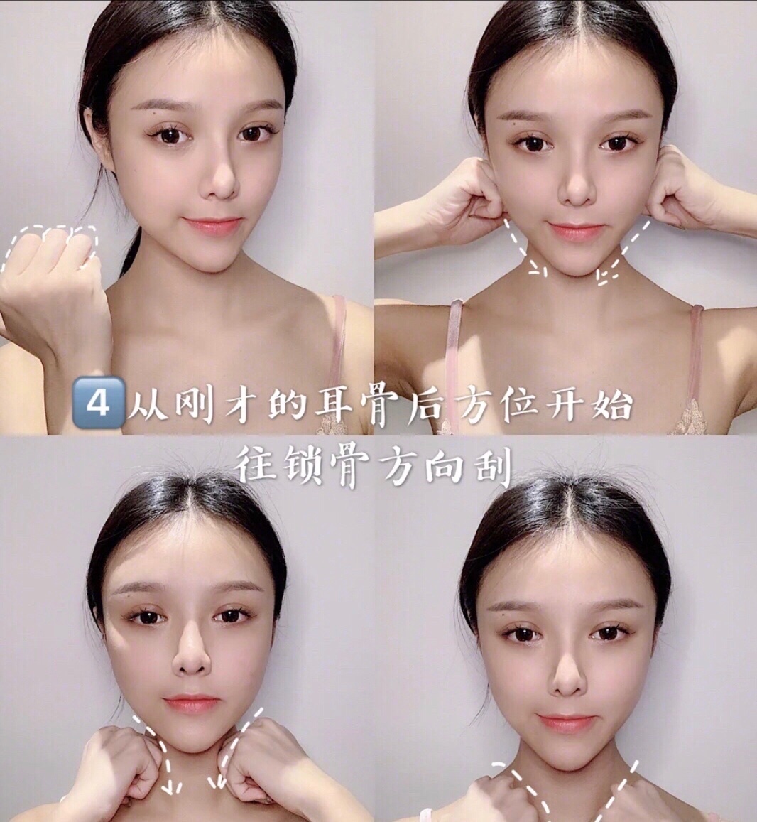 4⃣️用食指中指无名指三个手指一起往往锁骨方向刮可以疏通多个淋巴群缓解双下巴