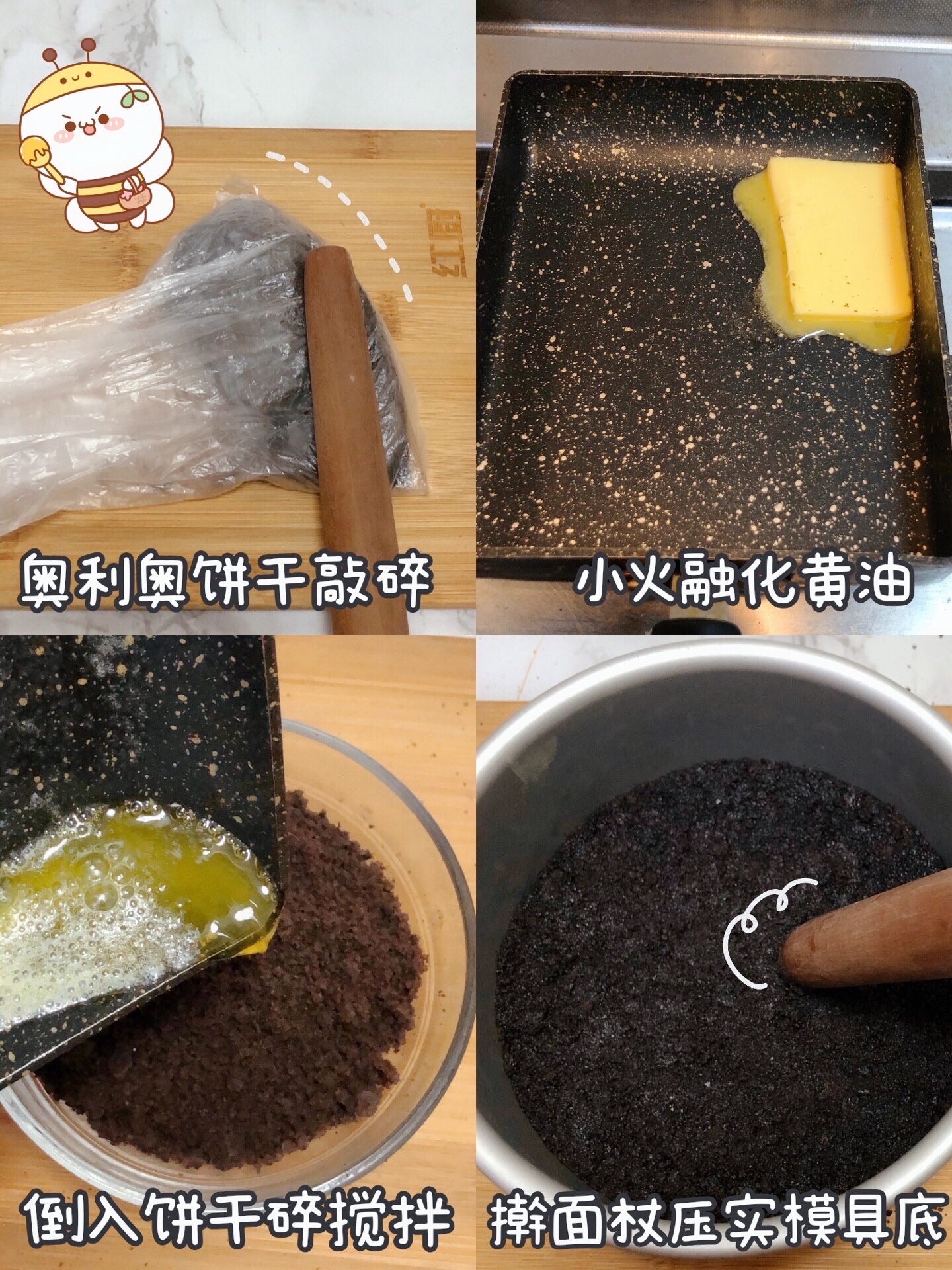 👉🏻奥利奥敲碎,加上融化的黄油,搅拌压在蛋糕模具的底部,冷冻20分钟
