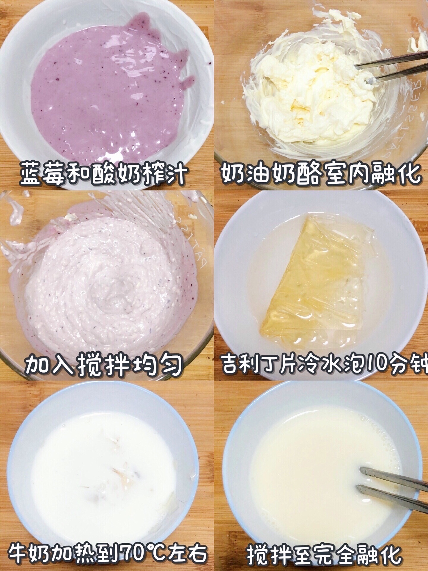 👉🏻吉利丁片冷水泡10分钟,挤干水分加入热牛奶中搅拌至融化【70°左右不要煮开】