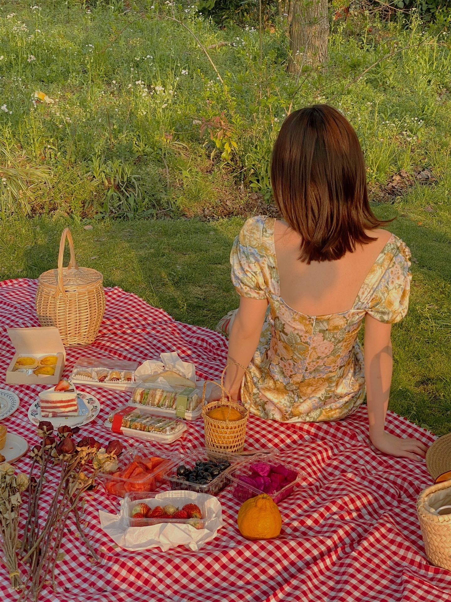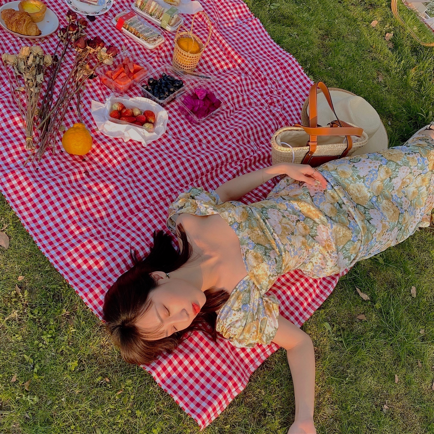 穿搭推荐:😊碎花连衣裙、偏红色、黄色、画面会很出跳哦#公园野餐#