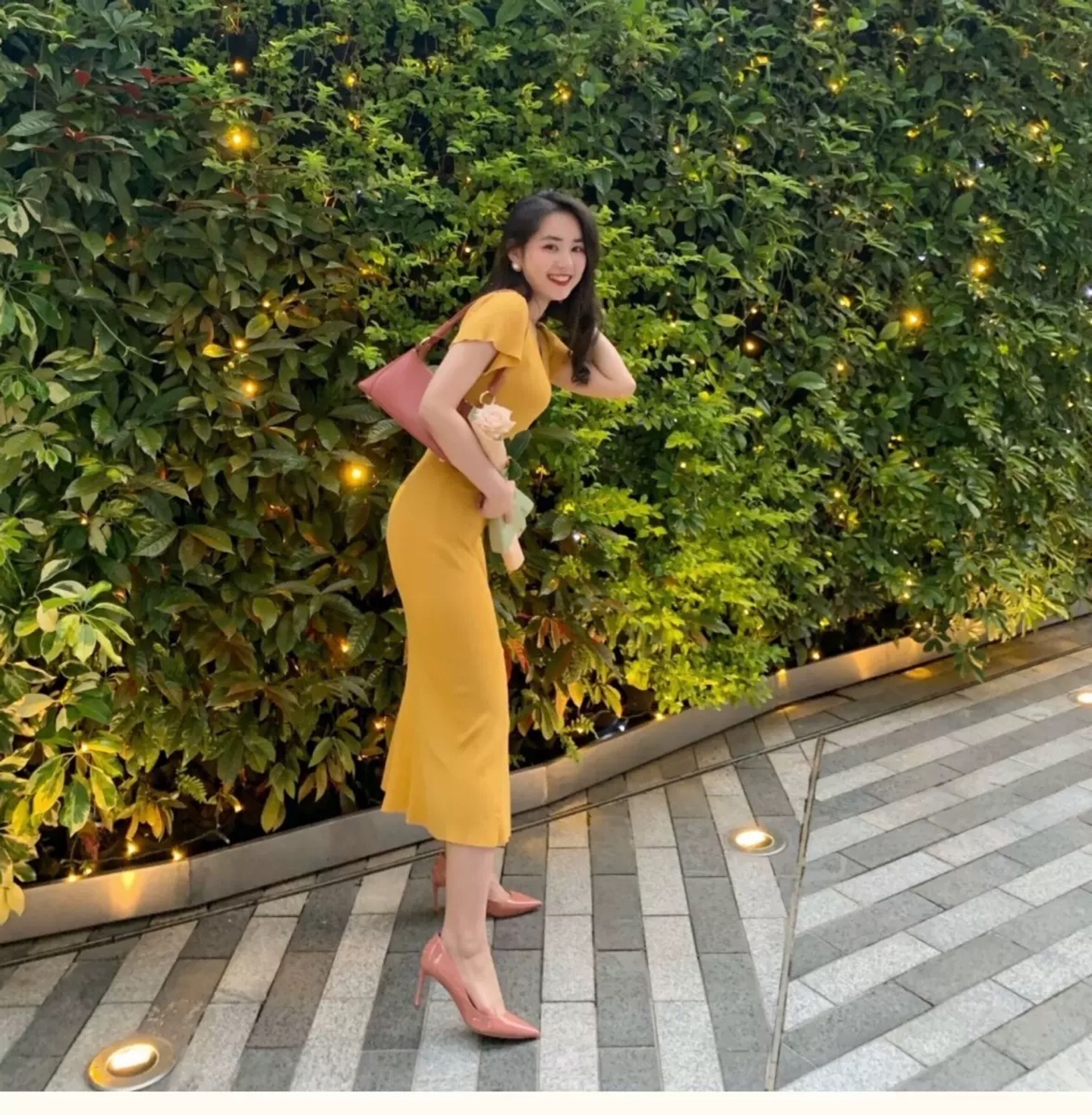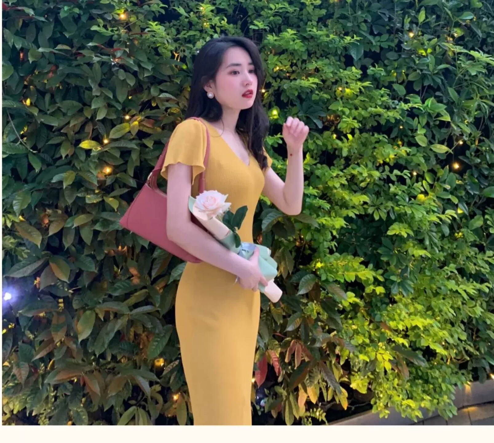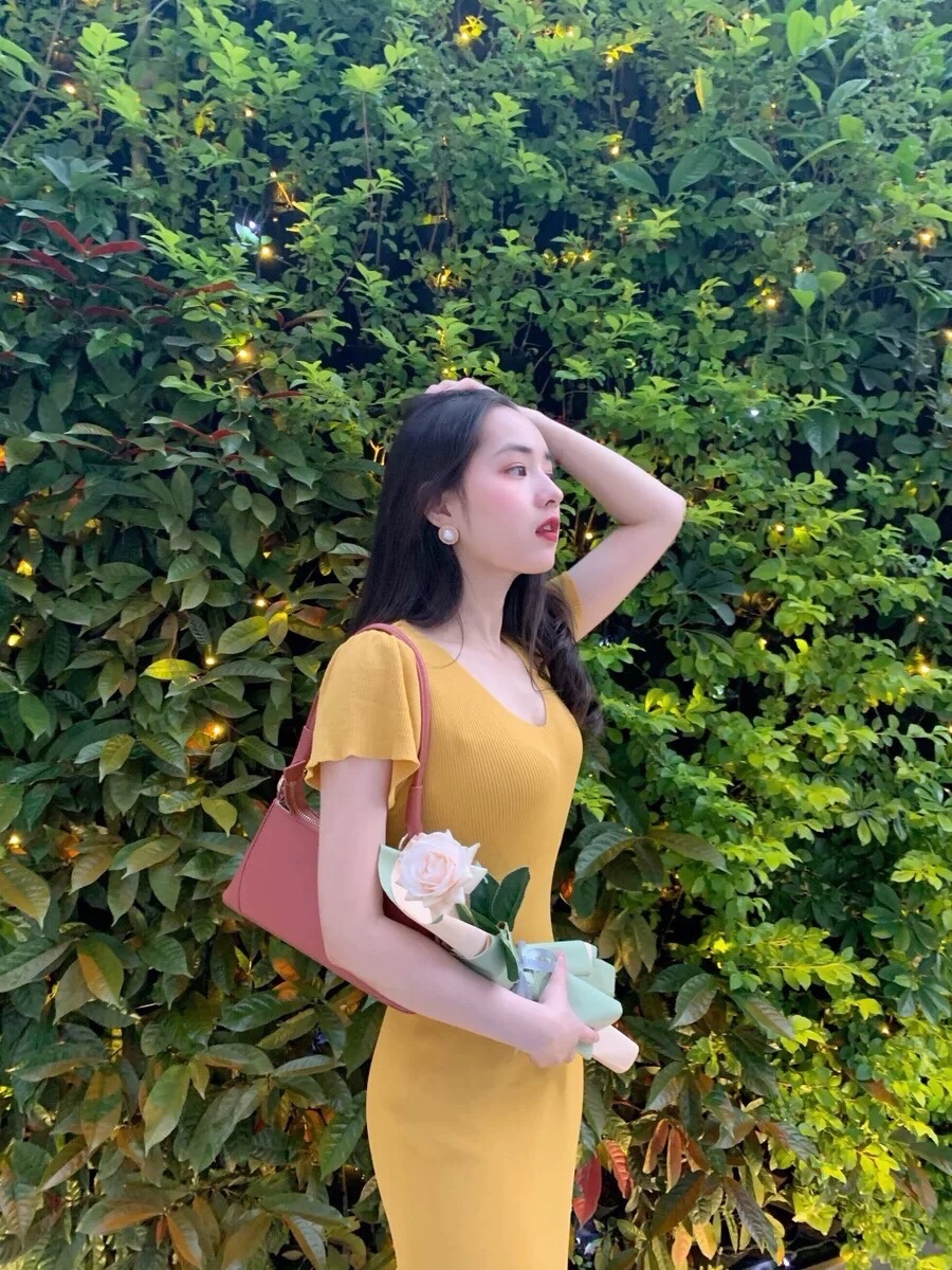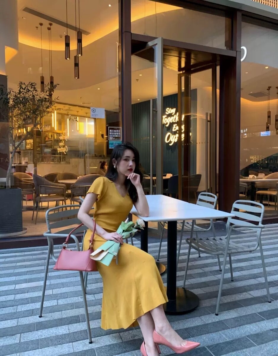 淡黄色的长裙。蓬松的头发#女生拍照姿势##春日穿搭##今日份滤镜推荐#