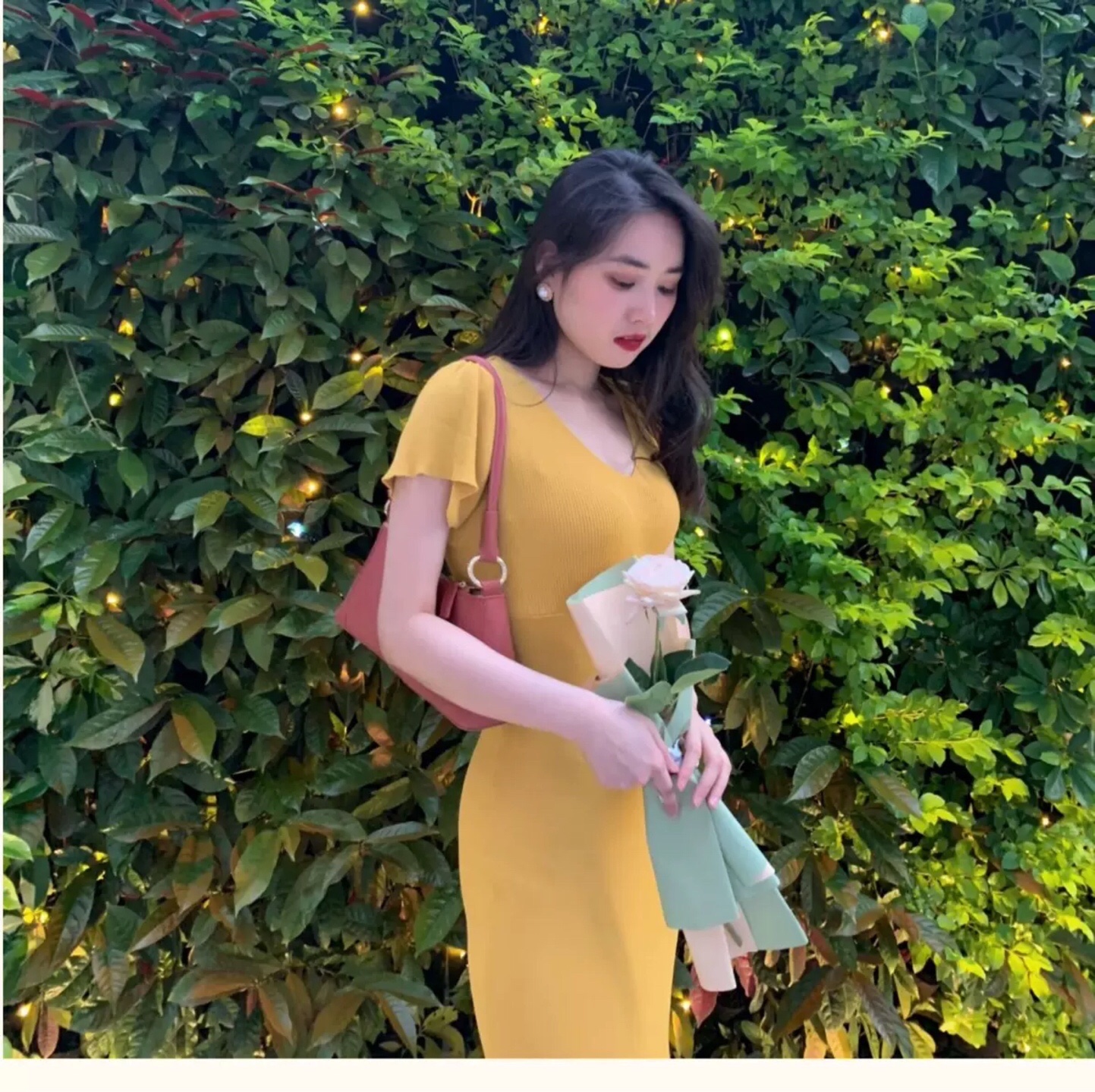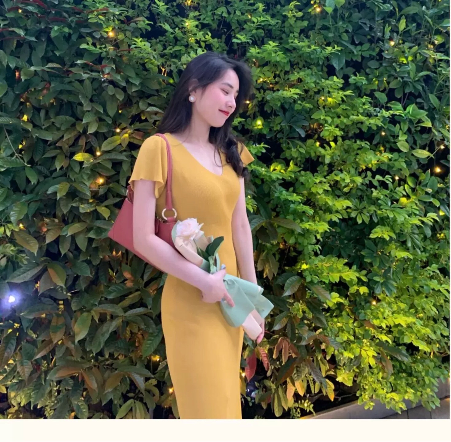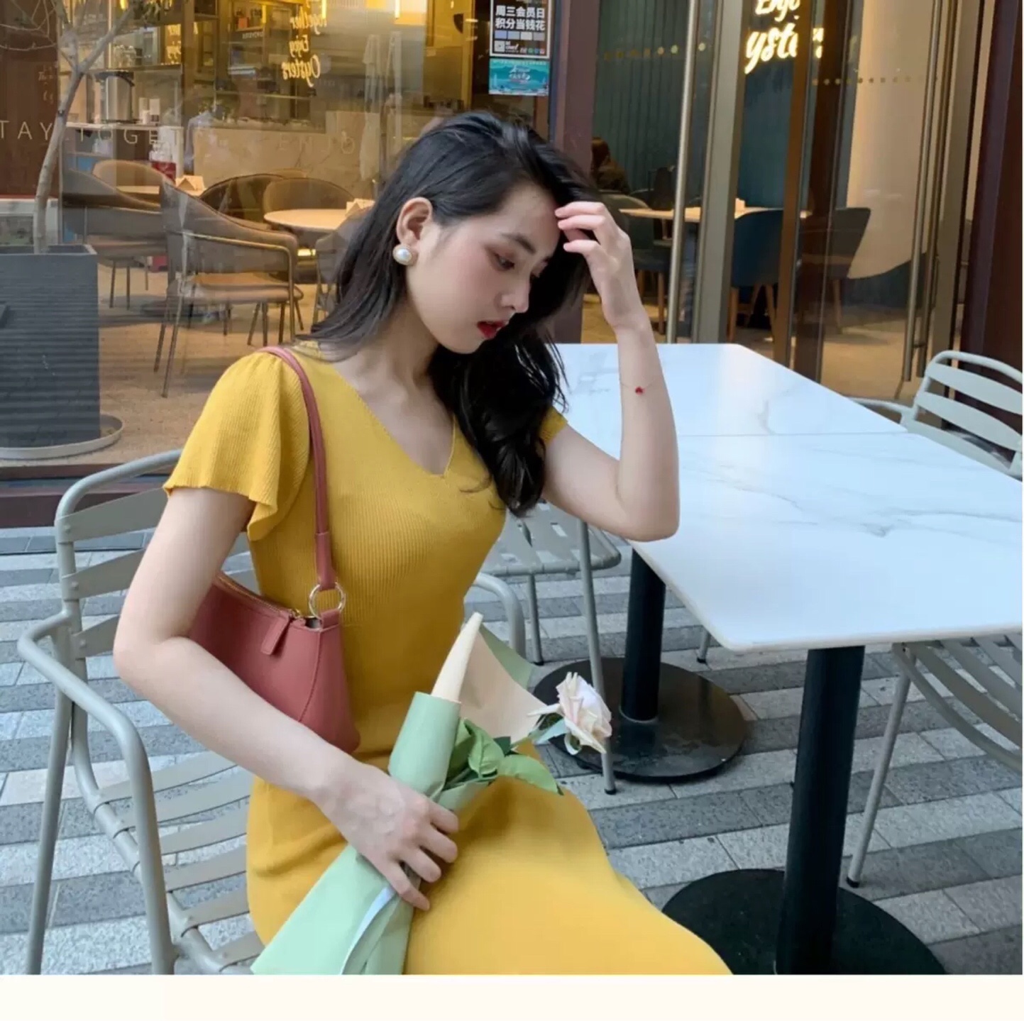 淡黄色的长裙。蓬松的头发#女生拍照姿势##春日穿搭##今日份滤镜推荐#