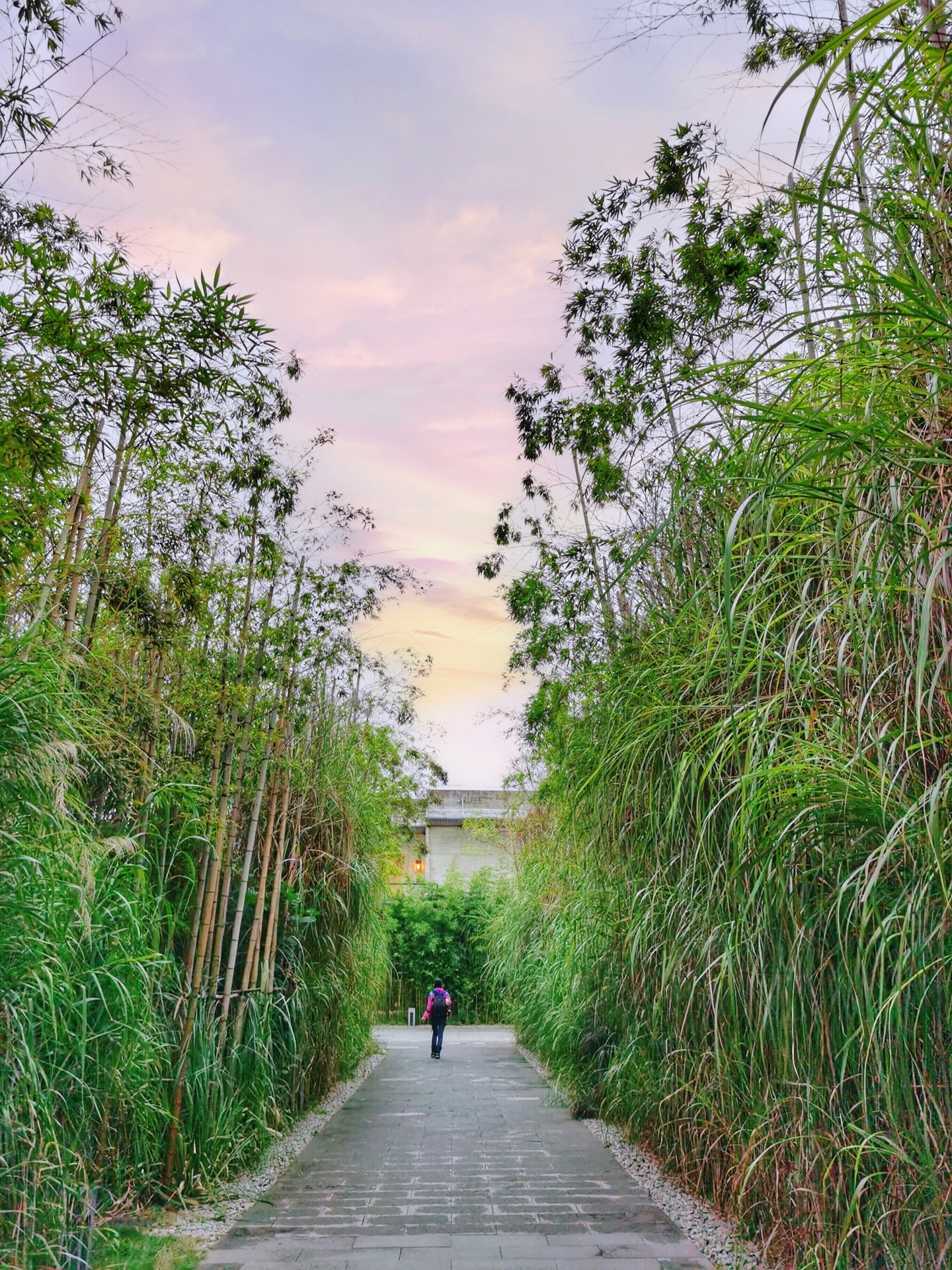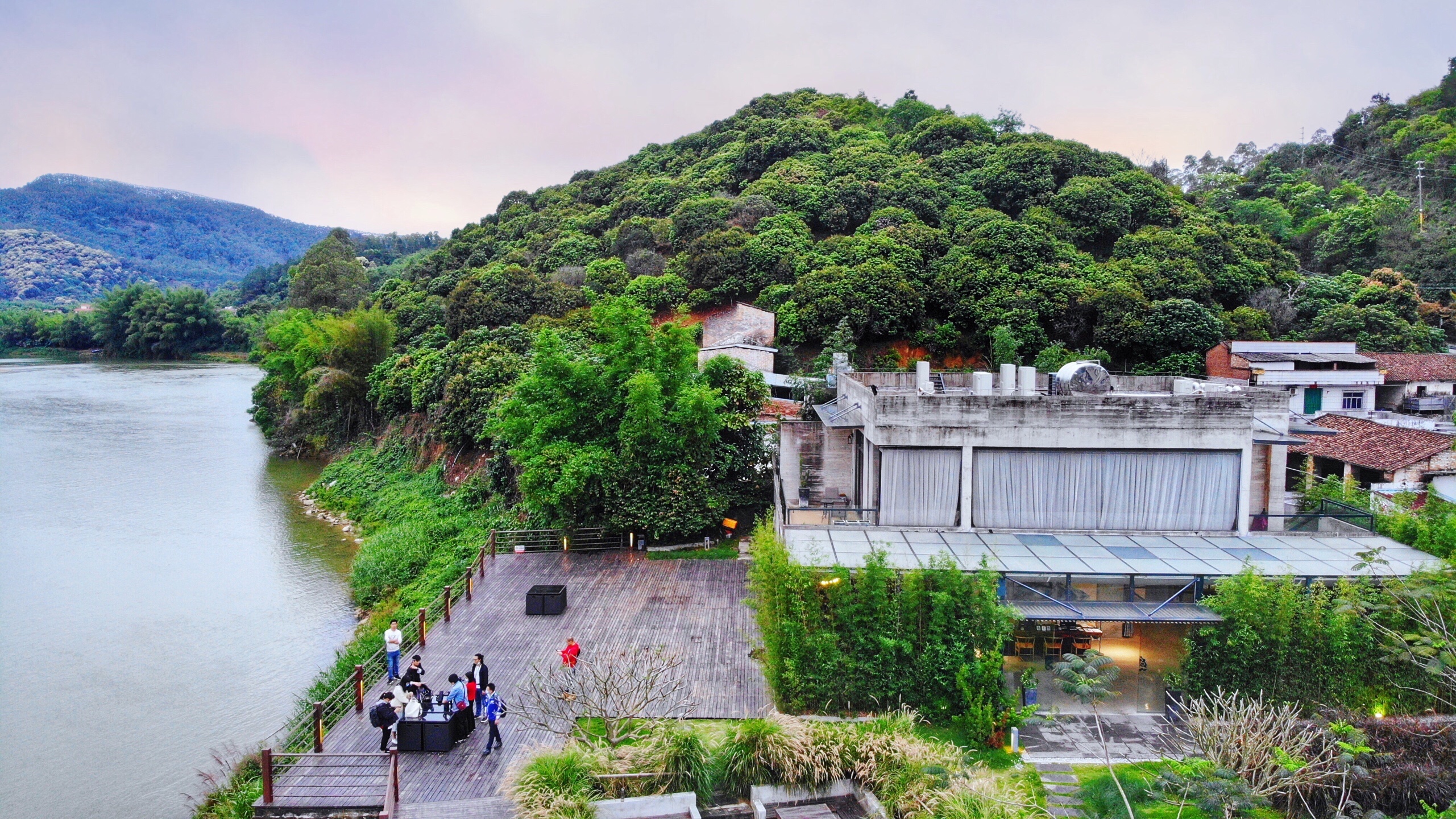 民宿临江而建,面朝增江,背靠九峰山,毗邻湖心岛景区,环境舒适,风景优美。看到锈迹斑驳的门牌,经过婆娑的竹林,穿过茂盛的狗尾草,灰色工业风的民宿映入眼帘。