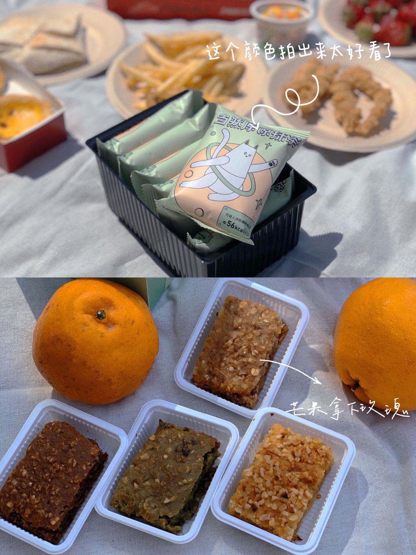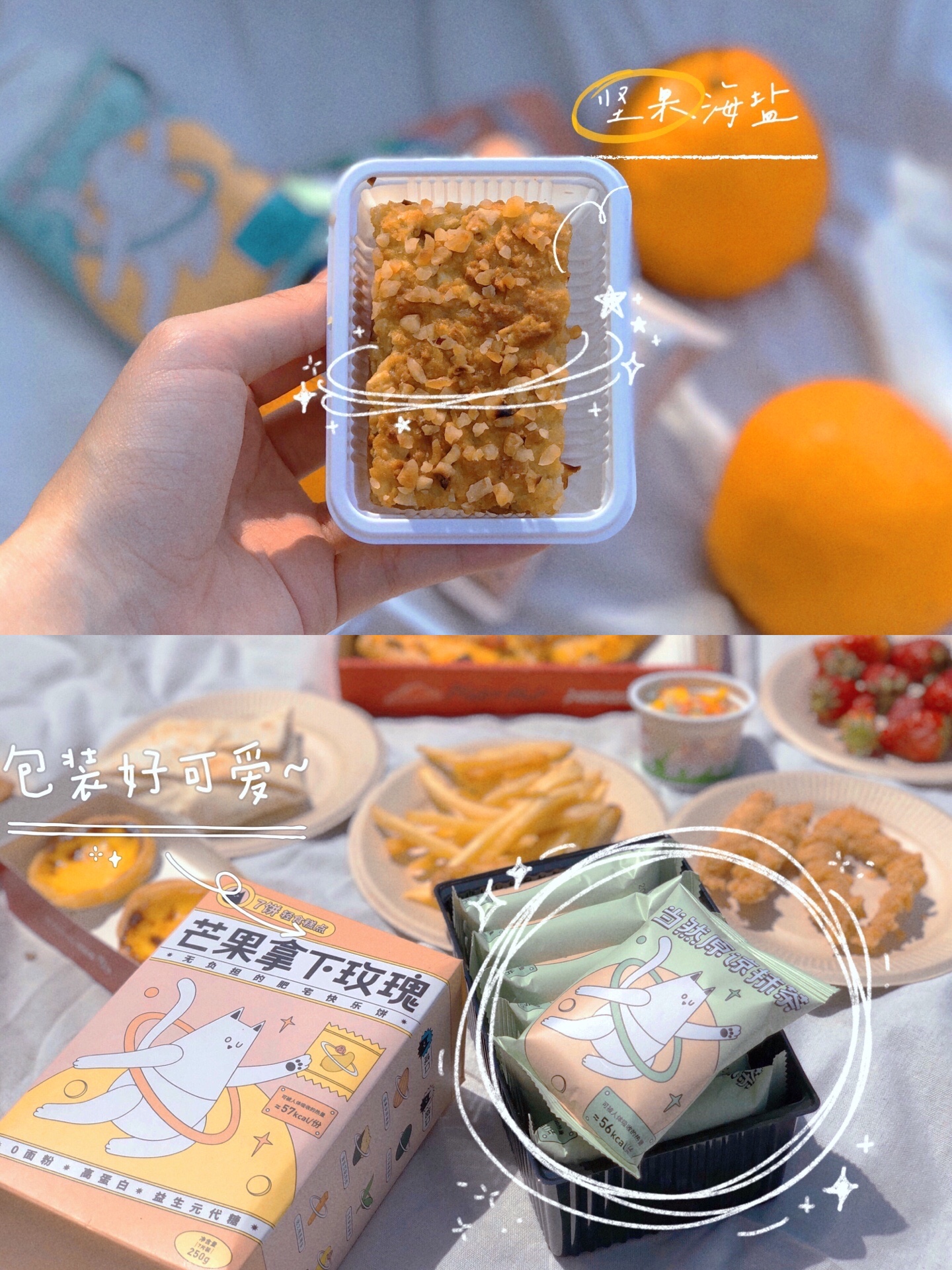 ❷ 小零食:带薯片饼干🍪真的没有体验感 我选了很久找到了一个拍出来很好看而且大家都喜欢吃的低卡小零食👏🏻未来可7家的7饼!我喜欢抹茶和芒果🥭口味 包装的色调拍出来我真的爱了 是独立包装的小小一个很便携 低卡0糖0油的小蛋糕 它还可以加速脂肪代谢 里面的料都很足 因为野餐带了很多小吃类的 这个就可以增加饱腹感 一包只有56Kcal 这个都是现做的吃起来软软的太幸福啦 边玩游戏边吃!