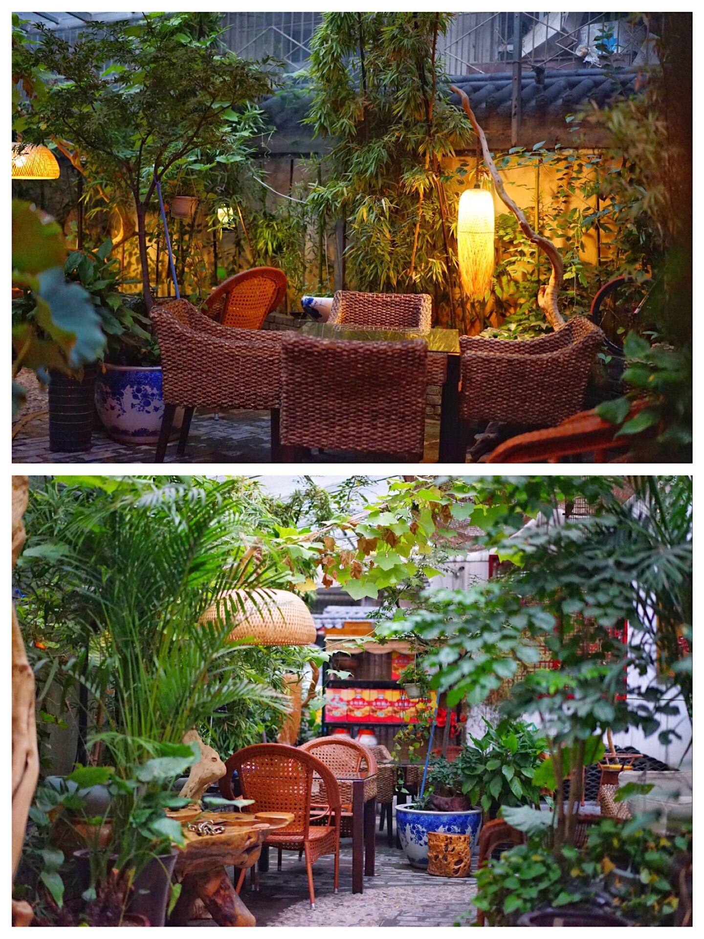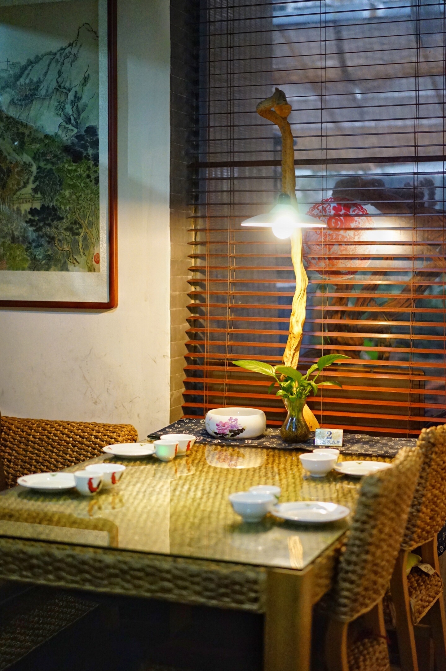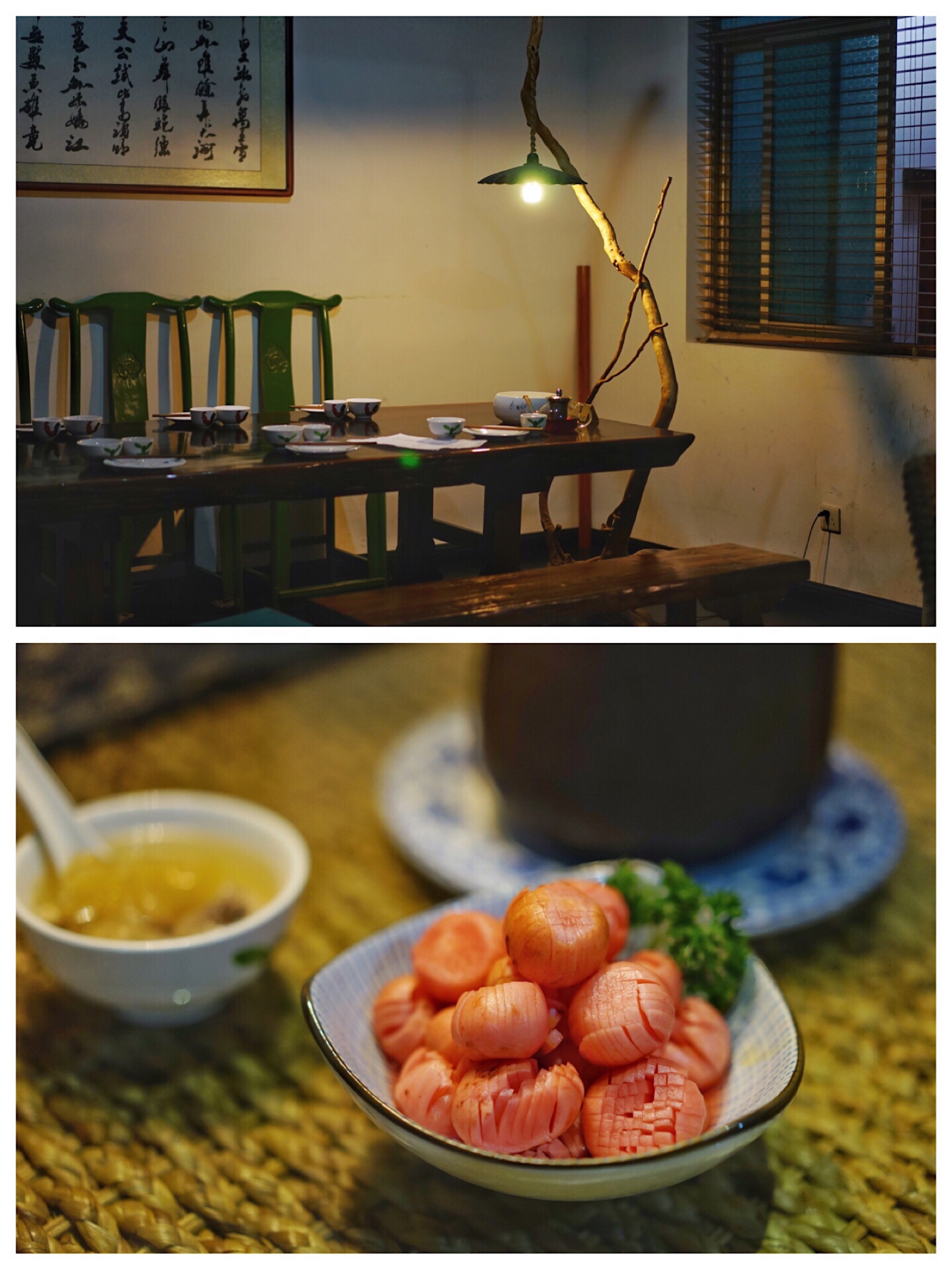 从与大马路垂直的楼宇间小道进去便是,小道有些深邃,夜晚时分没有路灯,如果不是搜到,断不会有人知道里边有一个平房小院,在绿植围绕中自然古朴,是畅叙幽情的避世之地。室内两个空间,店面适中。枯木上打着一颗孤灯,照耀着桌子上同样悠远的花瓷盘和公鸡碗