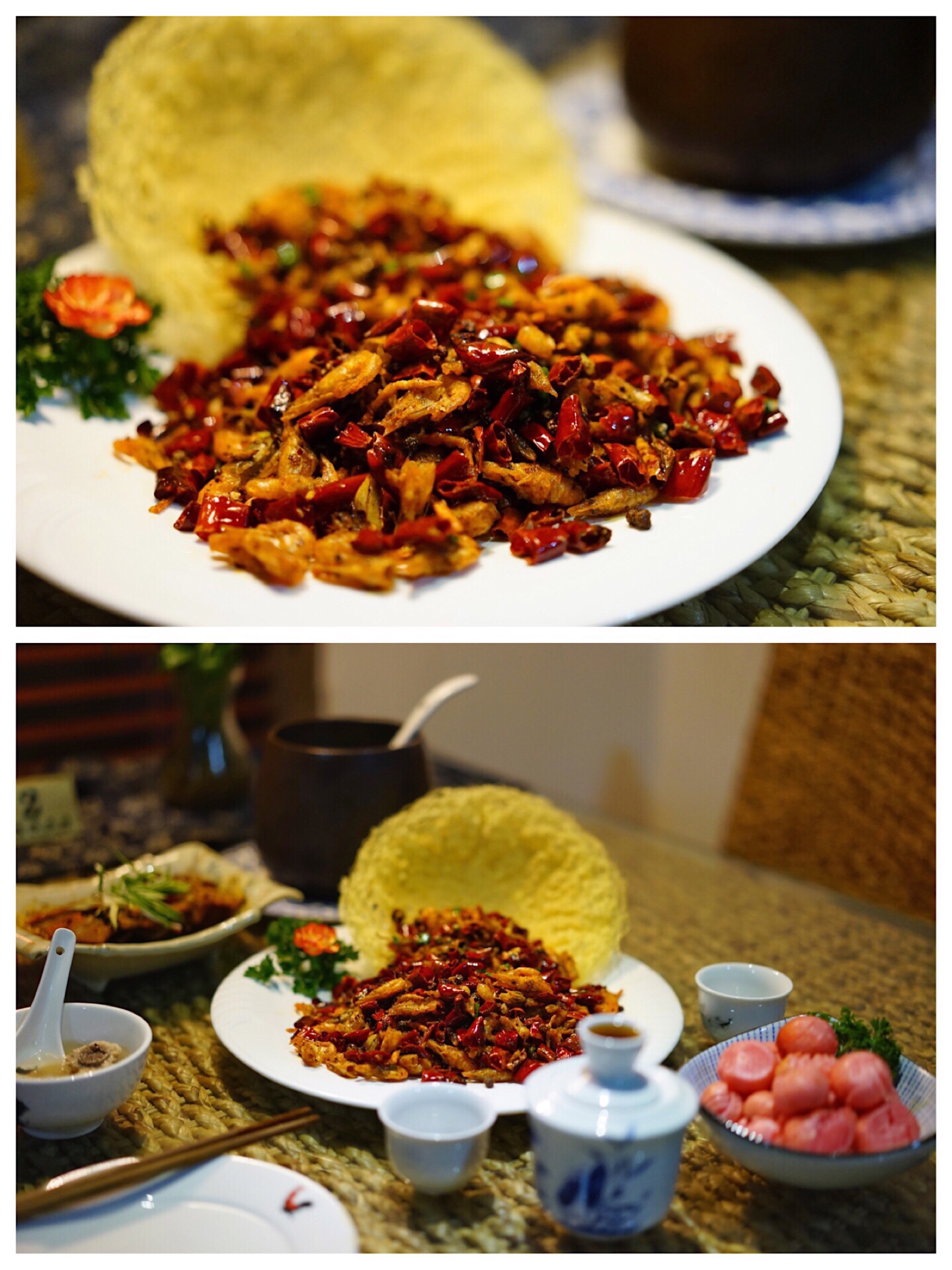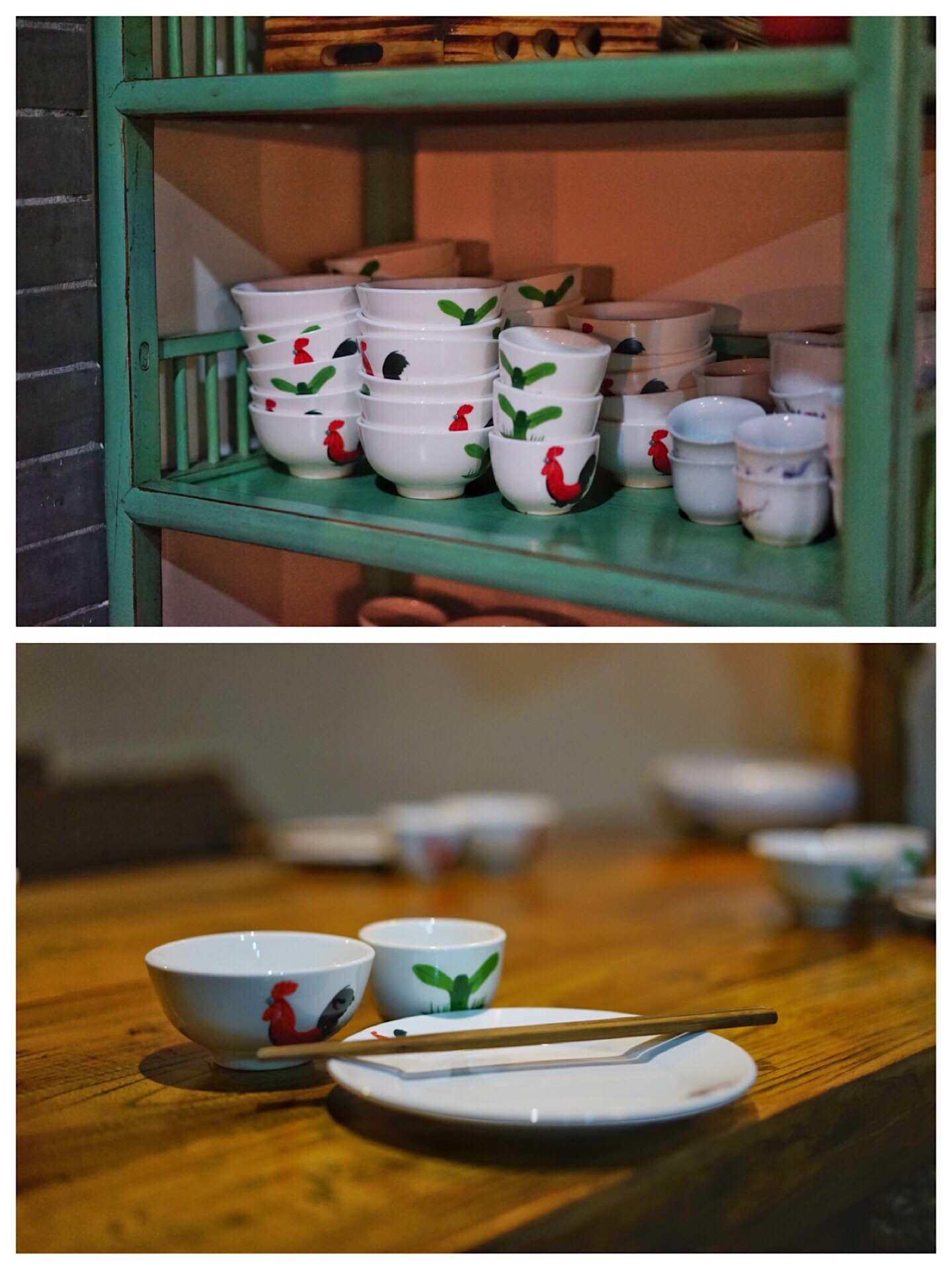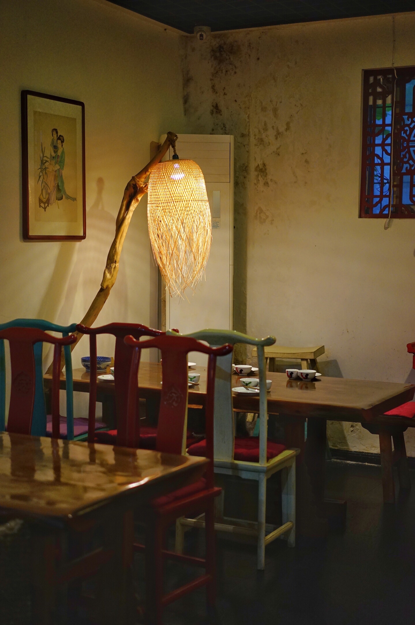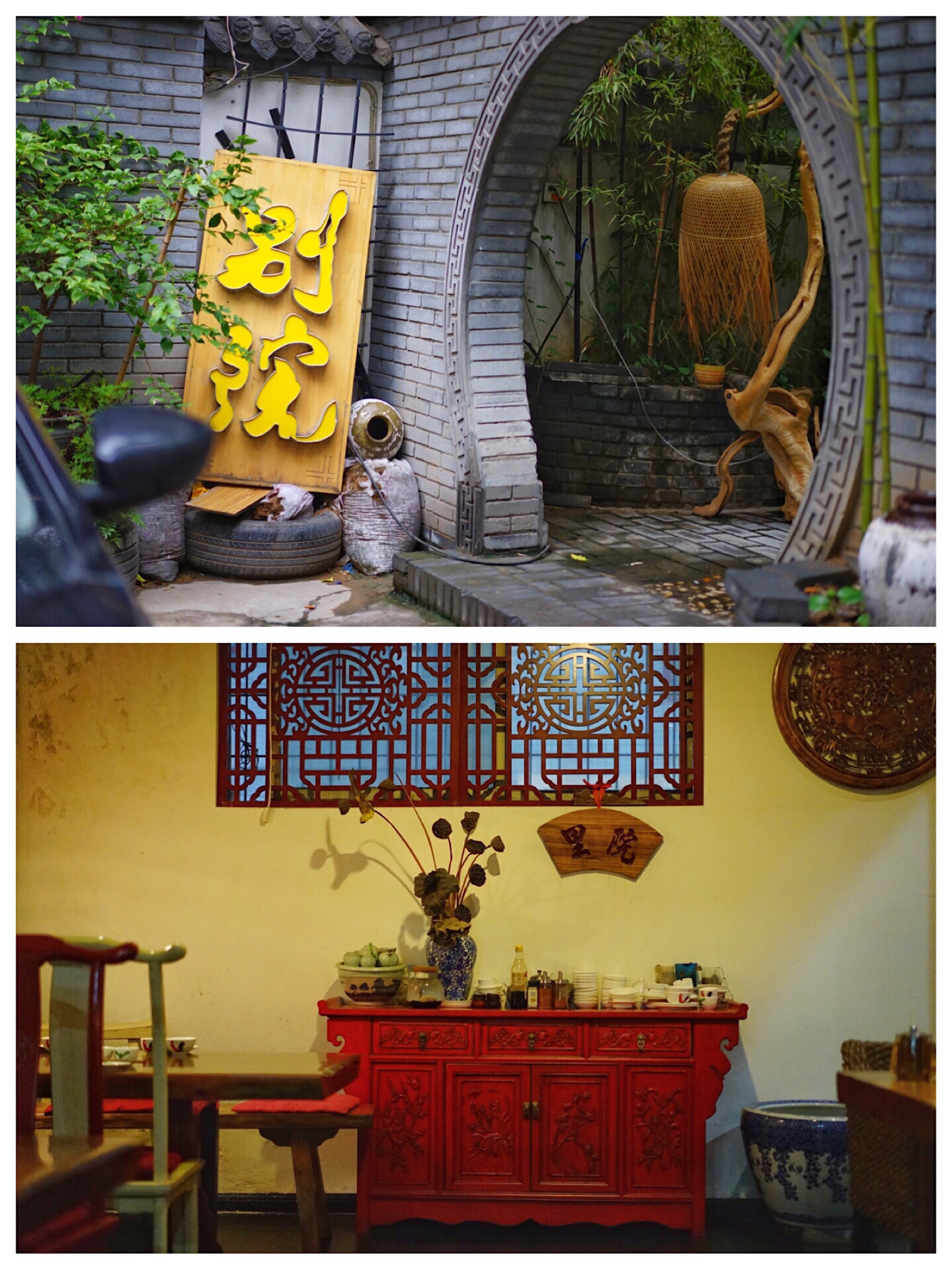 从与大马路垂直的楼宇间小道进去便是,小道有些深邃,夜晚时分没有路灯,如果不是搜到,断不会有人知道里边有一个平房小院,在绿植围绕中自然古朴,是畅叙幽情的避世之地。室内两个空间,店面适中。枯木上打着一颗孤灯,照耀着桌子上同样悠远的花瓷盘和公鸡碗