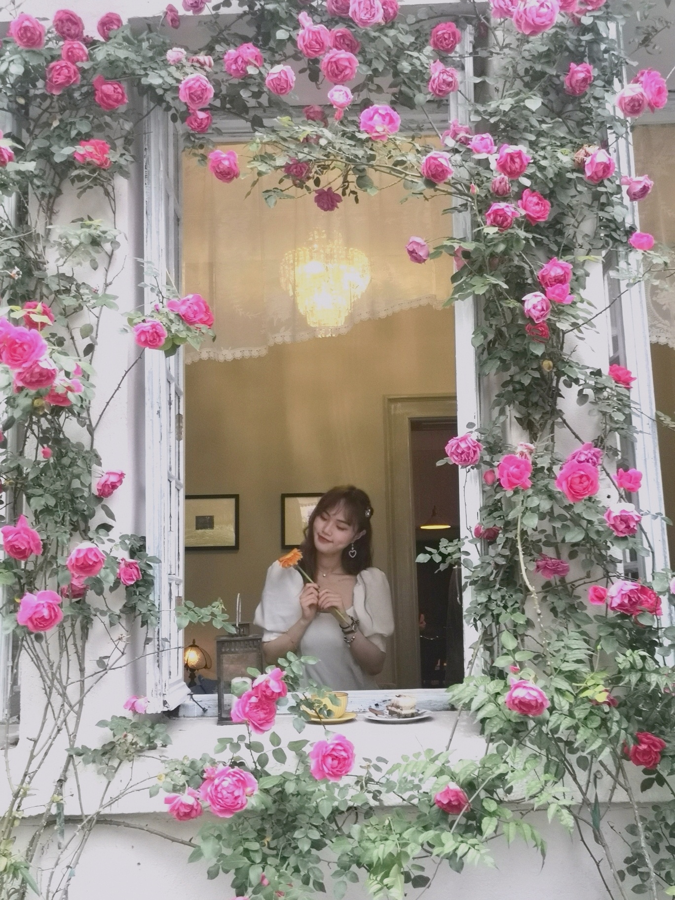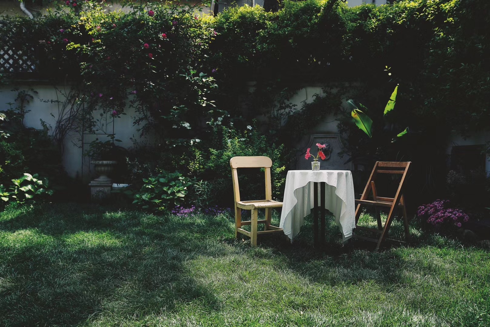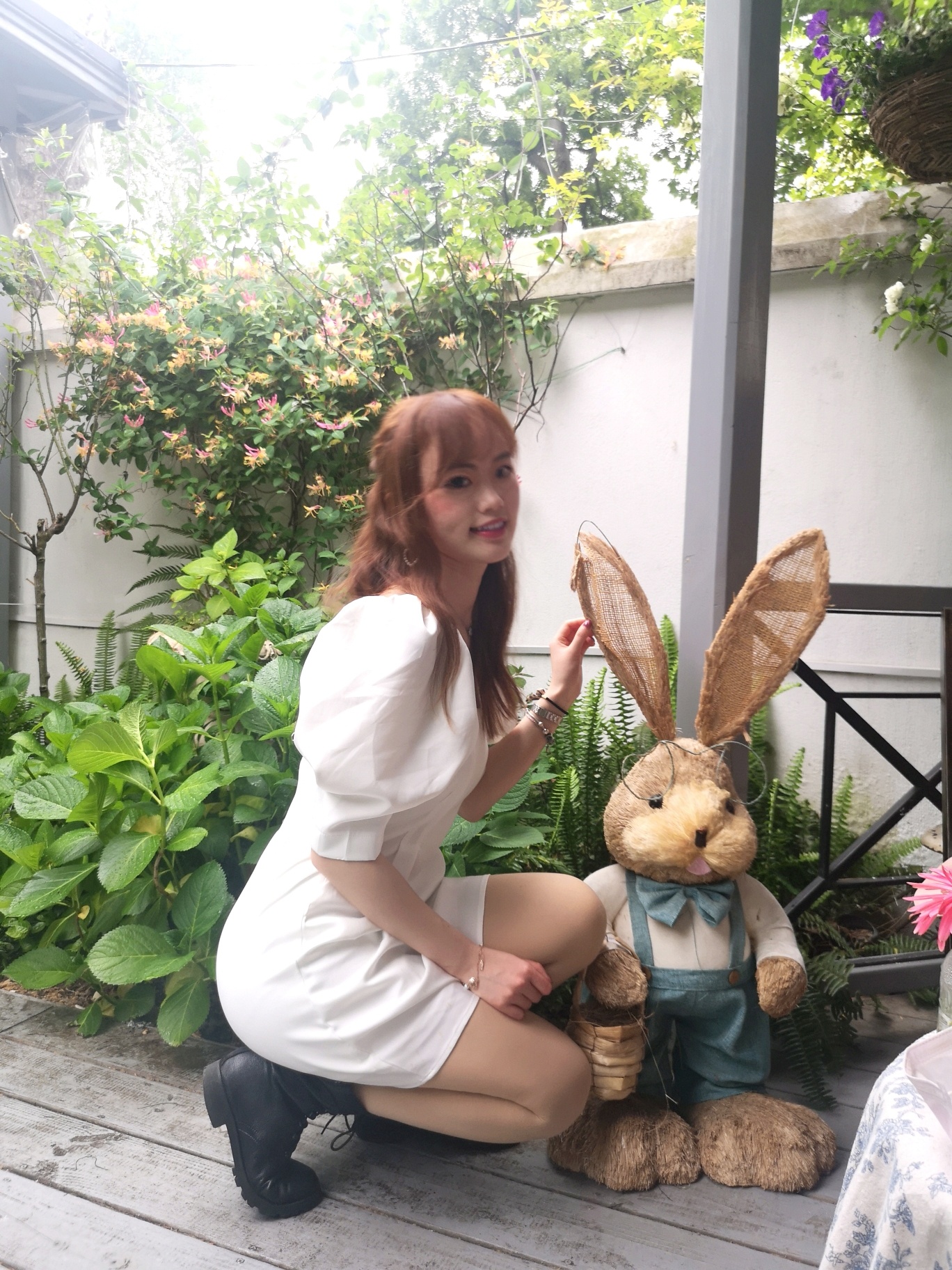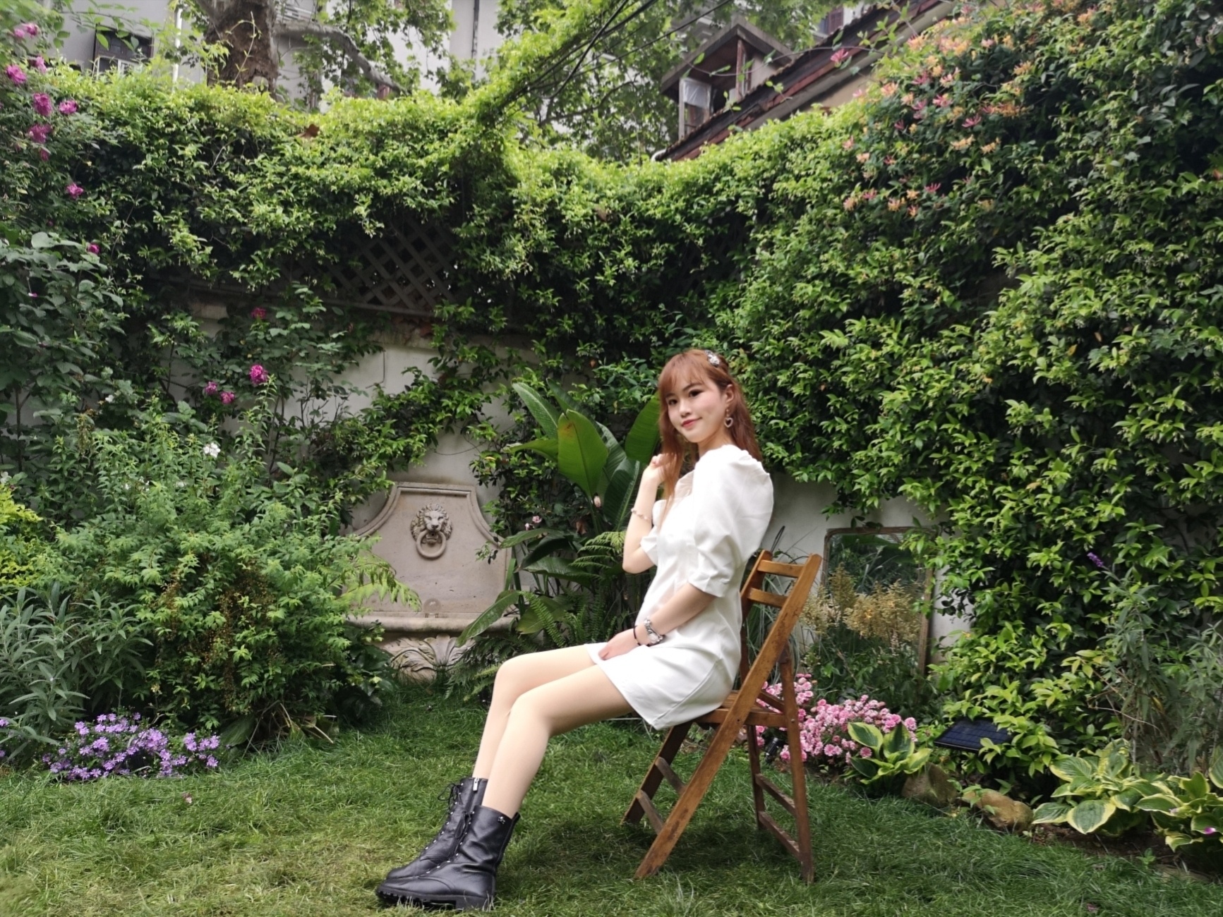 一进门就可以看到一个室外小庭院,小小的草坪上种了蛮多花,旁边有两个亭子,很有法式田园的感觉。