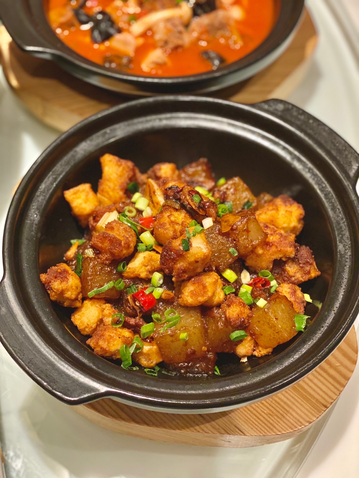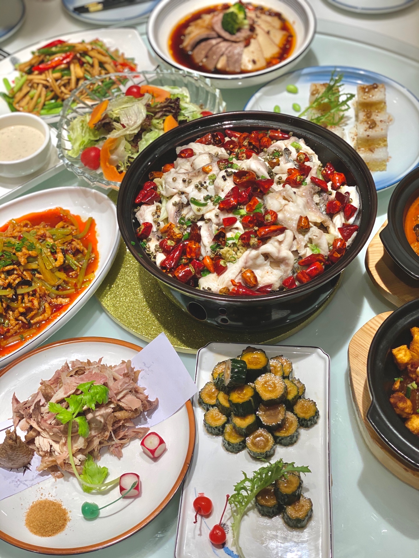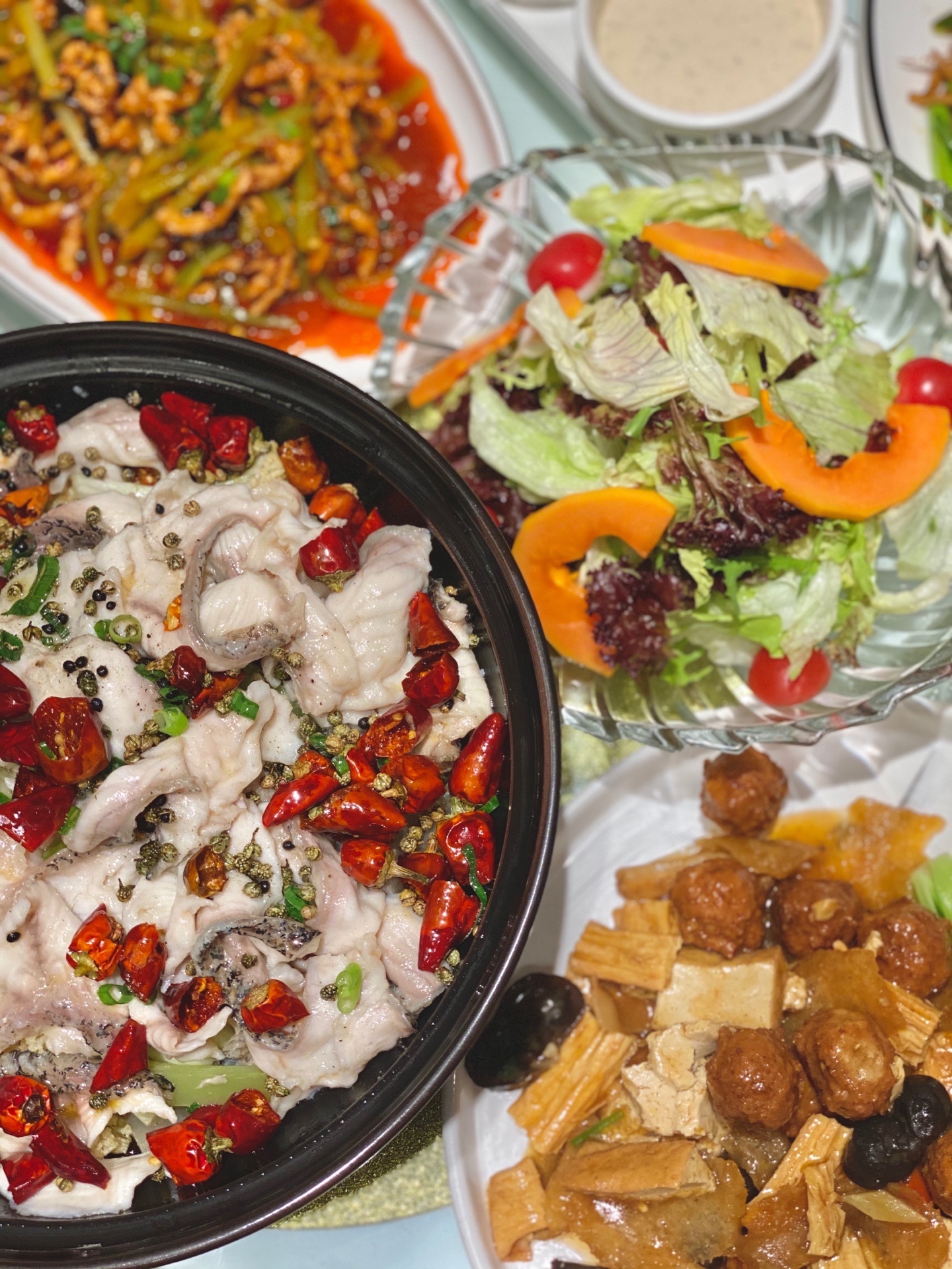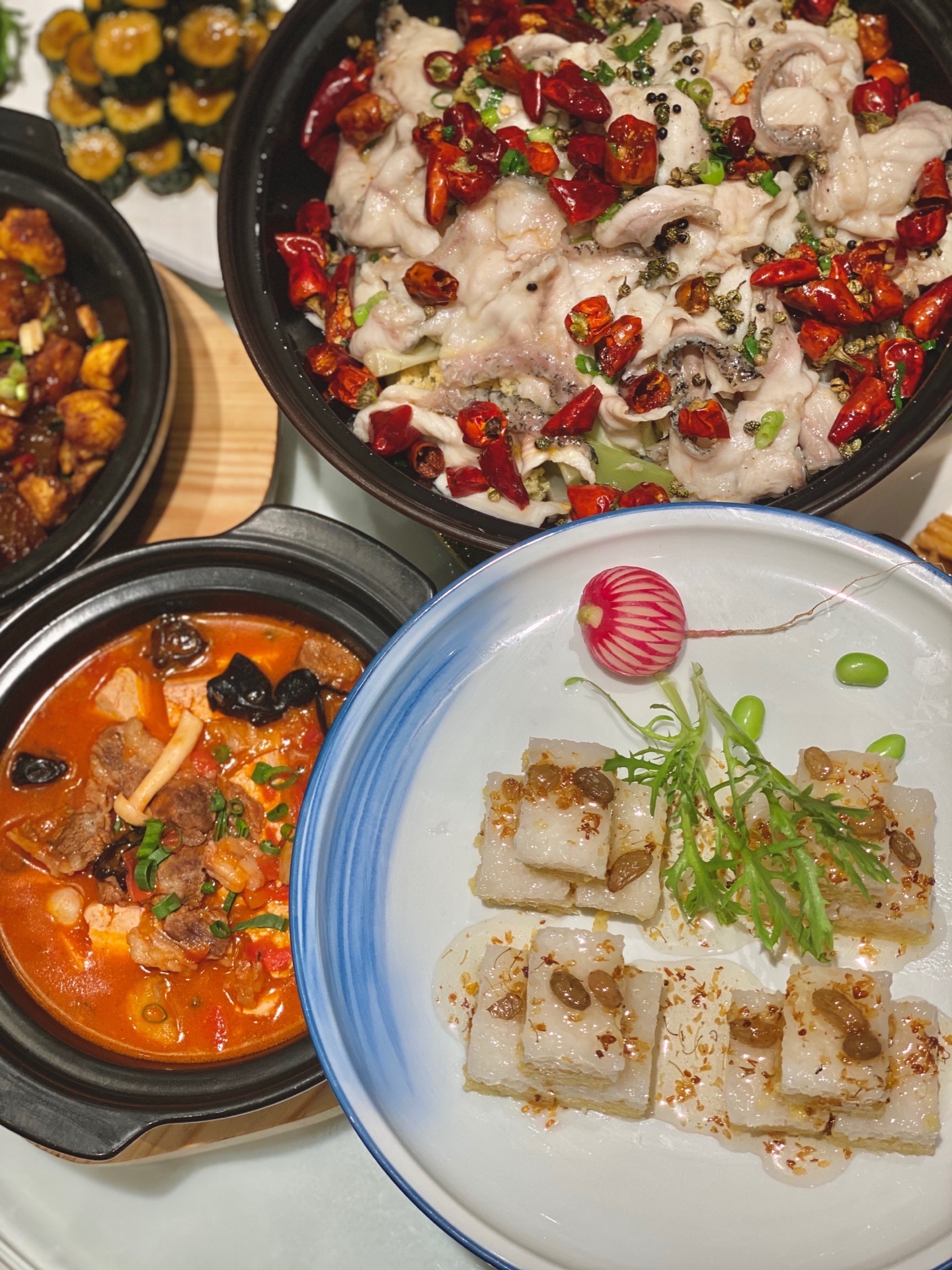 石锅凉粉、番茄炖牛腩、陕味烧三鲜、有鱼的鱼香肉丝、酸爽圣女果、桂花凉糕都超级好吃哟~