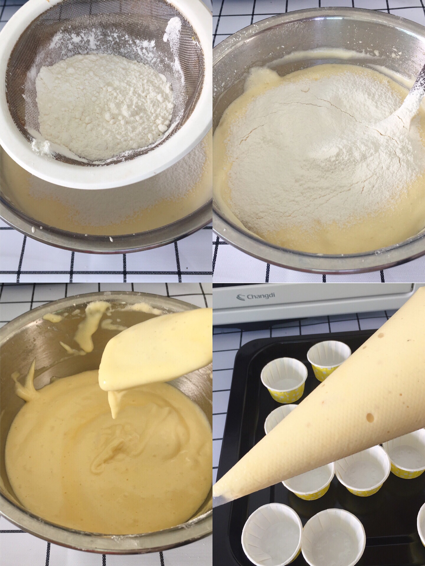 2️⃣打发至提起打蛋嚣鸡蛋糊往下滴不会马上消失,分两次过筛低筋面粉进去,翻拌混合即可。