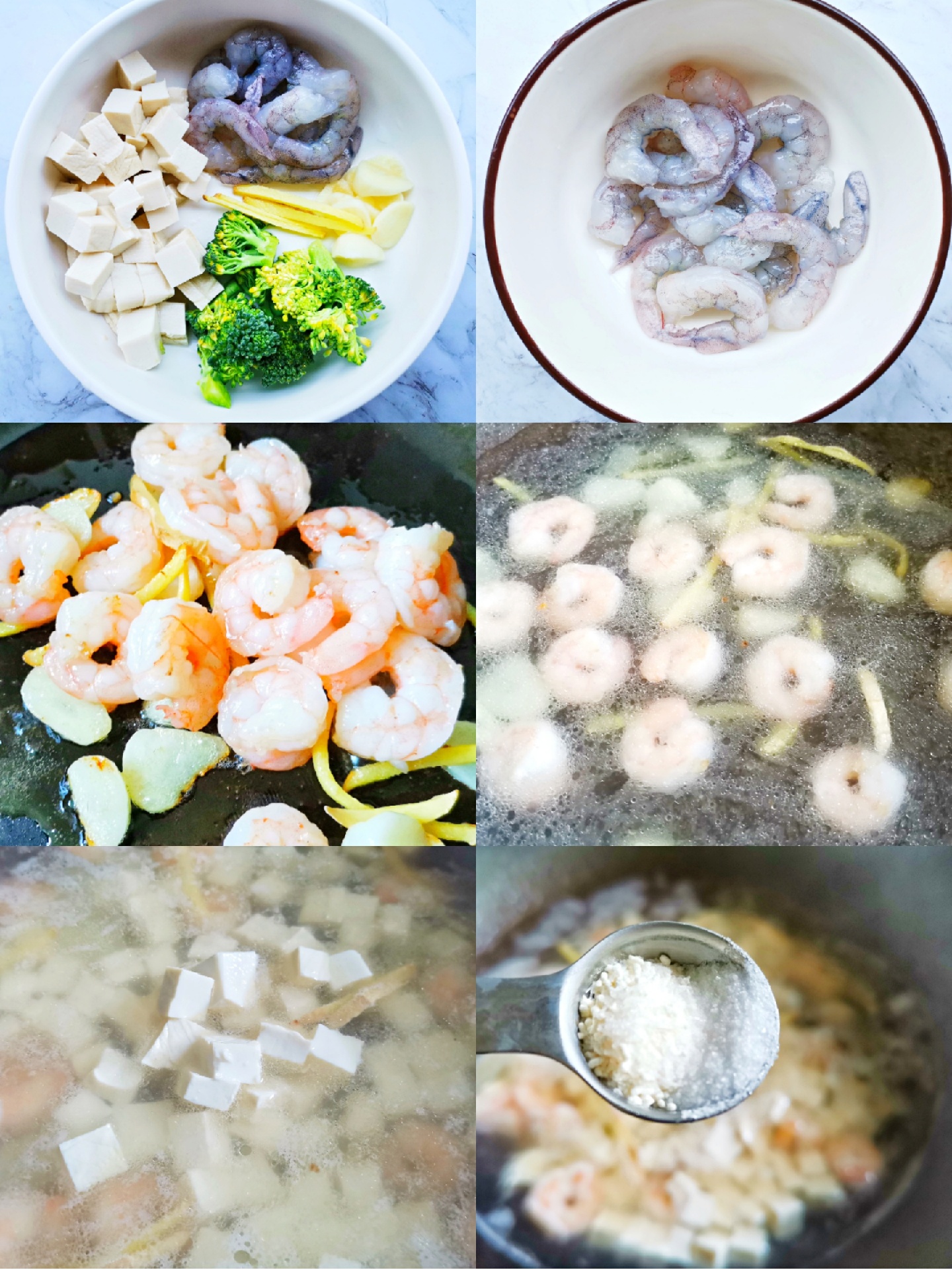 2⃣锅中热油,加入姜蒜爆香,加虾仁炒变色,加一碗水煮开,倒入豆腐再次煮开,加半勺盐➕半勺胡椒粉调匀,最后加入西兰花煮20秒出锅!