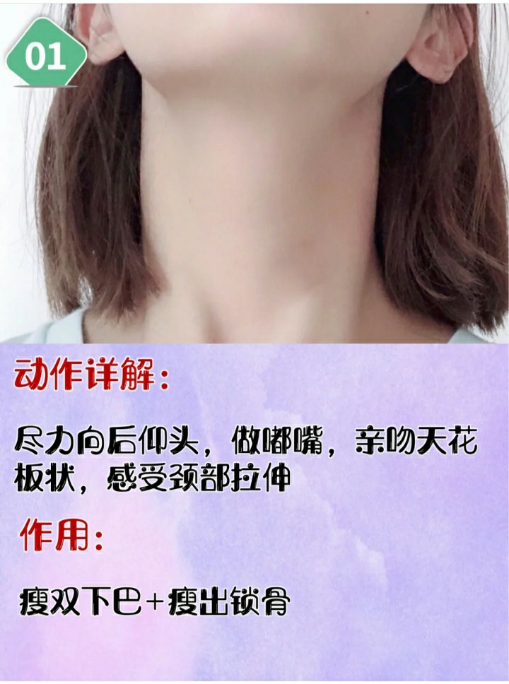 1.往后用力仰头,做嘟嘴亲吻天花板状,可以瘦双下巴跟脖子上的肉肉