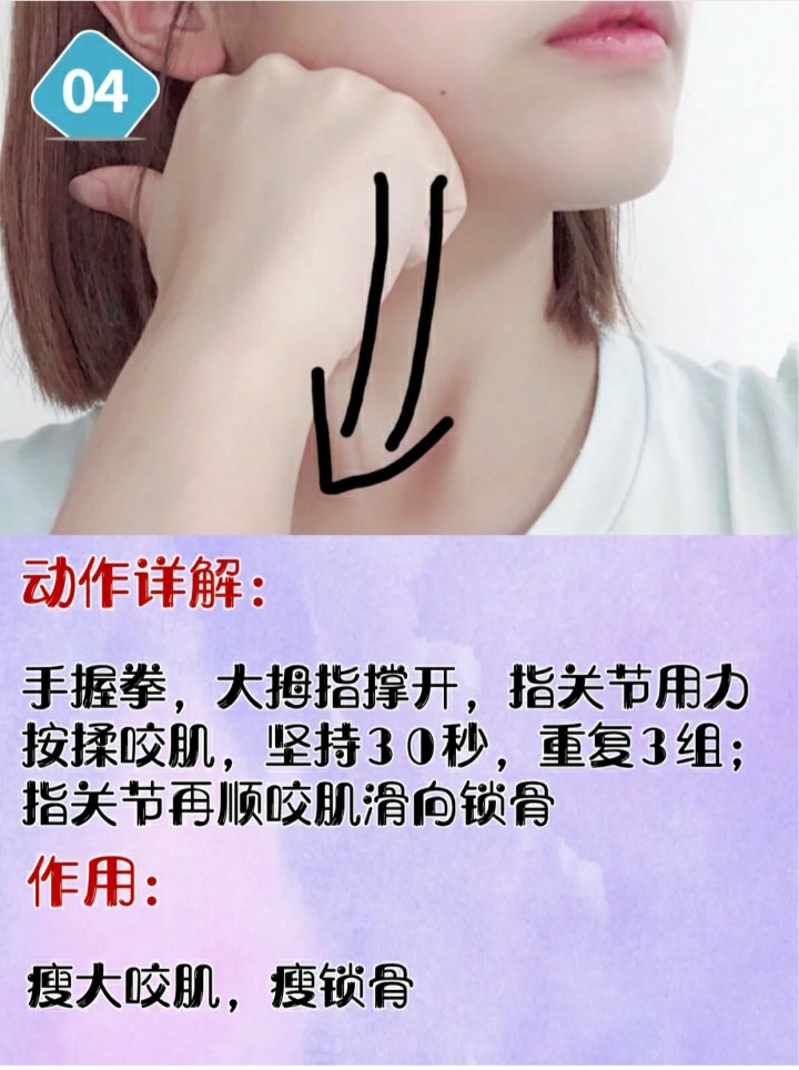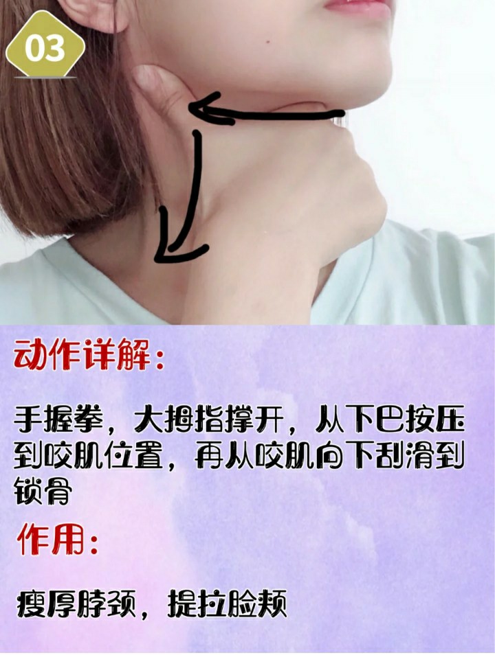 3.手握拳,大拇指撑开从下巴开始按压,一直按到咬肌位置,再从咬肌刮滑到锁骨处
