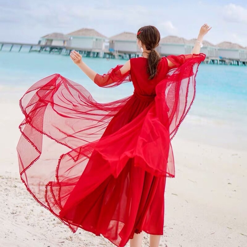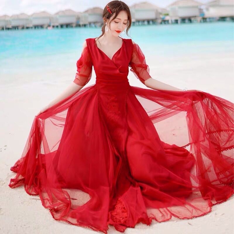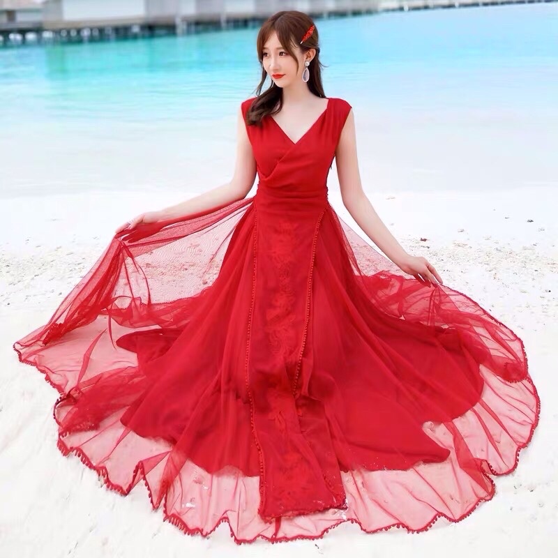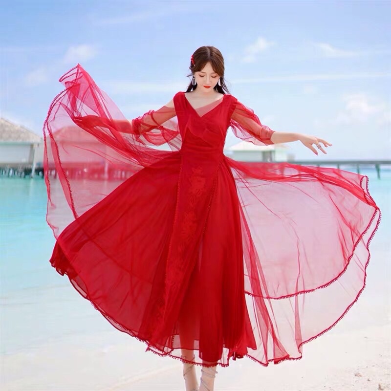 红色网纱刺绣连衣裙飘逸仙女大摆长裙
