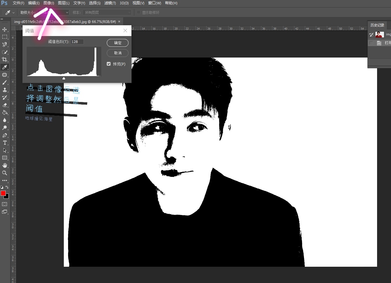 ③如p4点击图像后选择调整,再选择阈值
