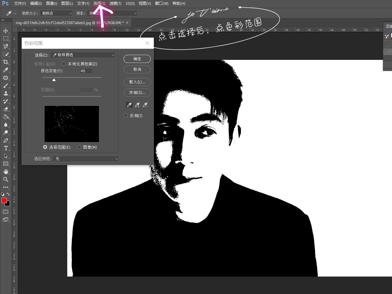 ⑤如p6点击选择,然后点击色彩范围,将光标在图片黑色区域吸色,之后ctrl+j🎊