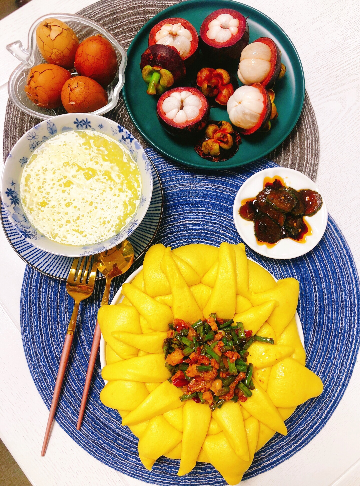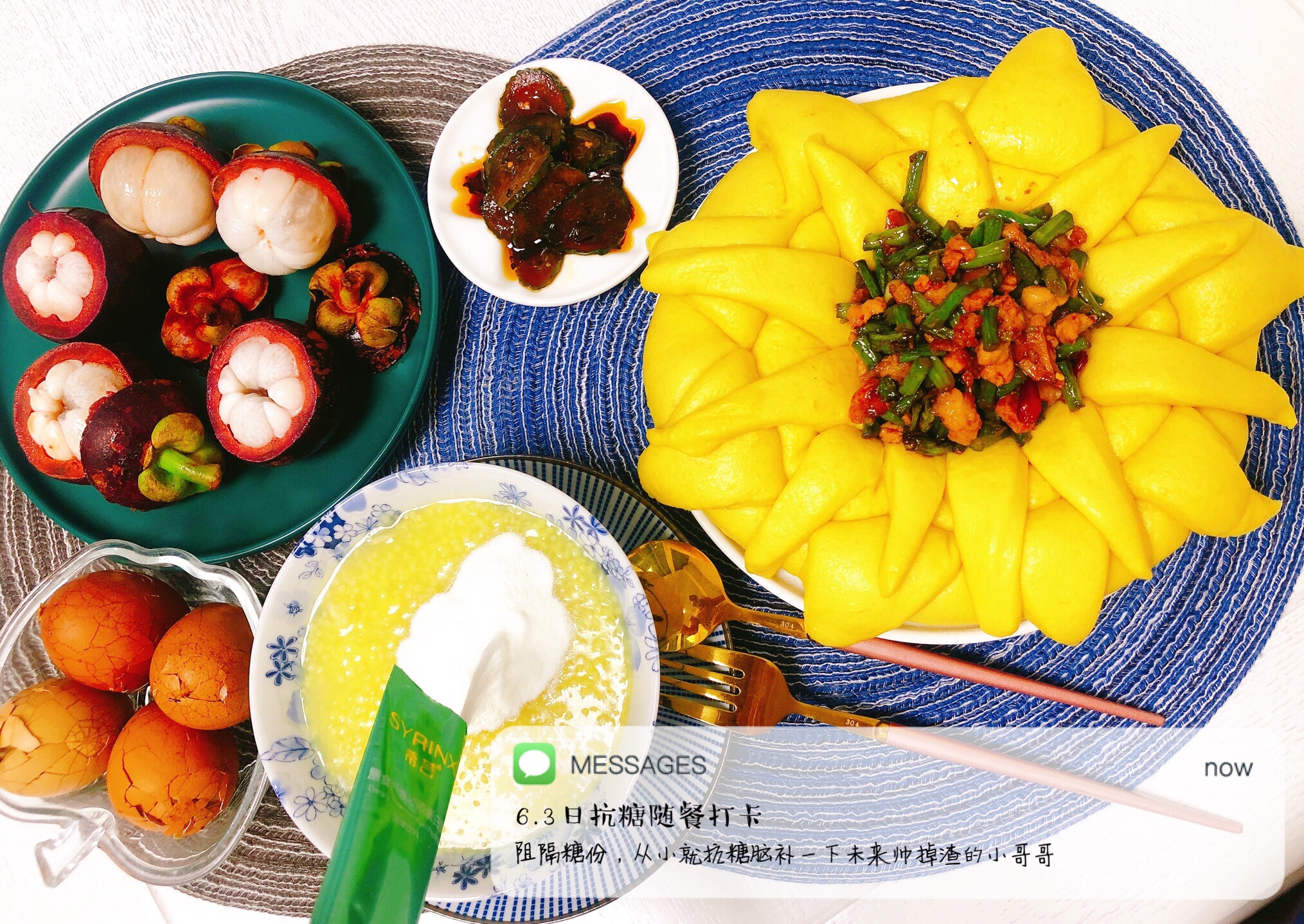 今日早餐:烈焰馒头酿豇豆炒肉丁,燕麦酸奶烤苹果片,小米粥,山竹,自制黄瓜小咸菜,茶蛋,抗糖一包随餐,脑补一下从小就抗糖的小哥哥会不会成为不老男神😍😍😍