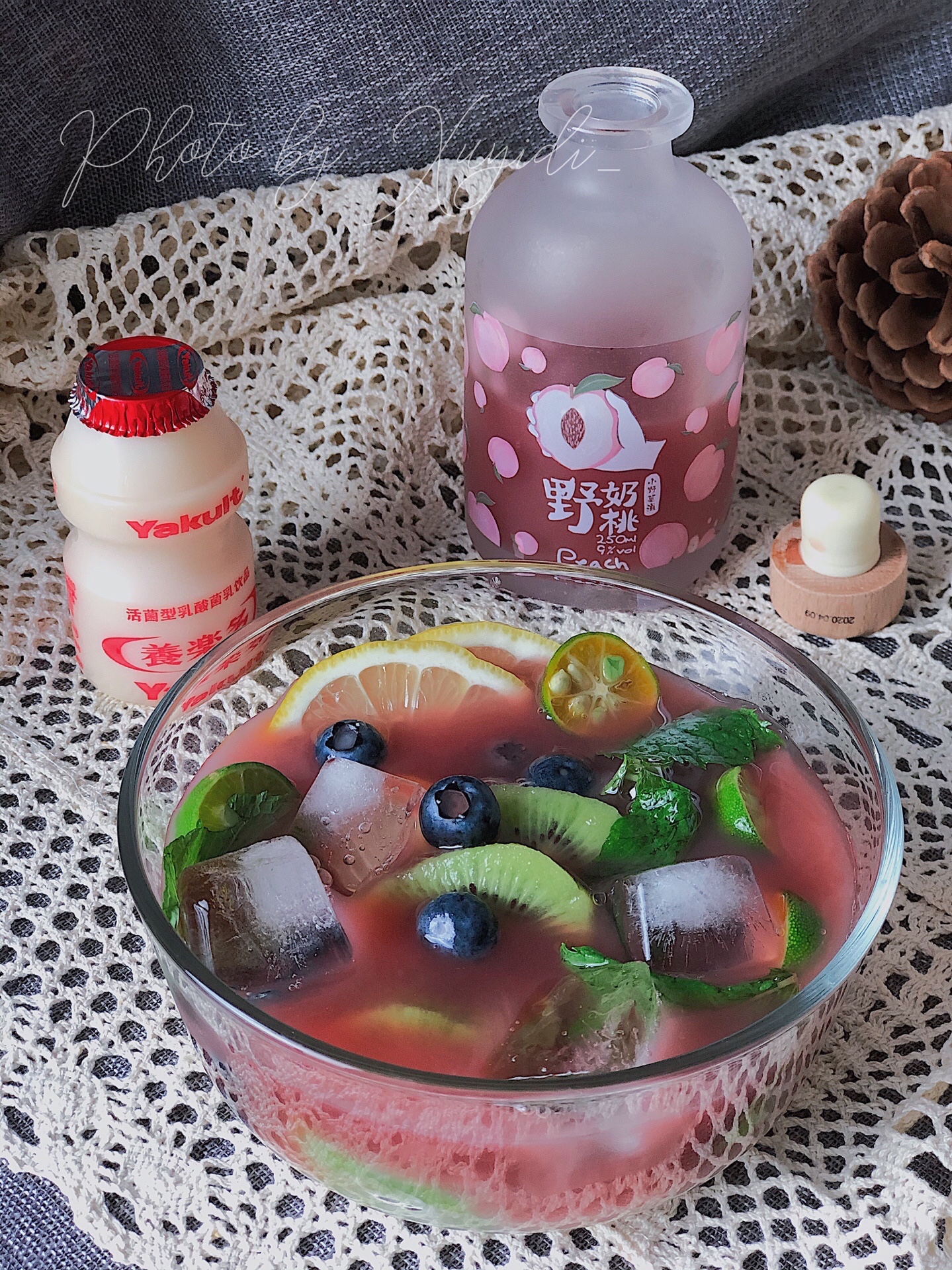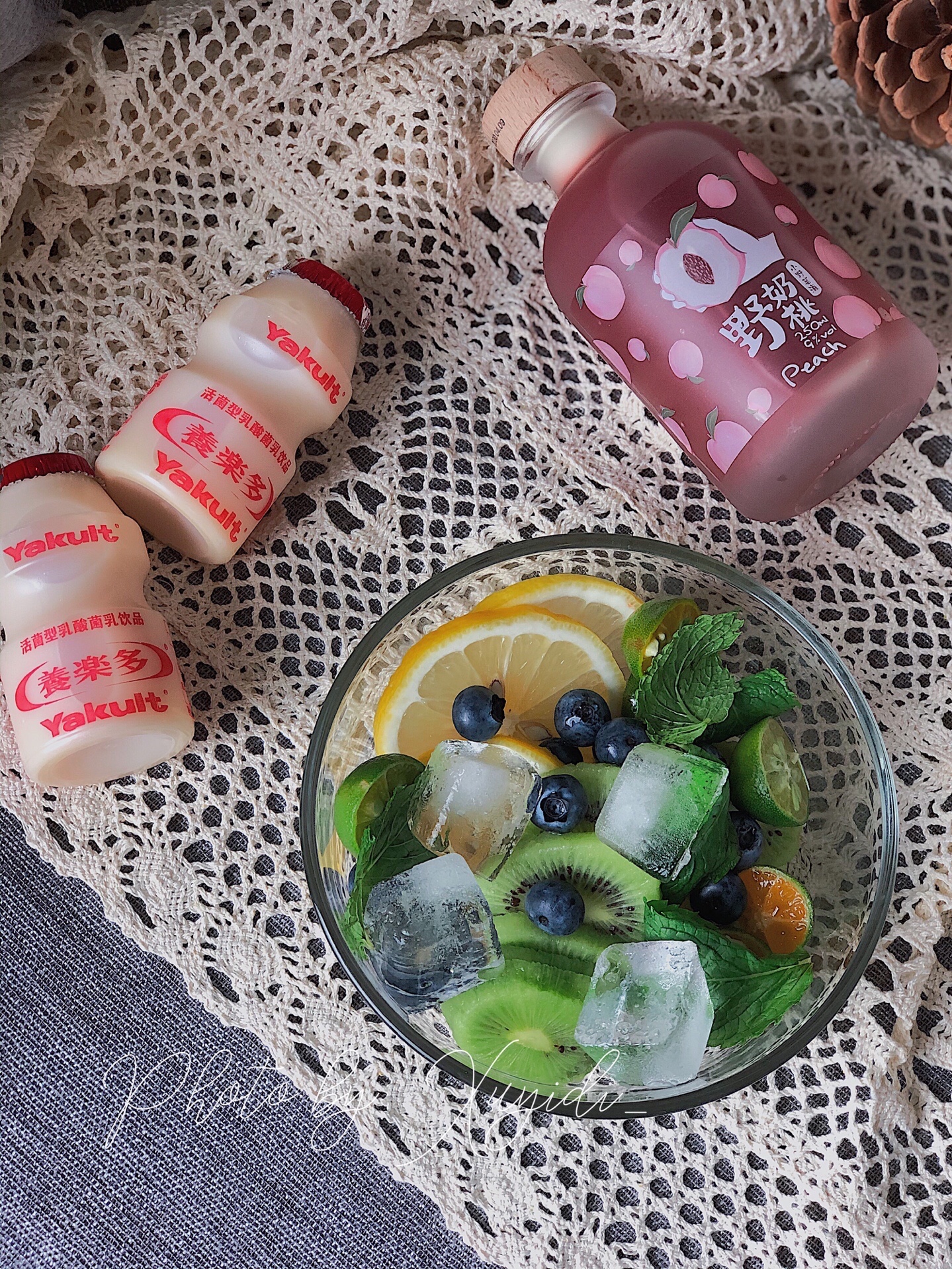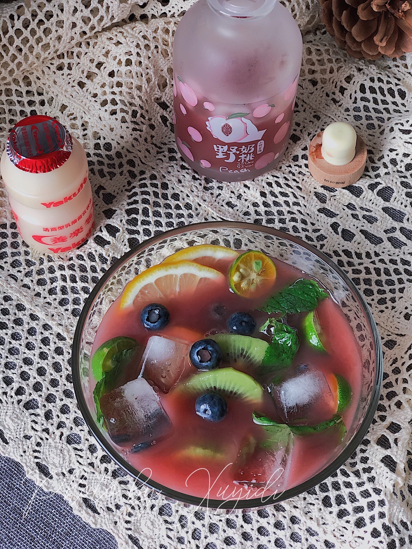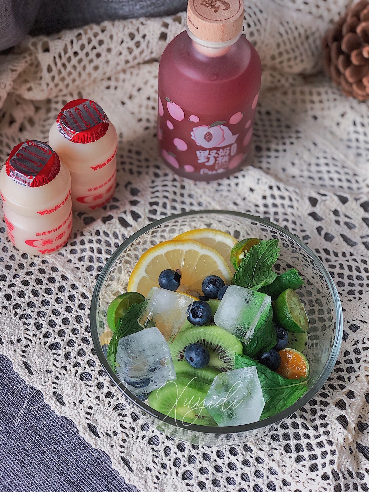 准备食材:荔枝、柠檬🍋、猕猴桃🥝、小青柠、蓝莓、薄荷叶、养乐多、野奶桃酒