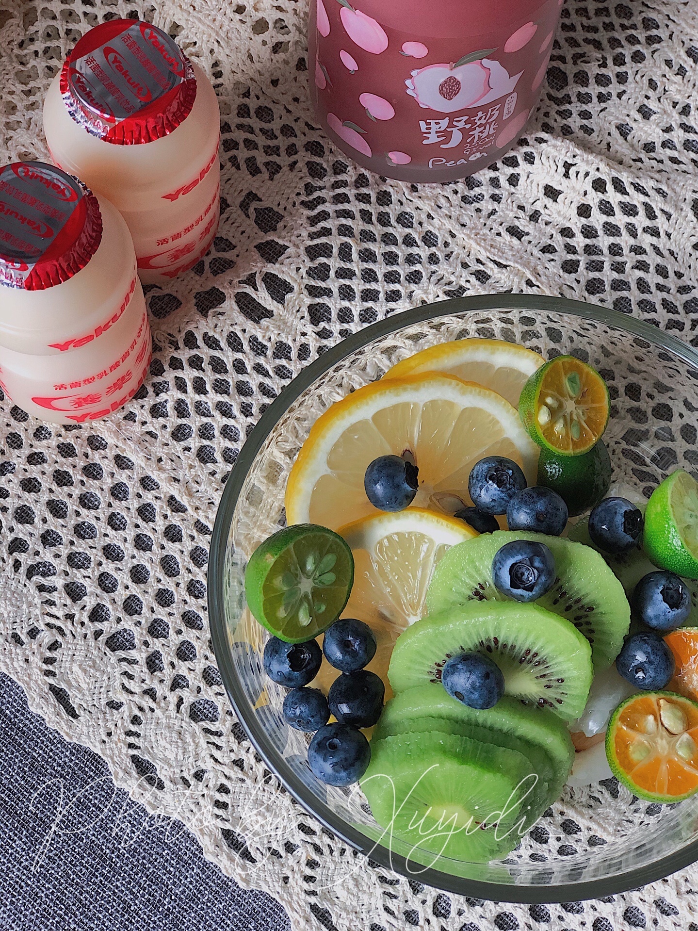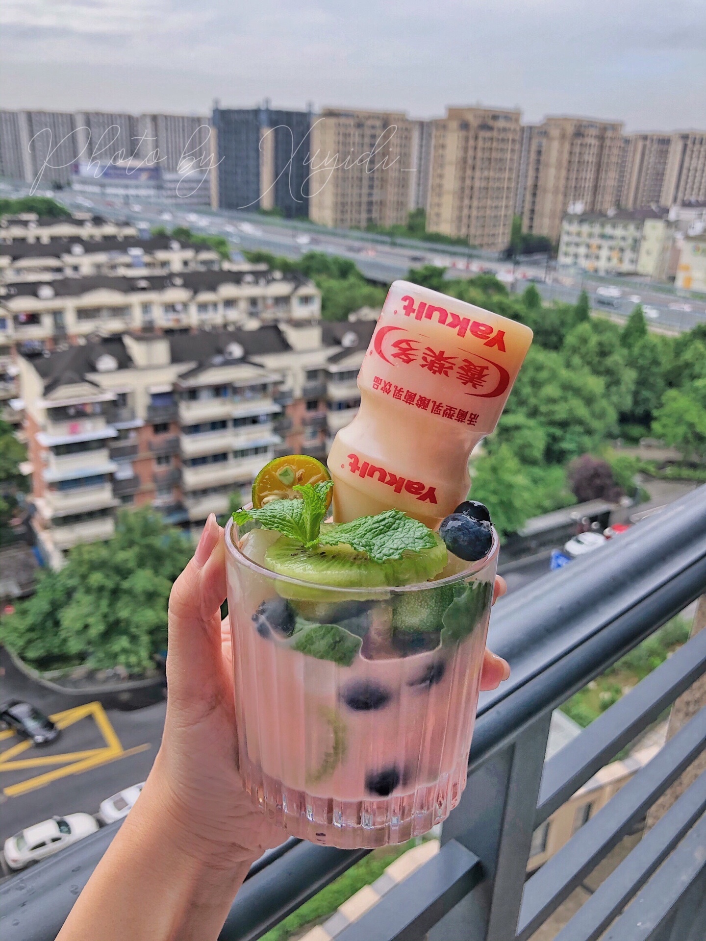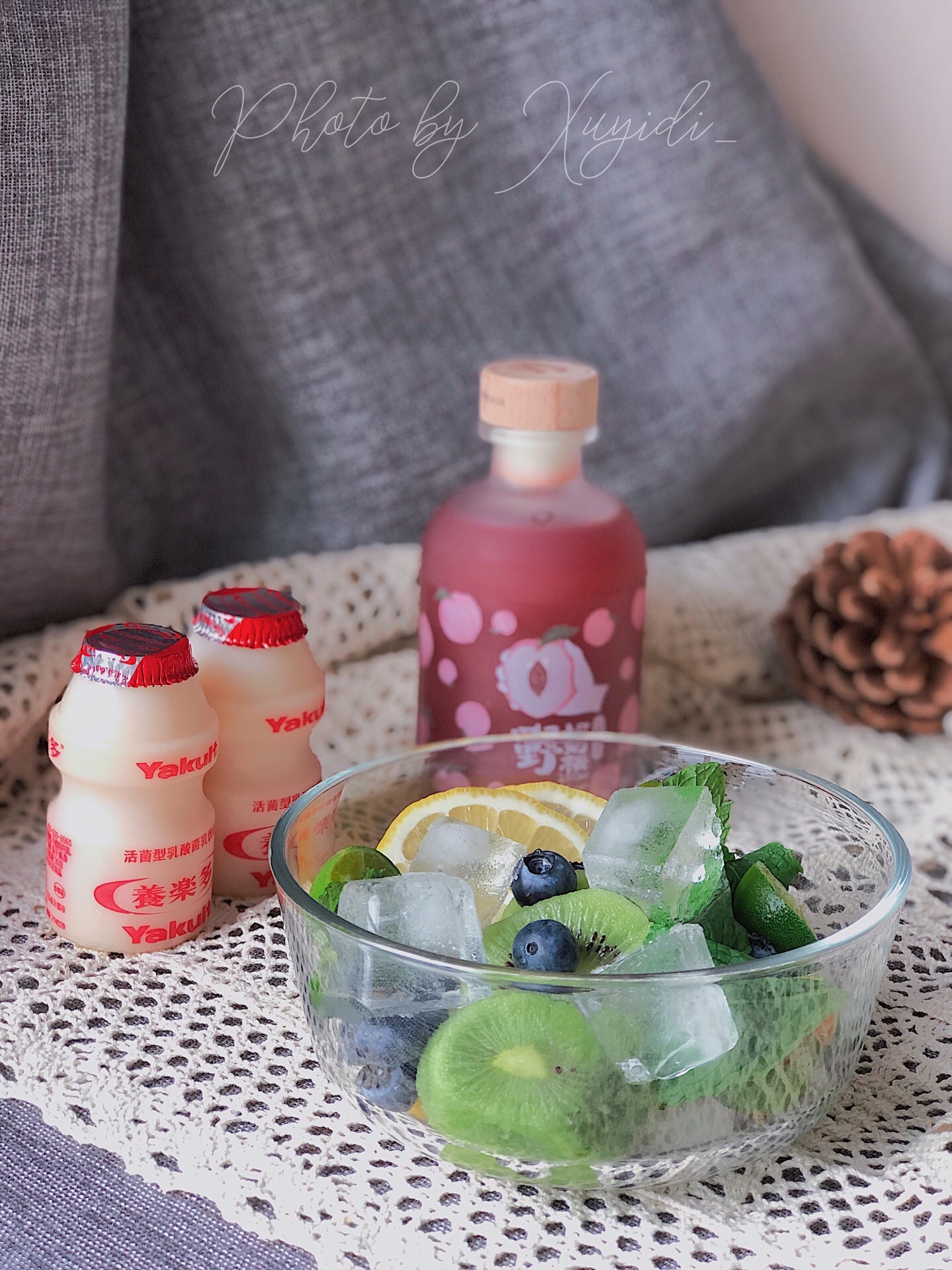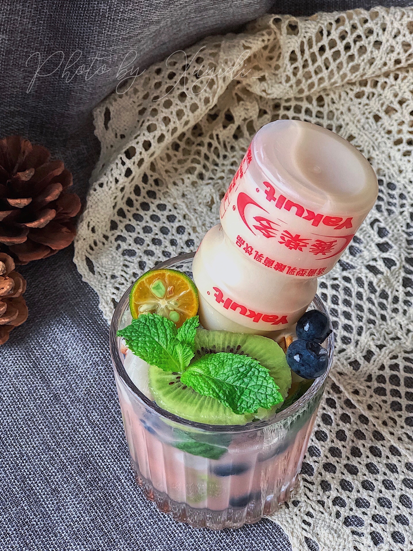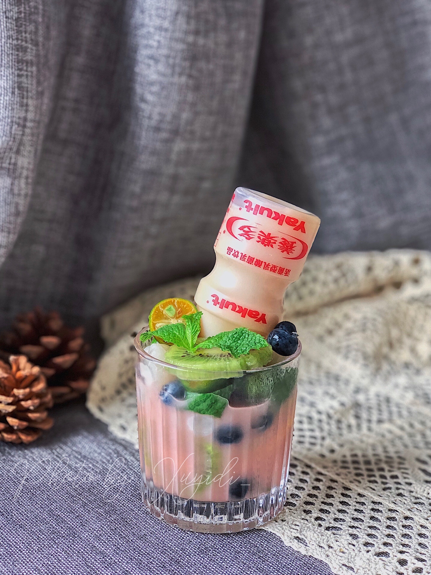 准备食材:荔枝、柠檬🍋、猕猴桃🥝、小青柠、蓝莓、薄荷叶、养乐多、野奶桃酒