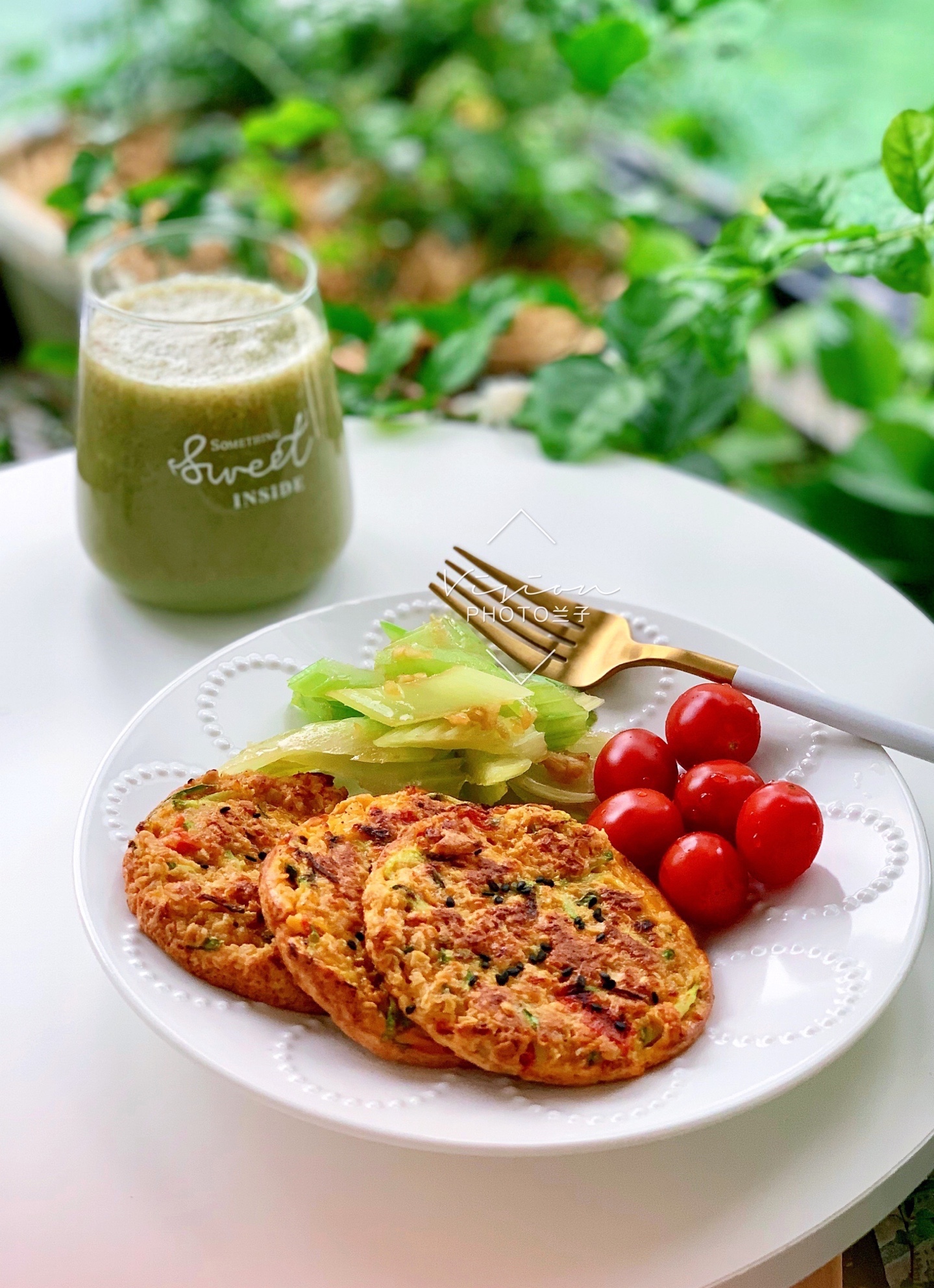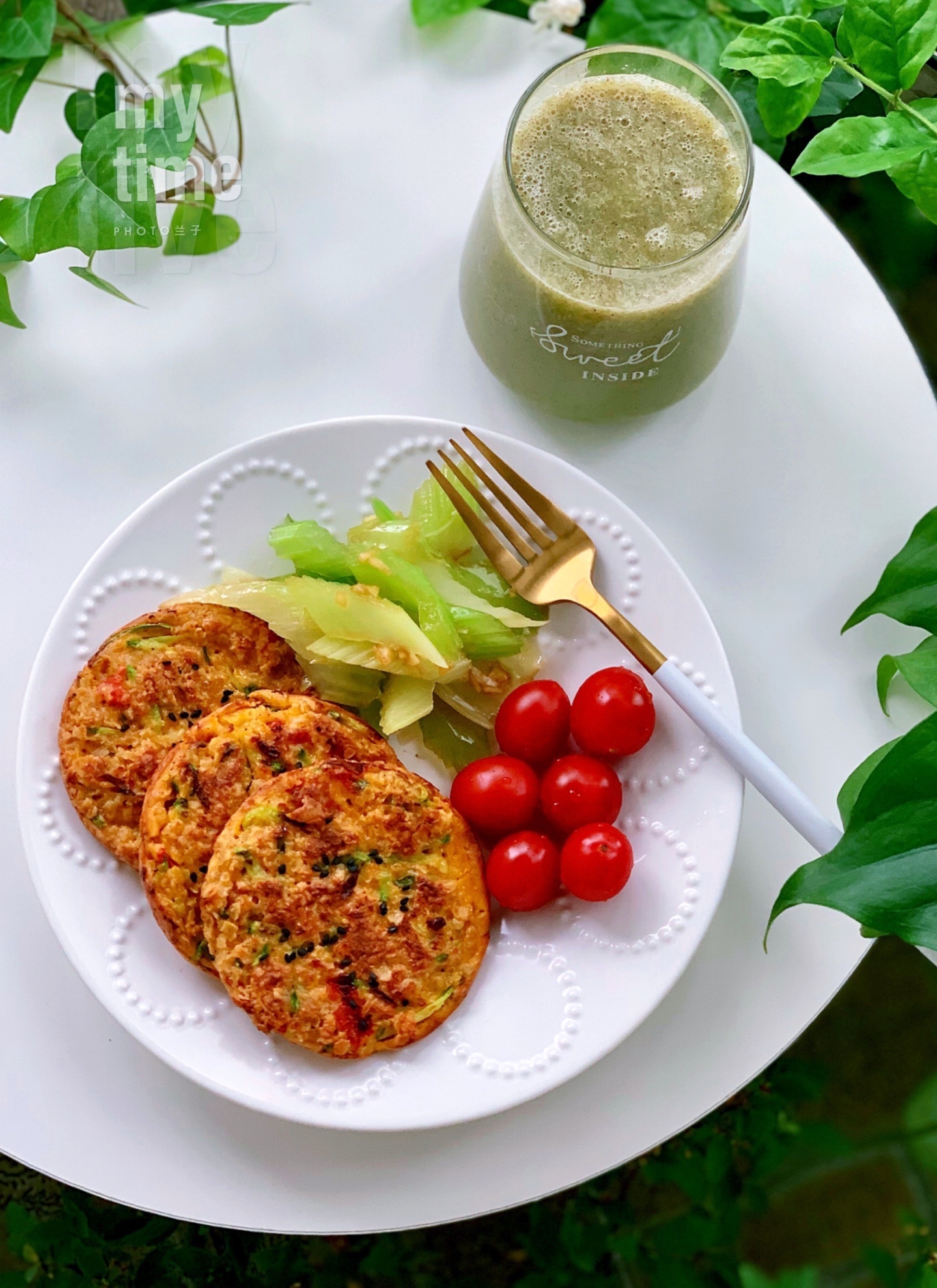 其他食材洗好切好,腌制的西葫芦也差不多了,把西葫芦里面的水份挤干,全部放入泡好的燕麦中,打两个鸡蛋,放少许盐拌匀就可以下锅煎了,煎至二面金黄就可以了,喜欢芝麻的可以撒点芝麻。简单又不失营养