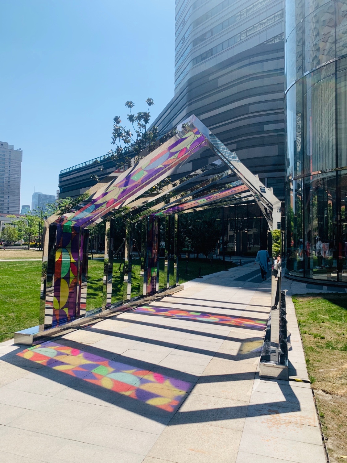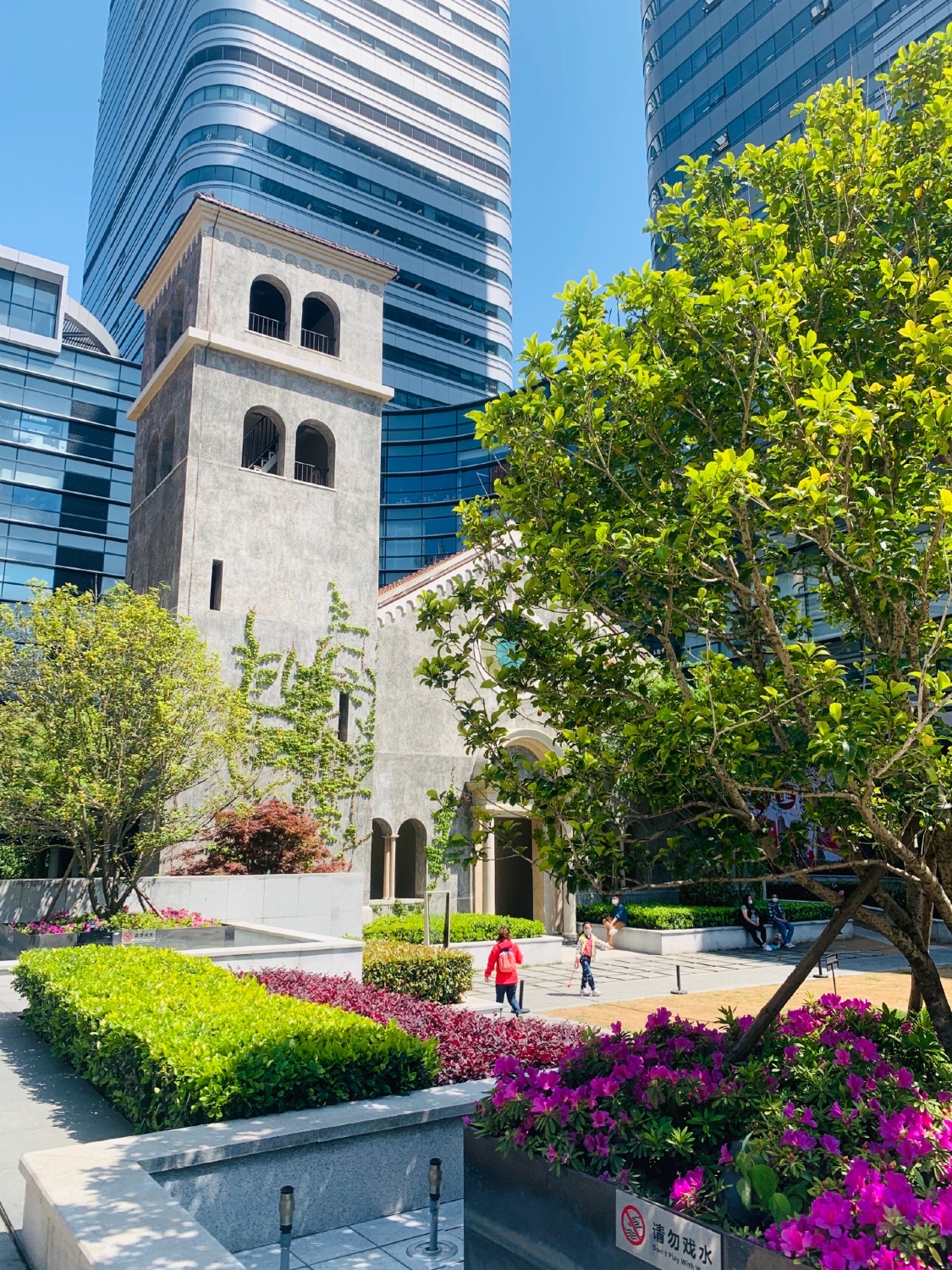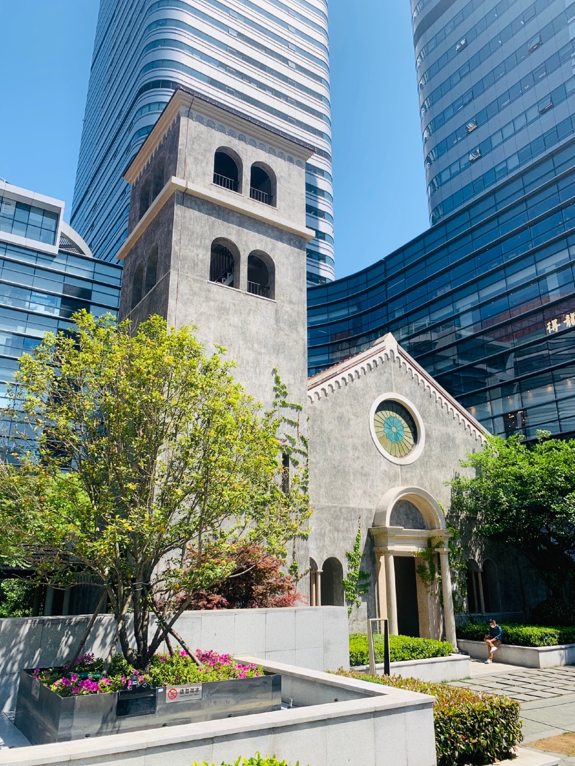 草坪、雕塑、钟楼穿插在现代玻璃建筑中