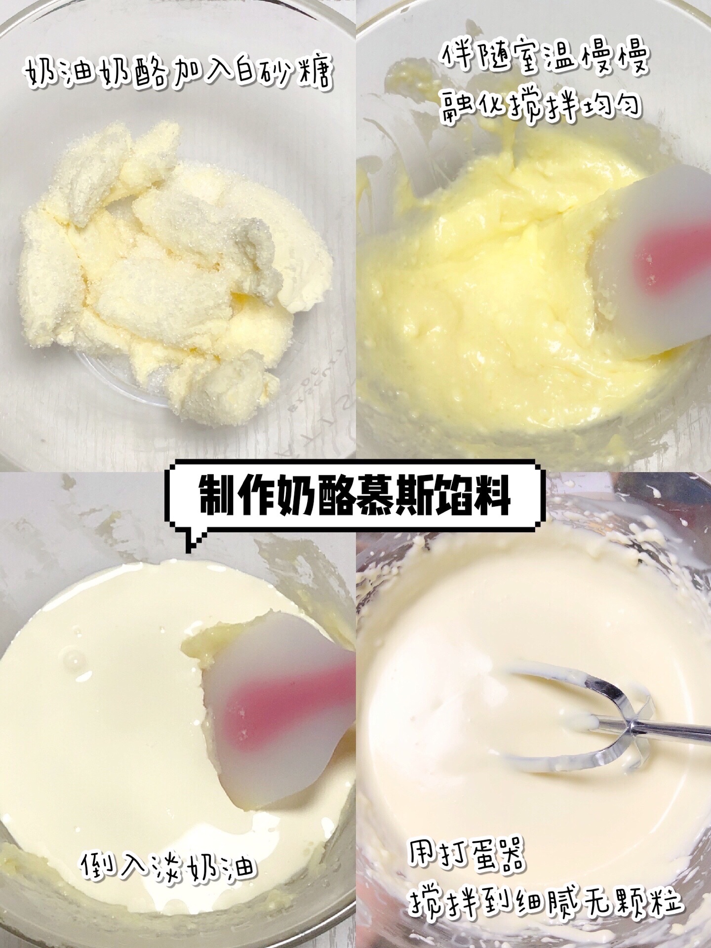 4️⃣奶油奶酪+糖+淡奶油一起搅拌均匀,倒入模具作为蛋糕的馅料