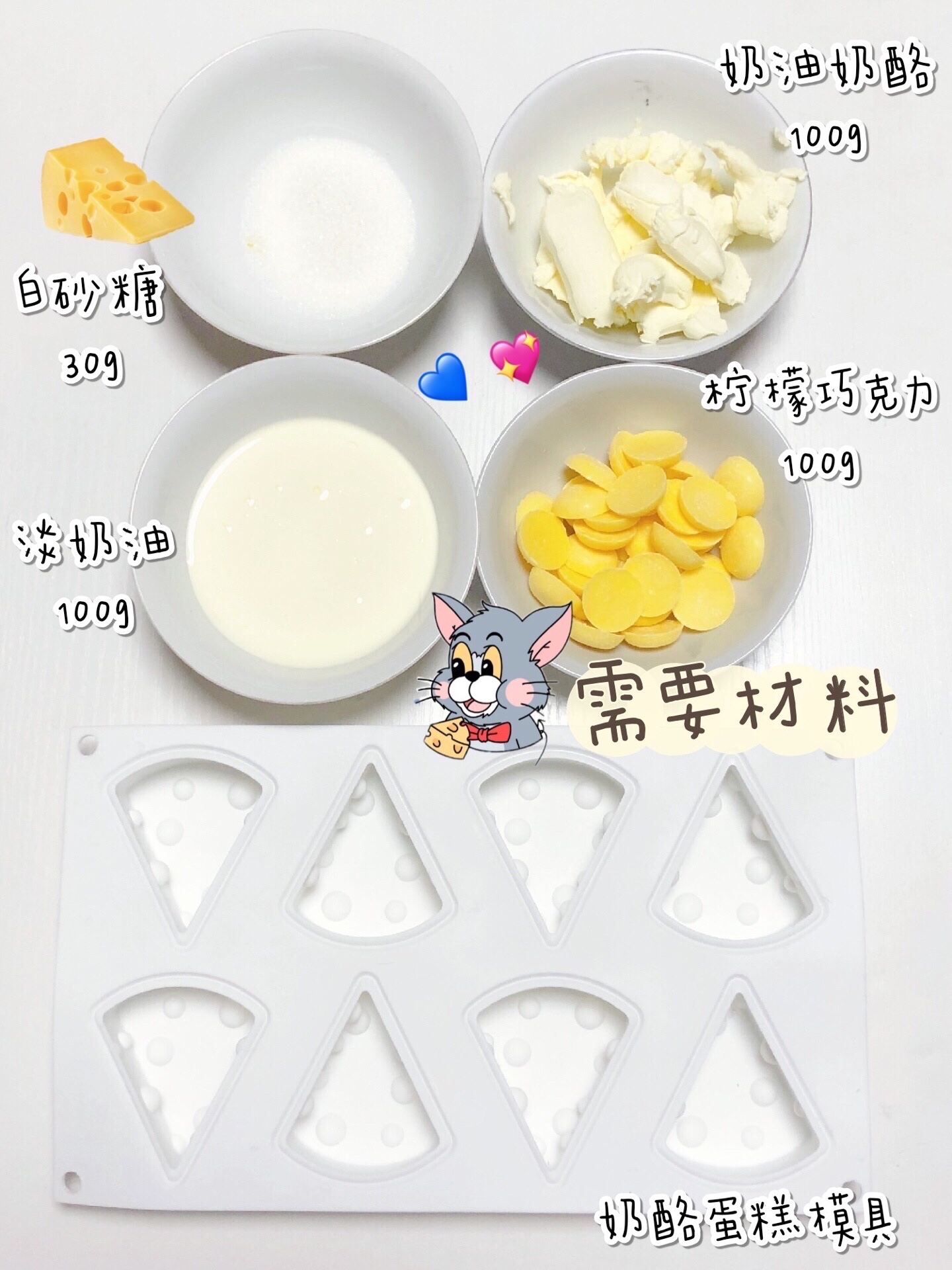 奶油奶酪100g、柠檬色巧克力100g、白砂糖30g、淡奶油100g、模具1盒