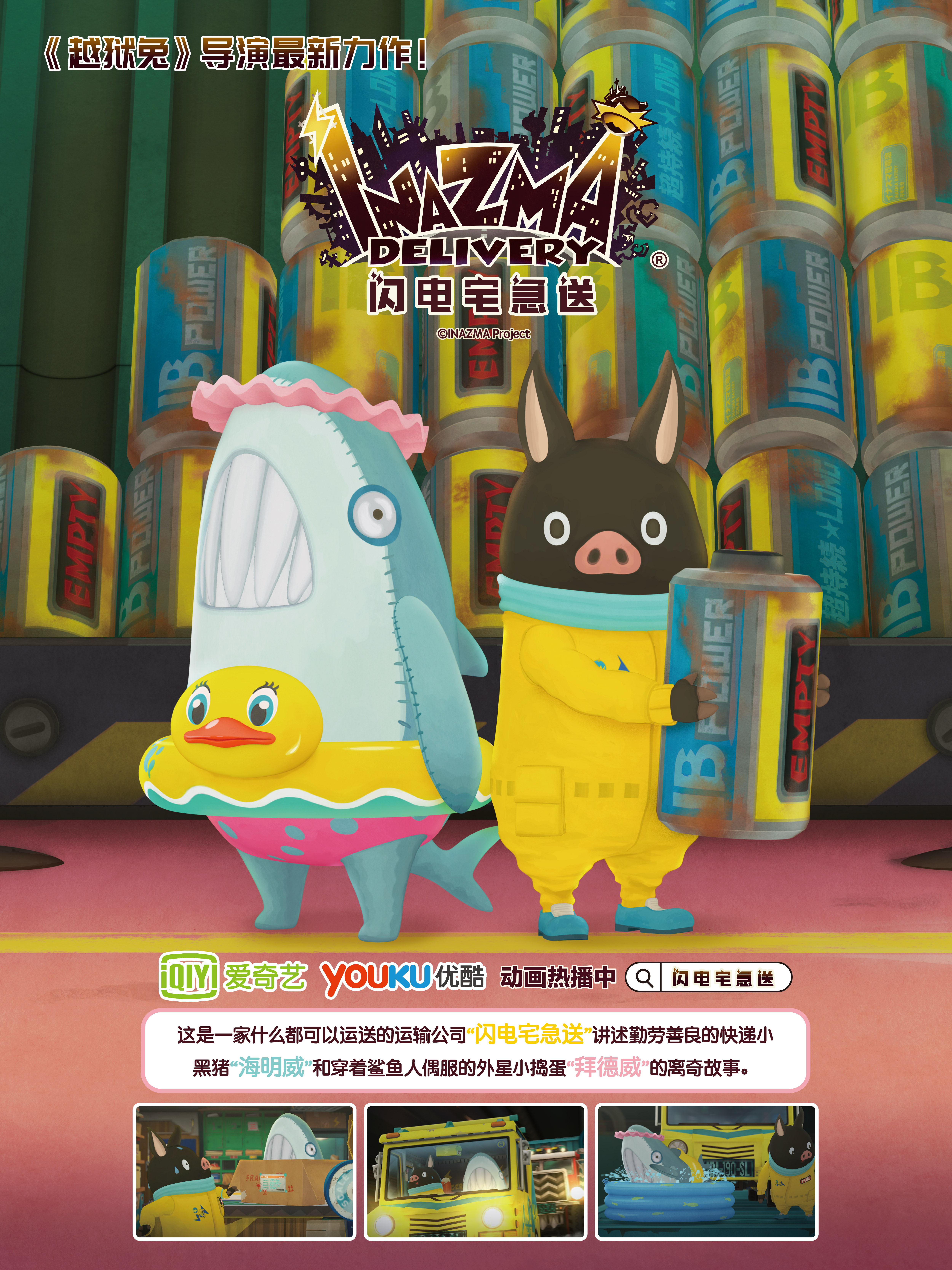 动画讲述了在全世界被排外的人所聚集的城市——巴比电市中有一家无论什么都能运送的运输公司“闪电宅急送”。某天,善良温和勤劳认真的好青年小黑猪“海明威”,遇上从快递箱中一跃而出,穿着鲨鱼人偶服的小捣蛋外星人“拜德威”,从此他们的魔性有爱的故事就此展开~动画于爱奇艺&优酷好评放送中~欢迎补番!