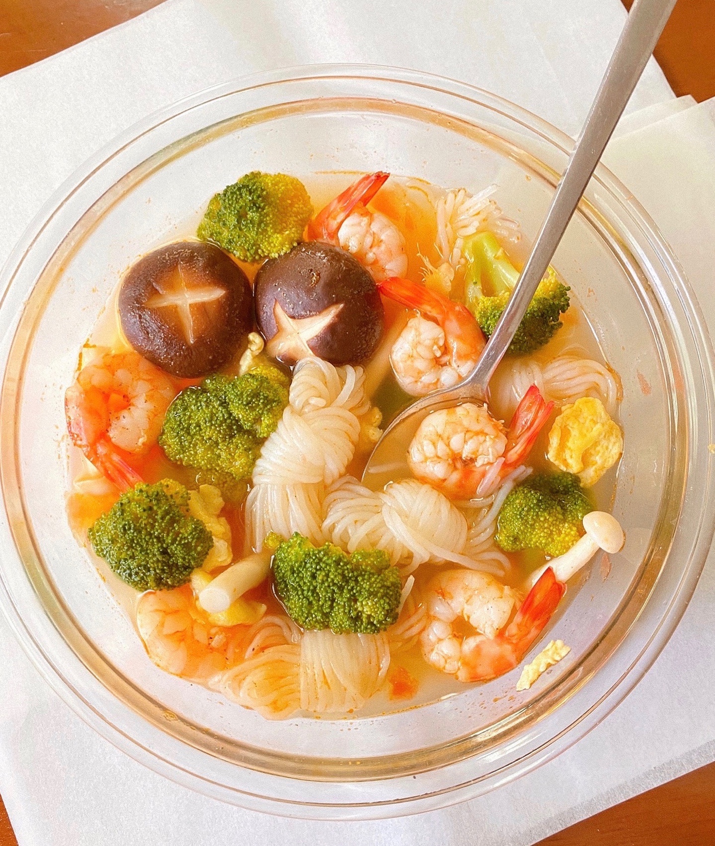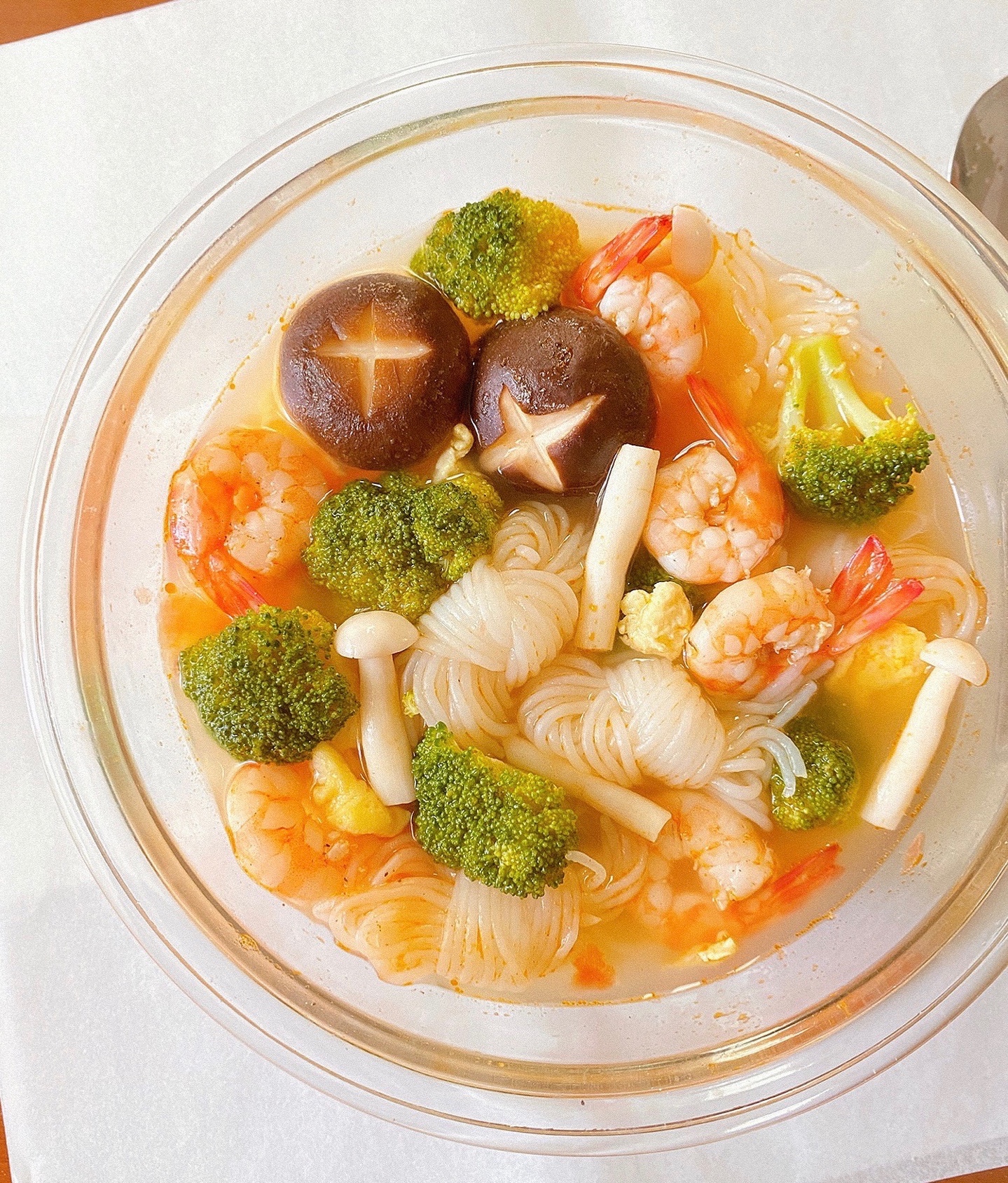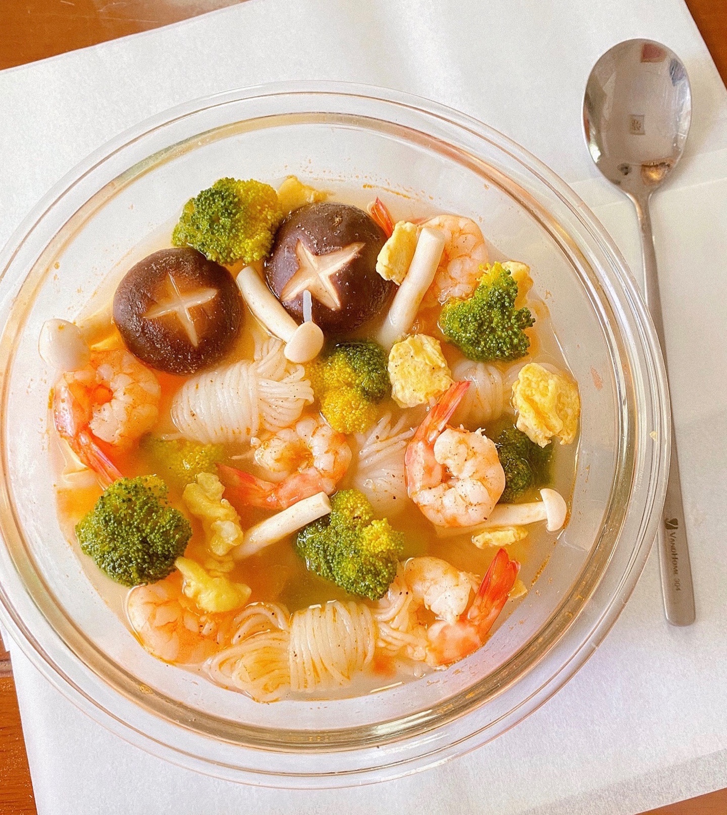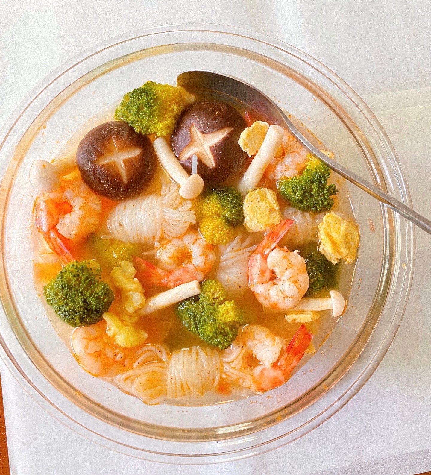 ▪️水开倒入西兰花,虾仁,魔芋丝,鸡蛋花,香菇蟹味菇,加盐,黑胡椒调味水开出锅即可