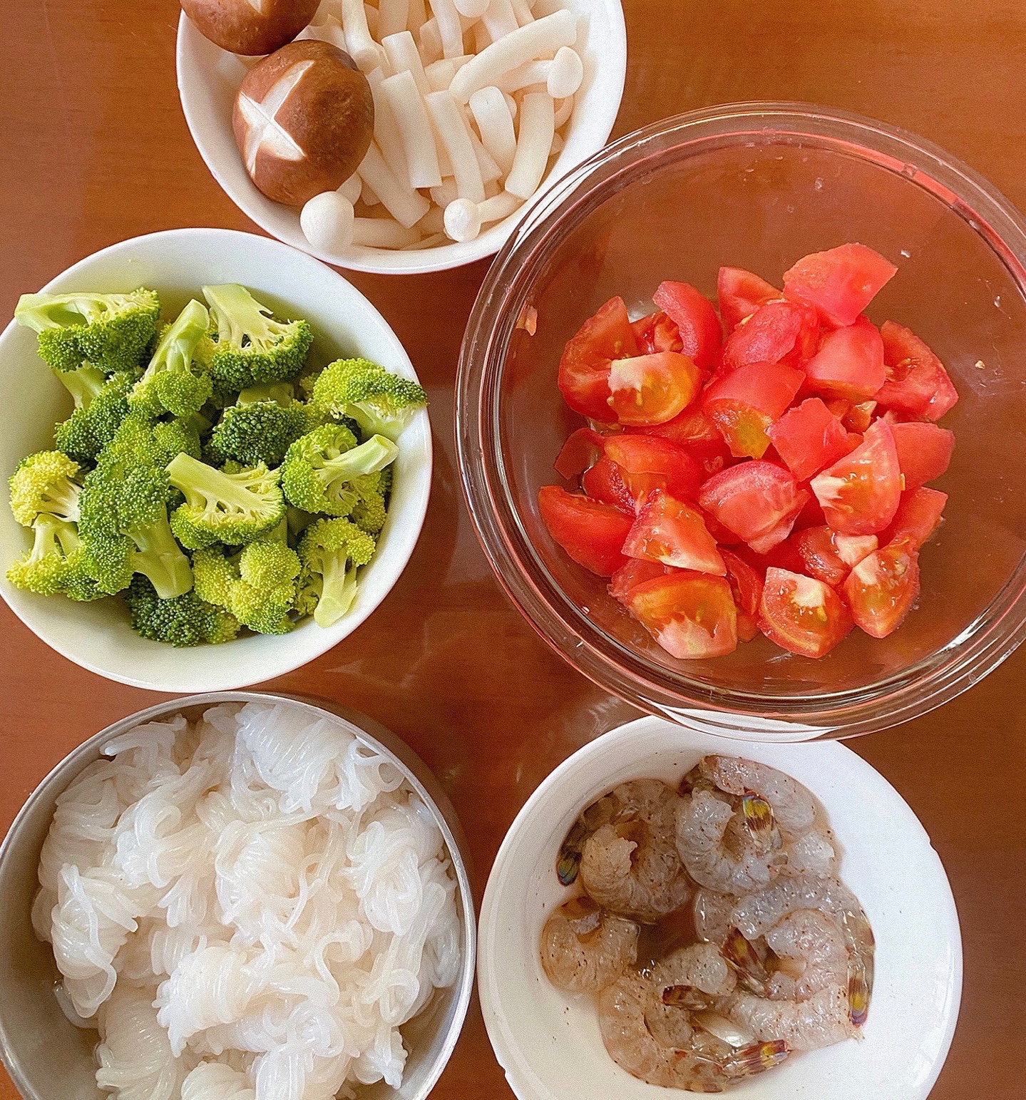🌟食材:魔芋丝,西兰花,虾仁,鸡蛋,番茄,蟹味菇,盐,黑胡椒,橄榄油