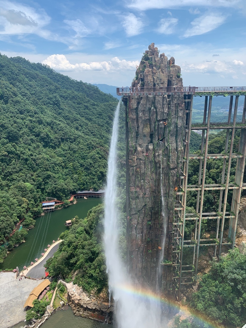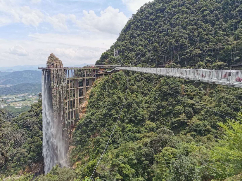 韶关市云门山玻璃桥,全场316,垂直高度168米,是广东落差最高的玻璃桥,在桥上一边走一边看瀑布和风景,真是桥上走,桥下全是风景啊~