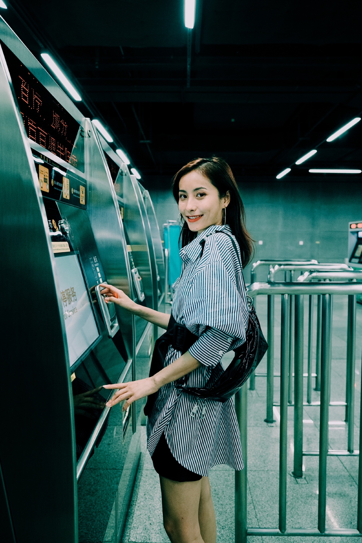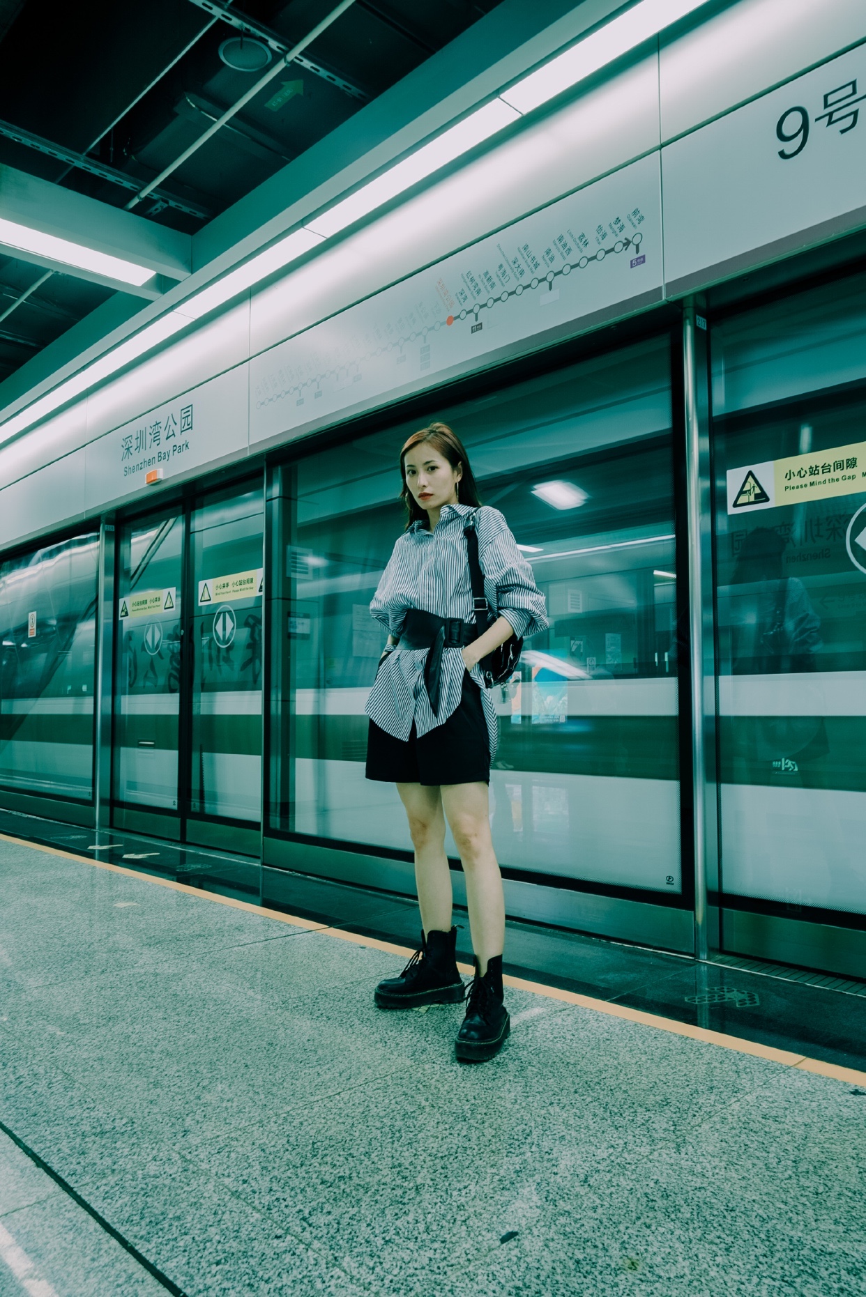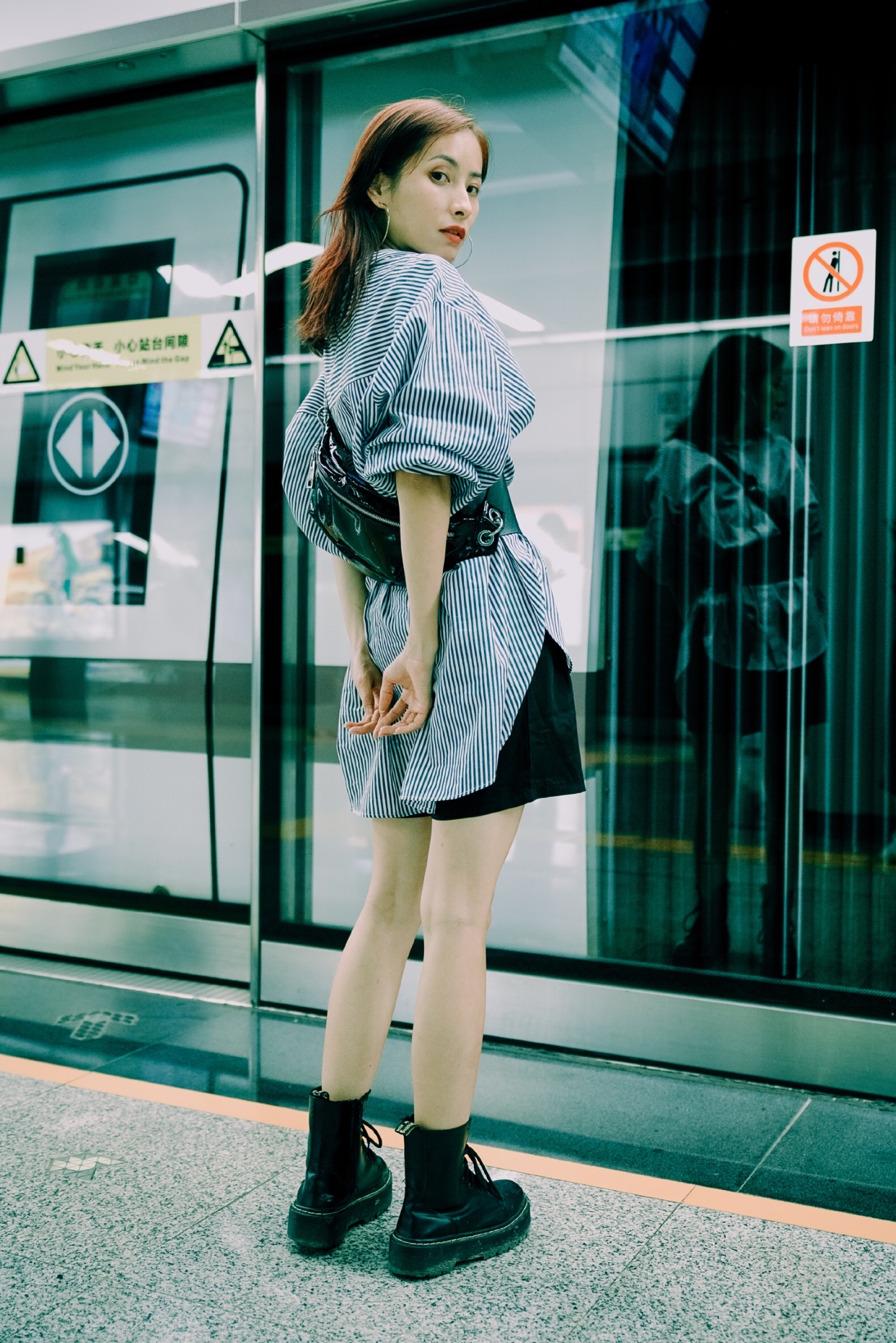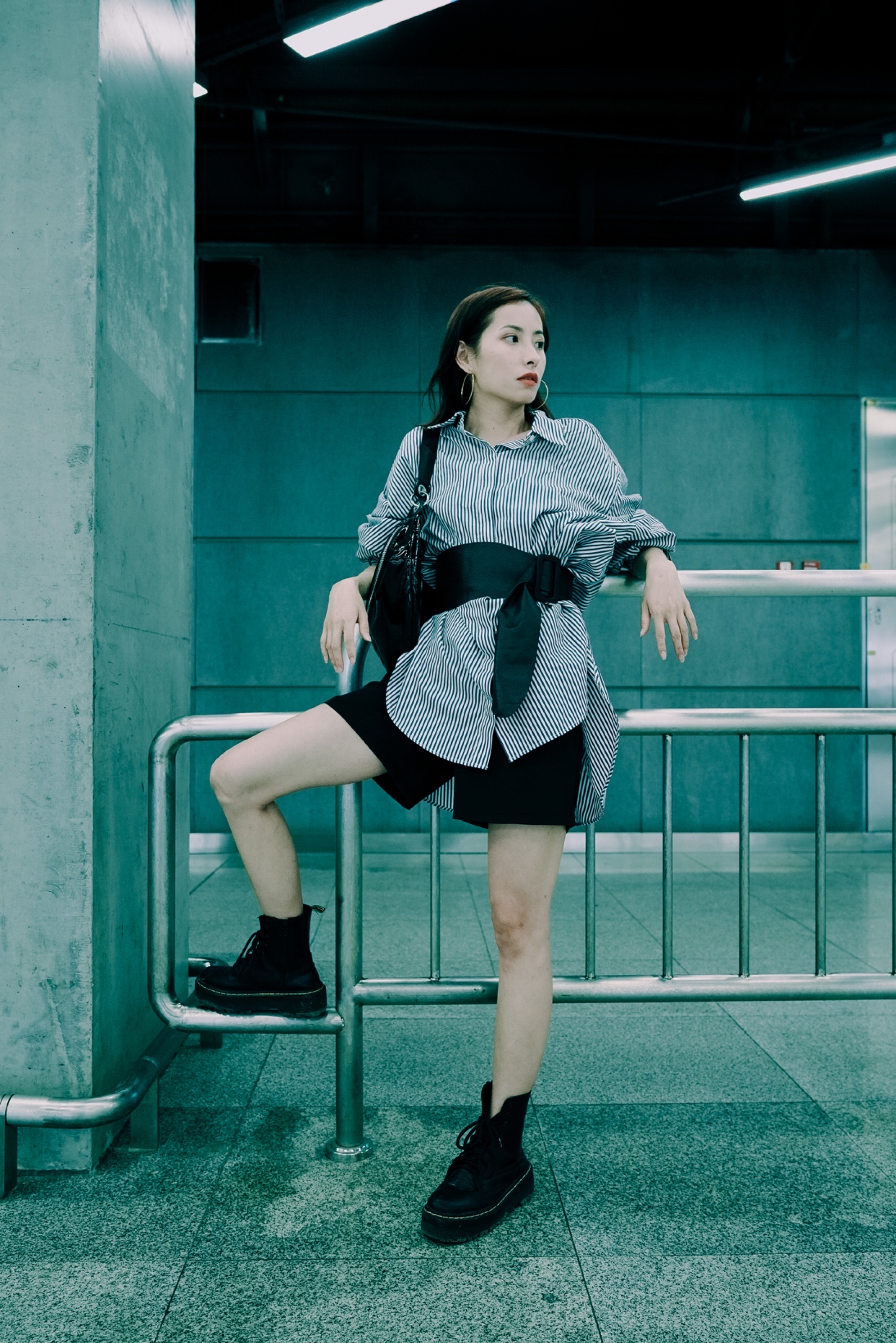 图5⃣️ 在地铁里面的栏杆上 ,双手靠栏杆 一只脚放放栏杆上 ,拍侧脸