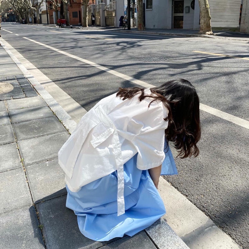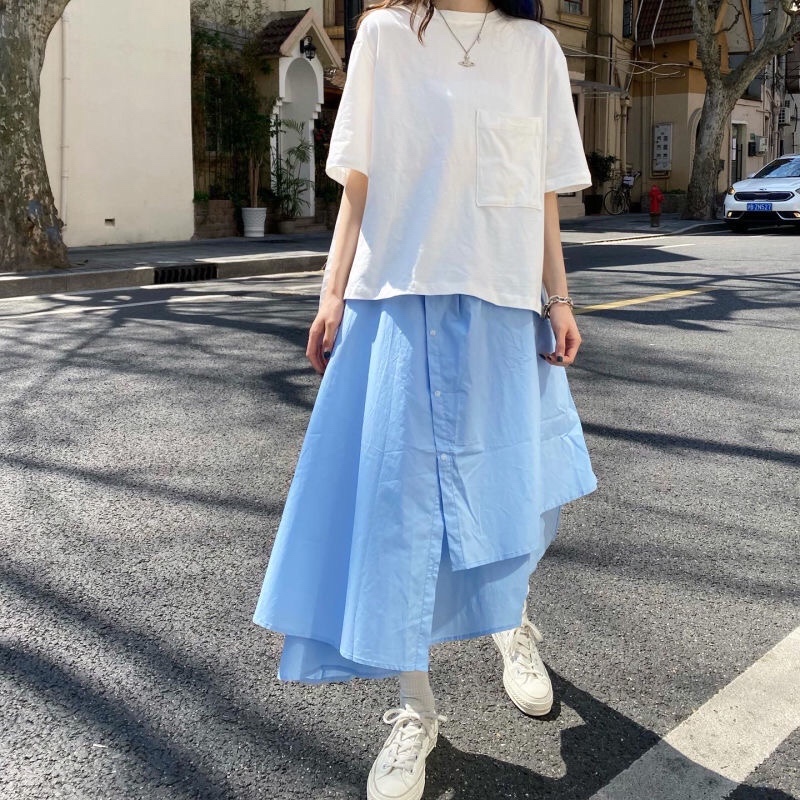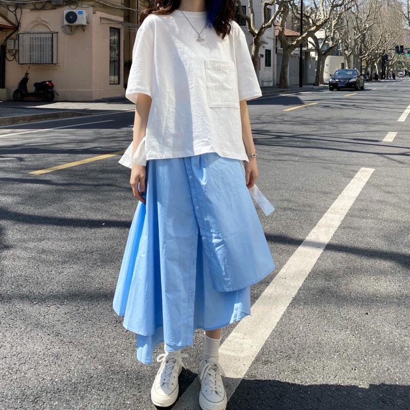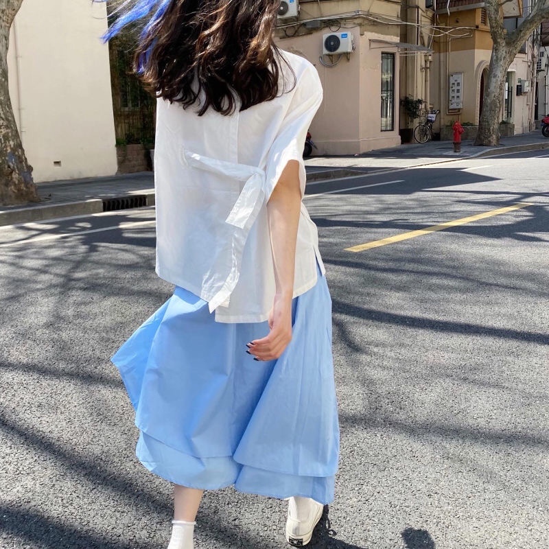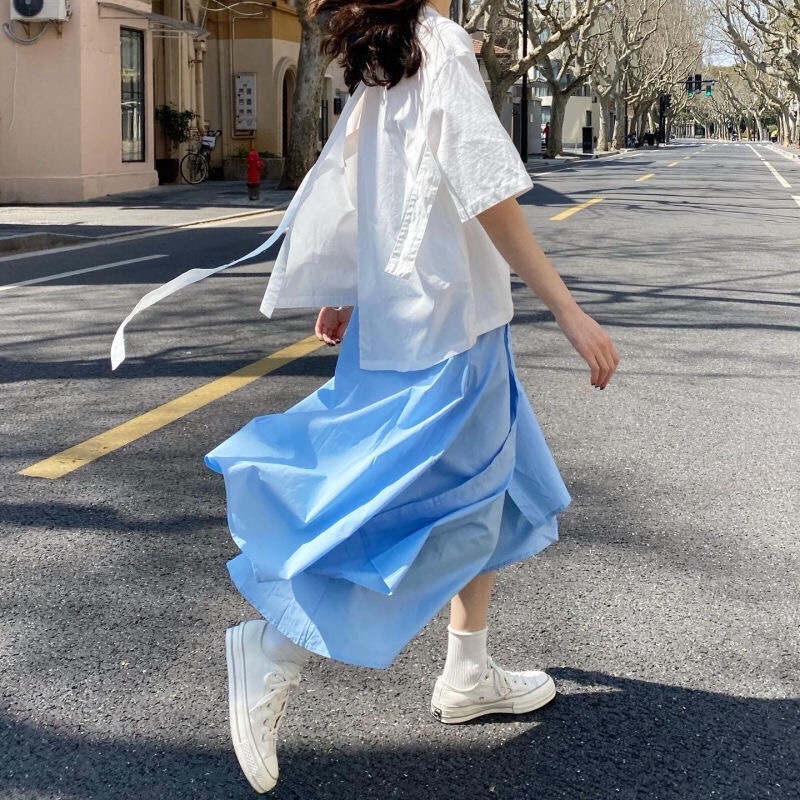 设计感上衣搭配水蓝裙子