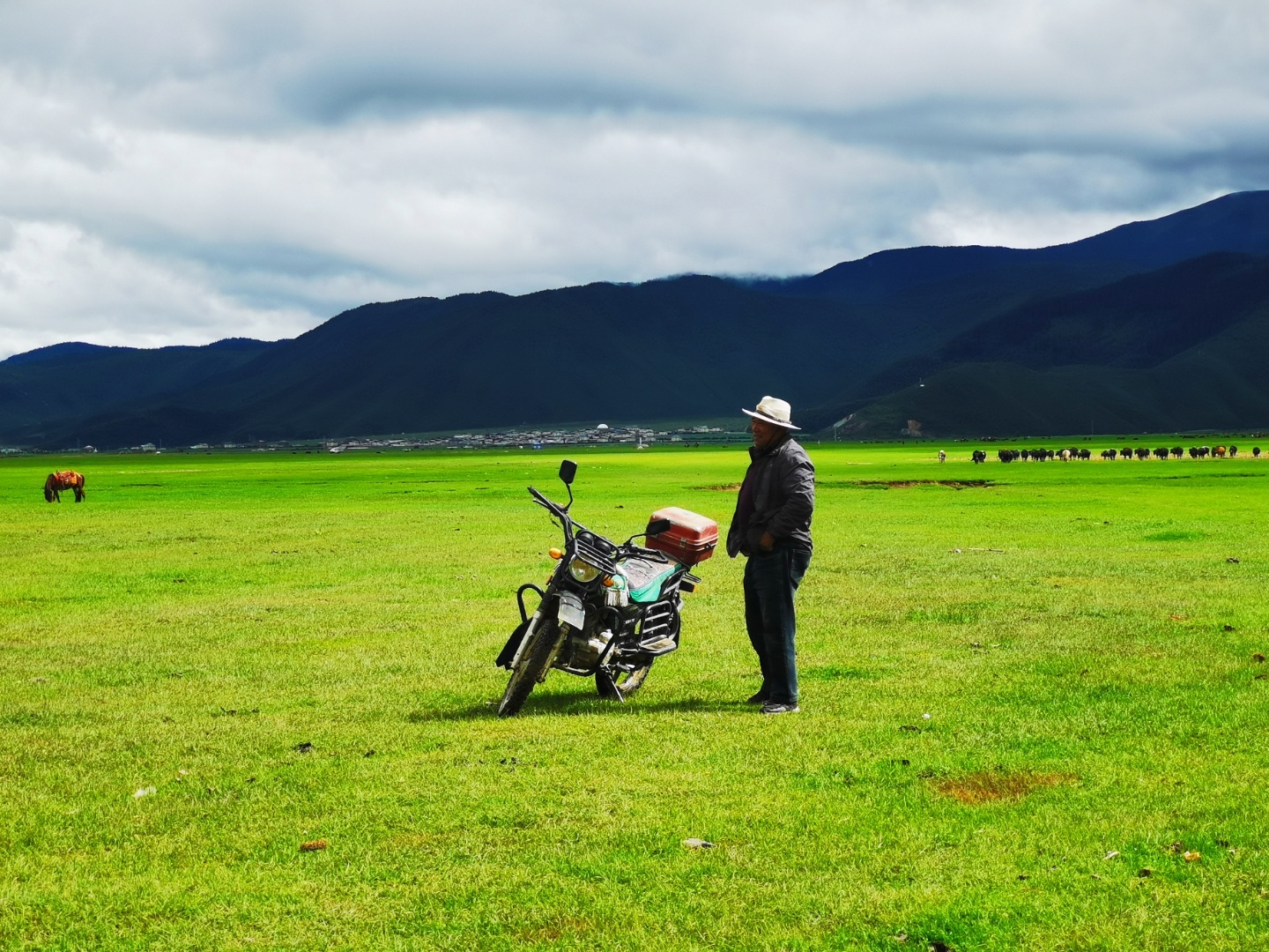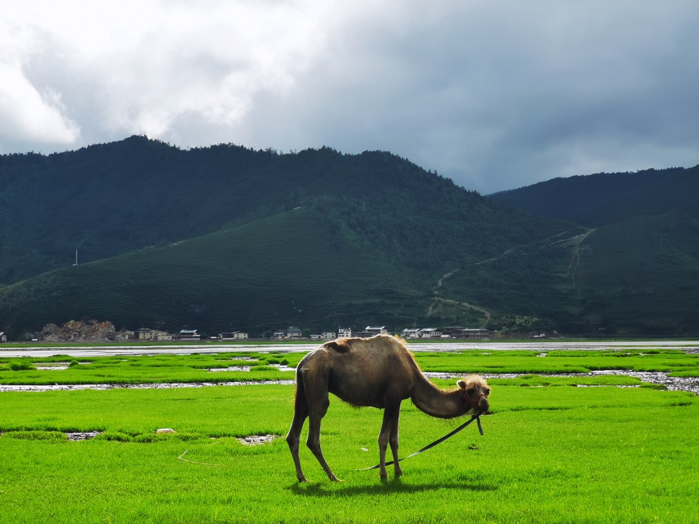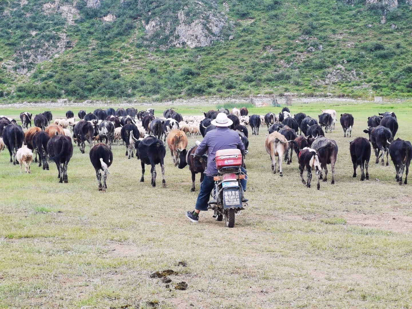 一个牧人,骑着摩托车,赶着一群牛羊。一只骆驼,在纳帕海前,孤单地吃草。
