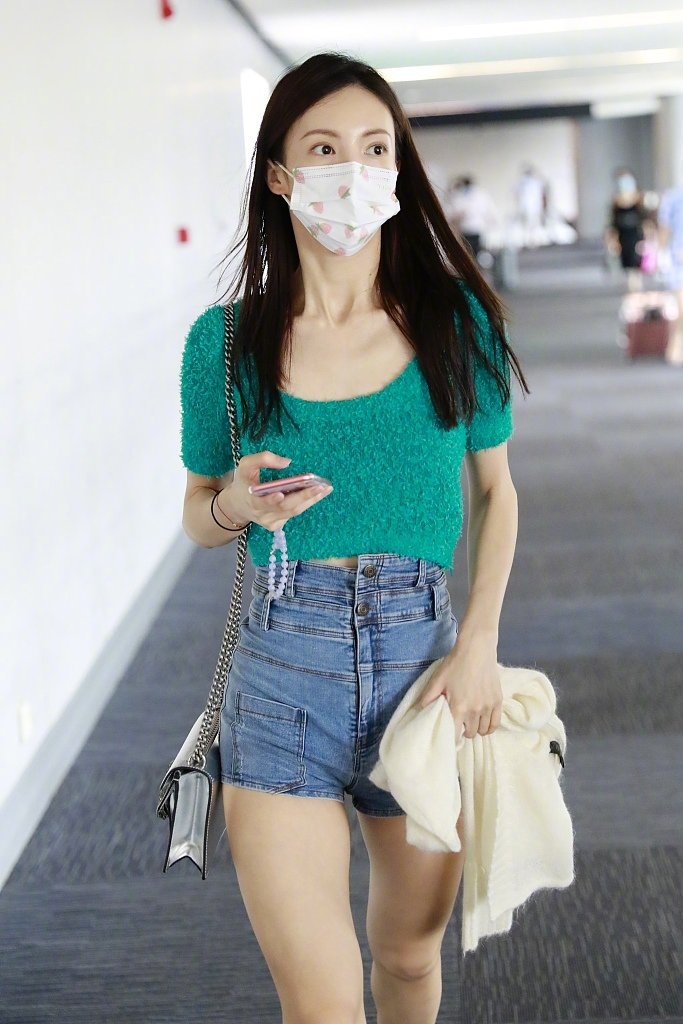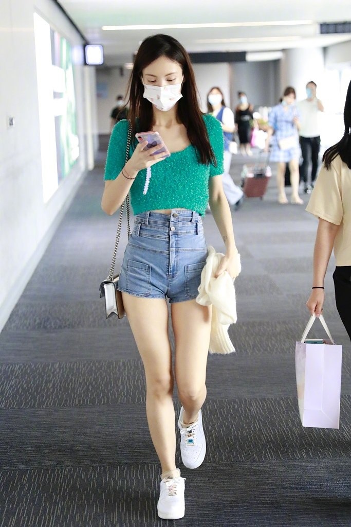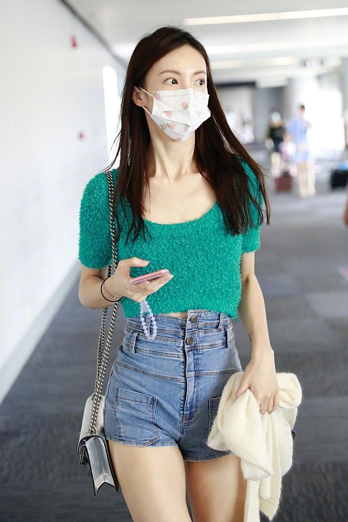 浪姐金晨现身机场,绿色露脐装搭配小短裤,[酸]身材太好了8~
