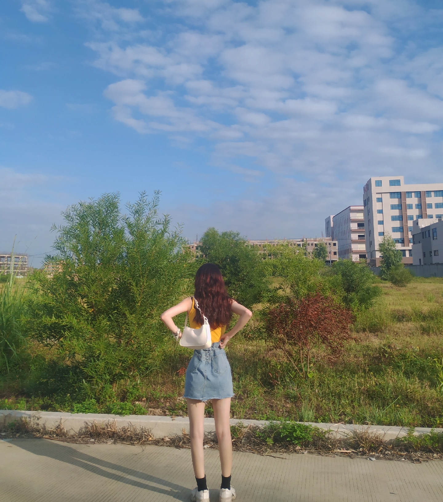 上面搭配一件黄色小吊带下半身搭配一件浅蓝色绑带牛仔短裙,穿起-美图社区-美图秀秀