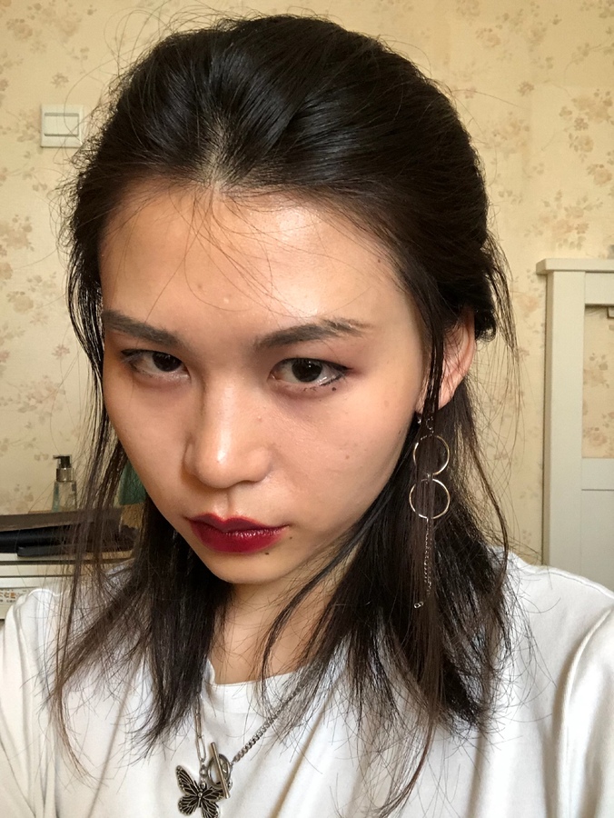 第一张妆容特点:全包眼线、砍眉、酷拽口红颜色、无腮红修容、眼角点痣、眼下阴影、修容当眼影