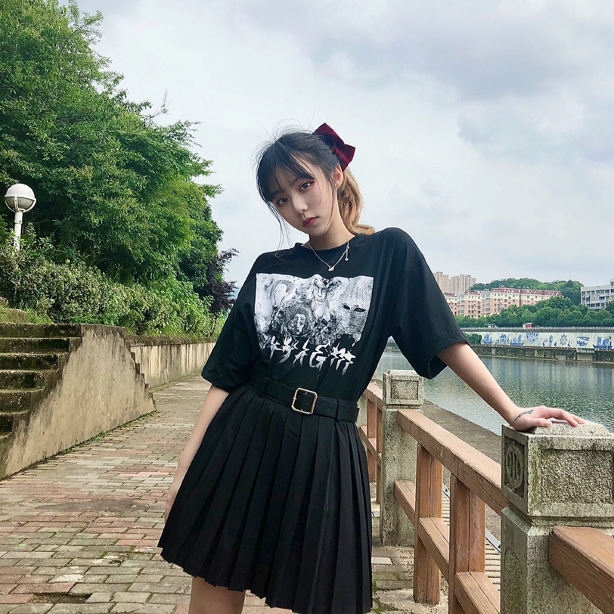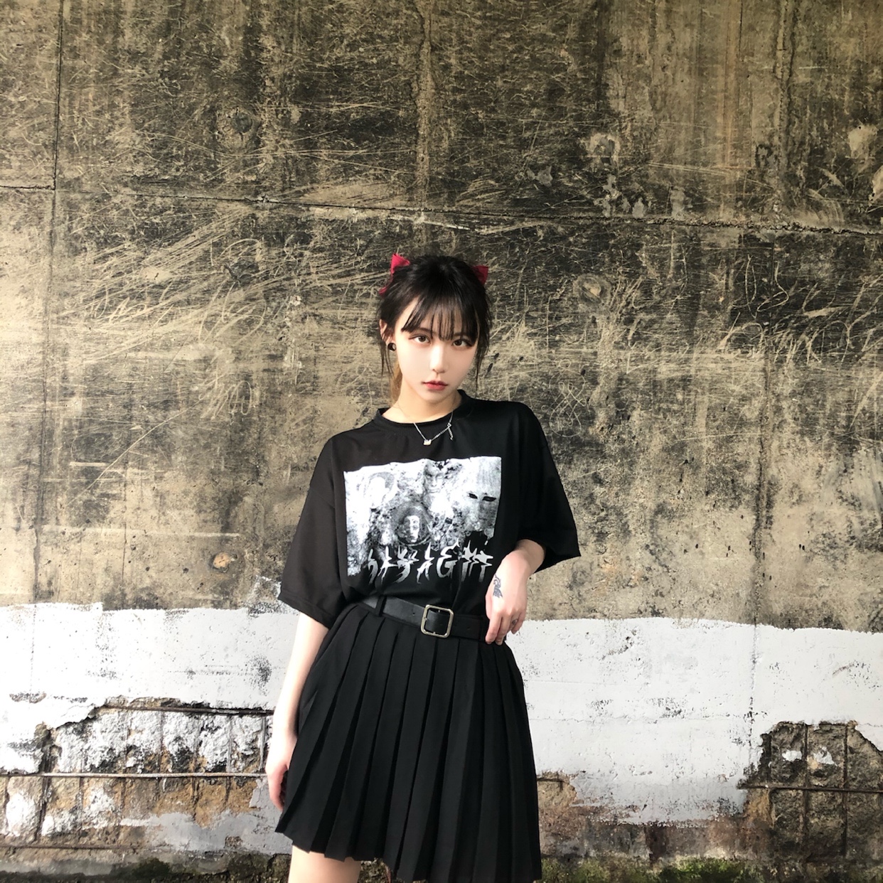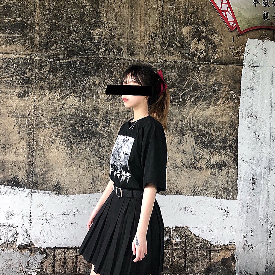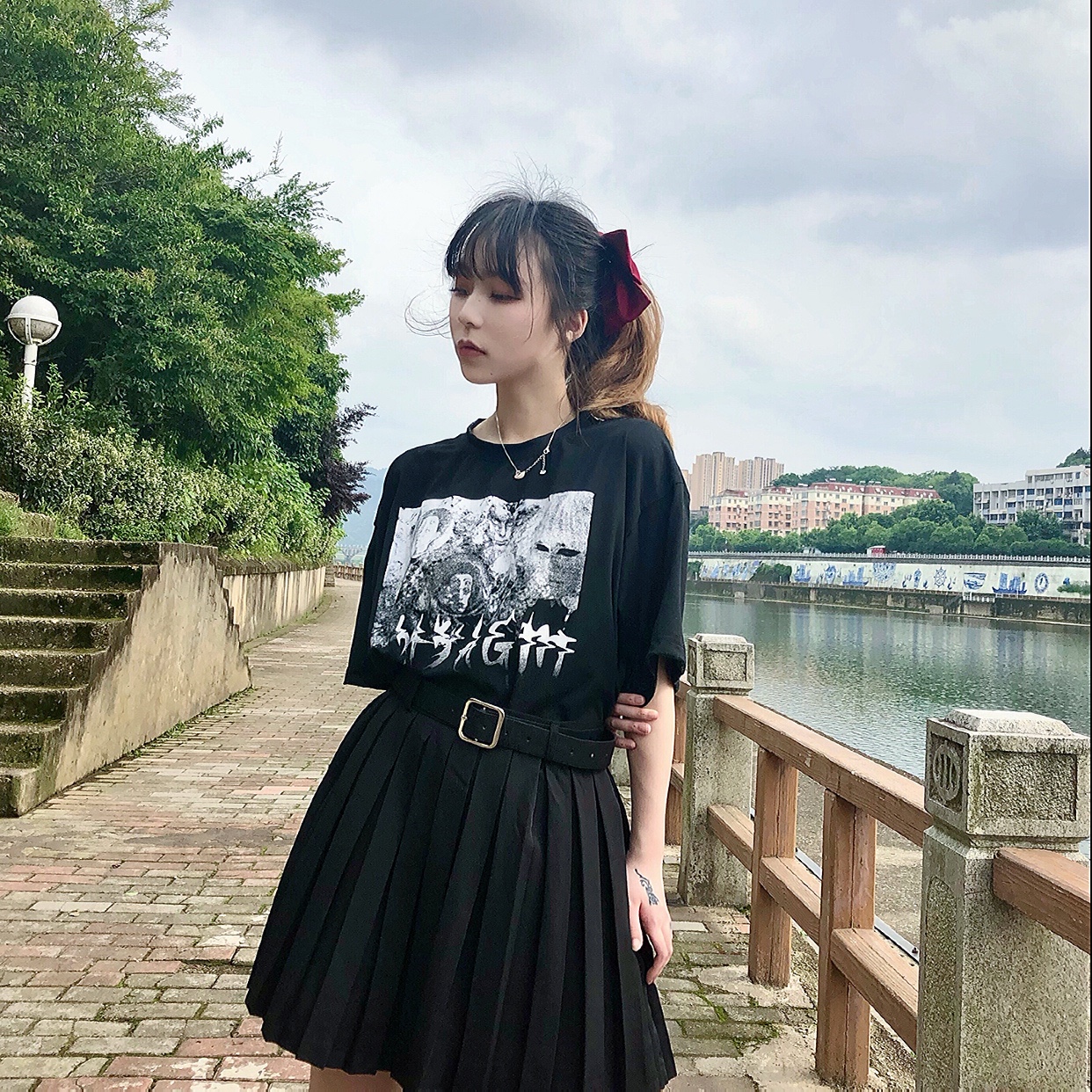 黑t➕百褶裙➕皮带➕高马尾