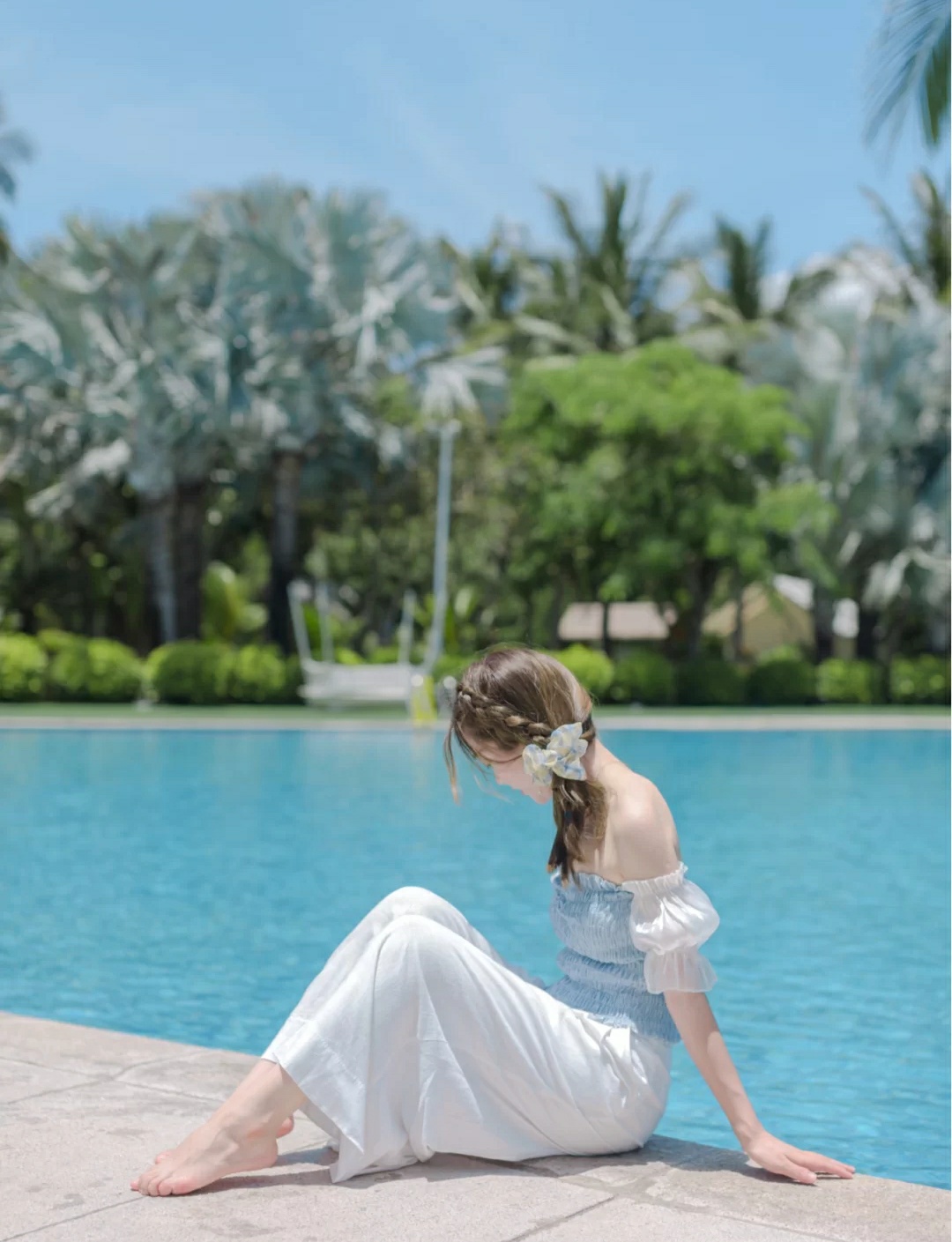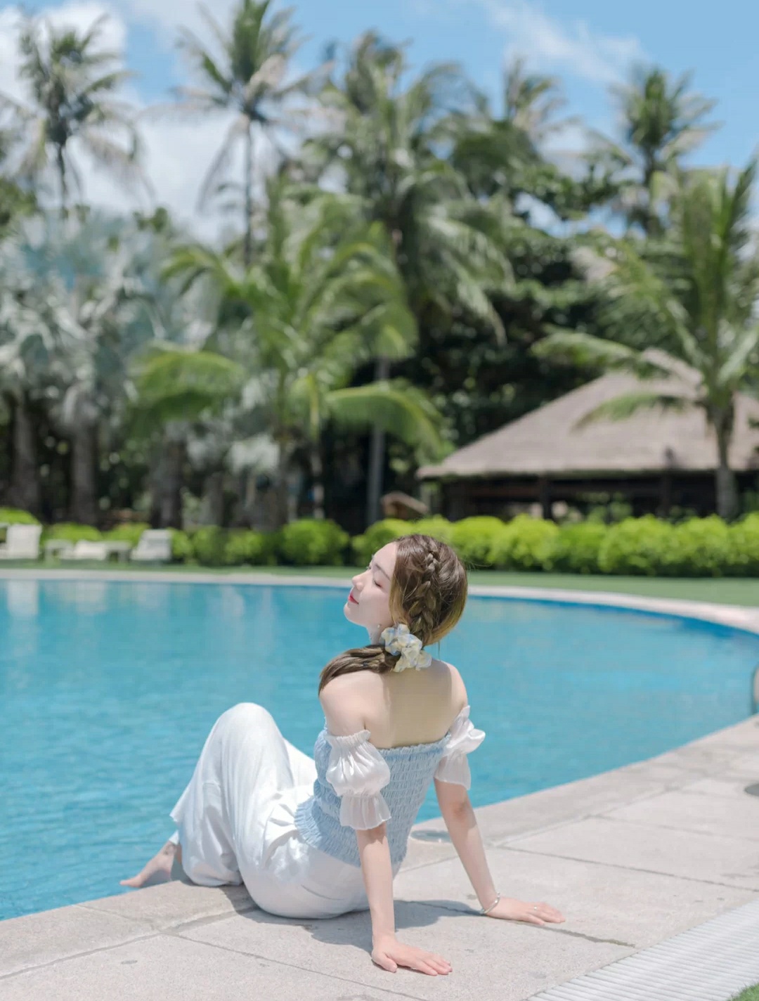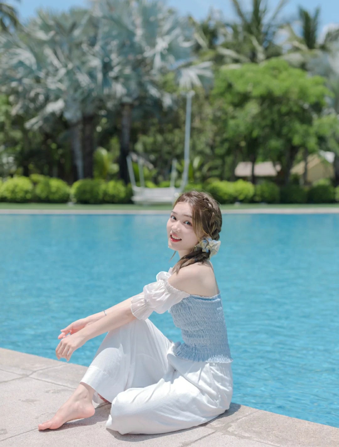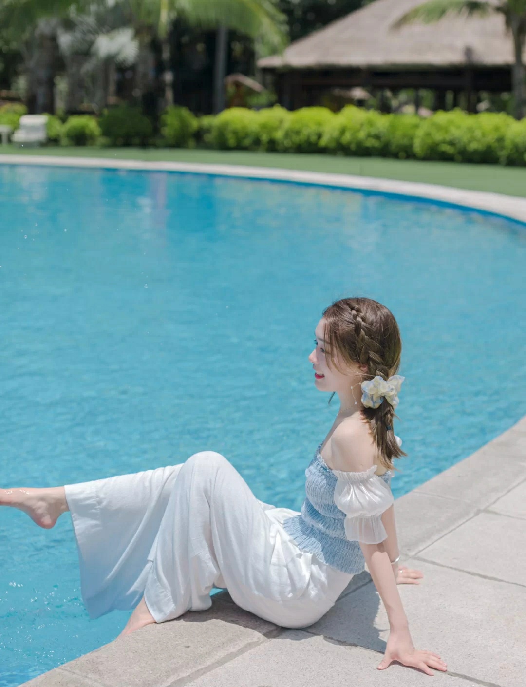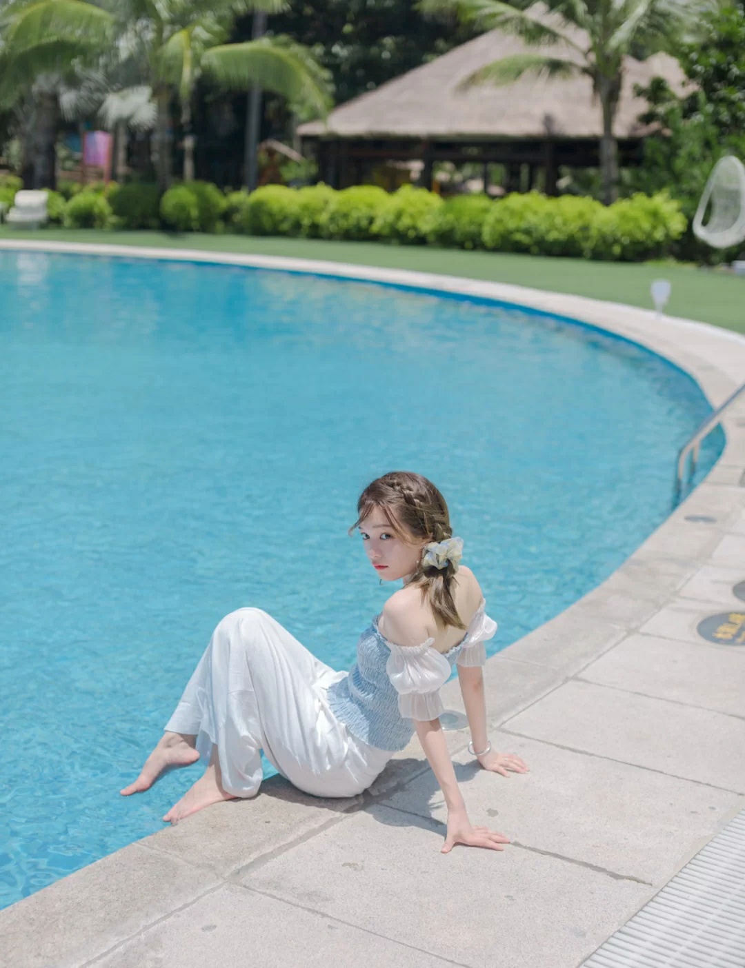 2⃣️贴近泳池坐,把脚伸进泳池里,双手可以撑在背后。
