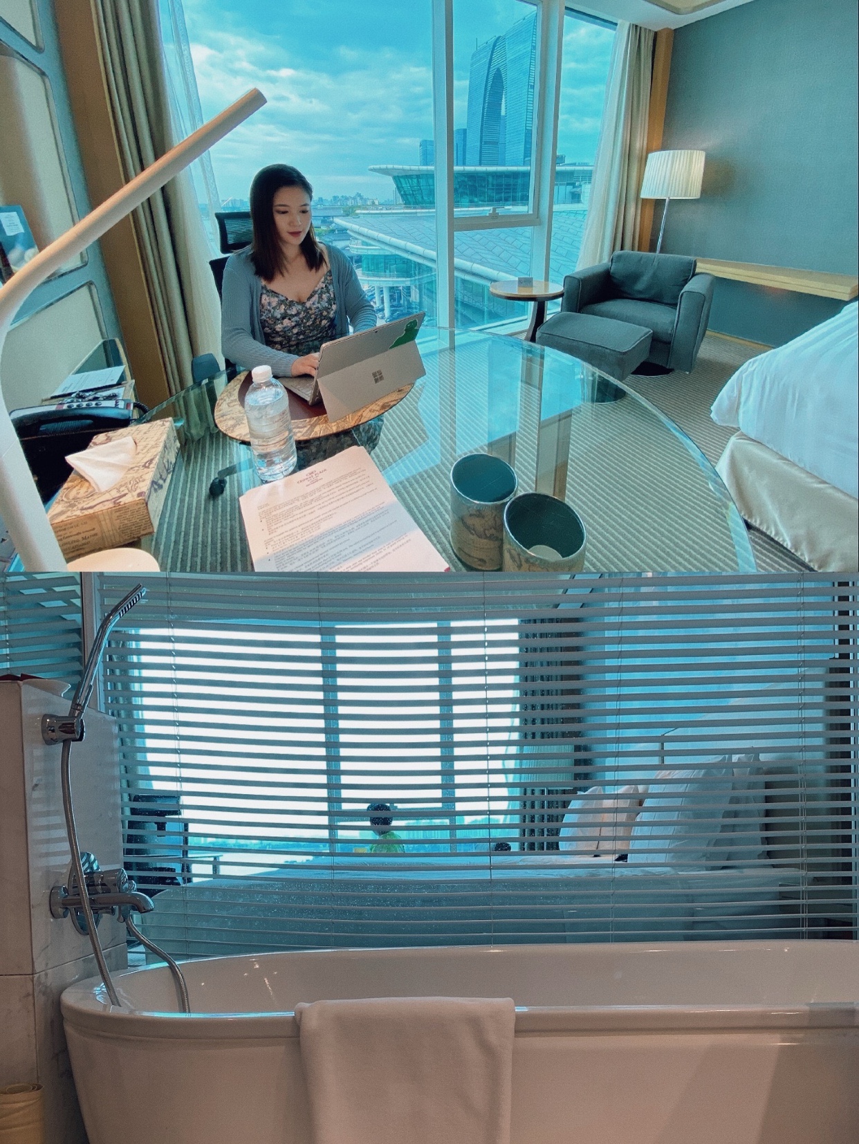 房间180度的观景落地窗,特别视野特别宽阔,躺在那里就可以看见外面的景色,