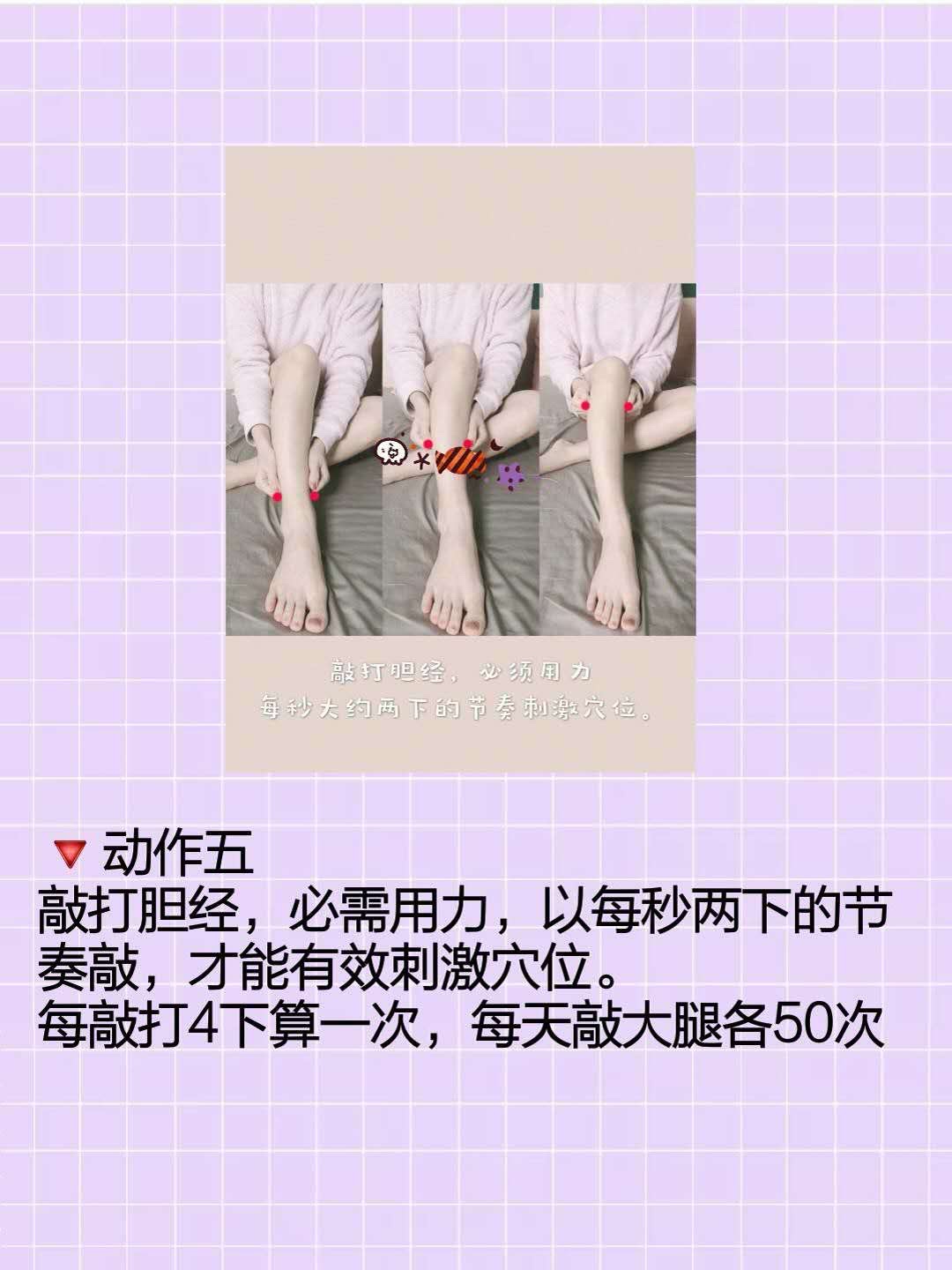 5️⃣敲打胆经必须用力,以每秒两下的节奏敲,才能有效刺激穴位。每敲打4下算一次,每天敲大腿各50次。