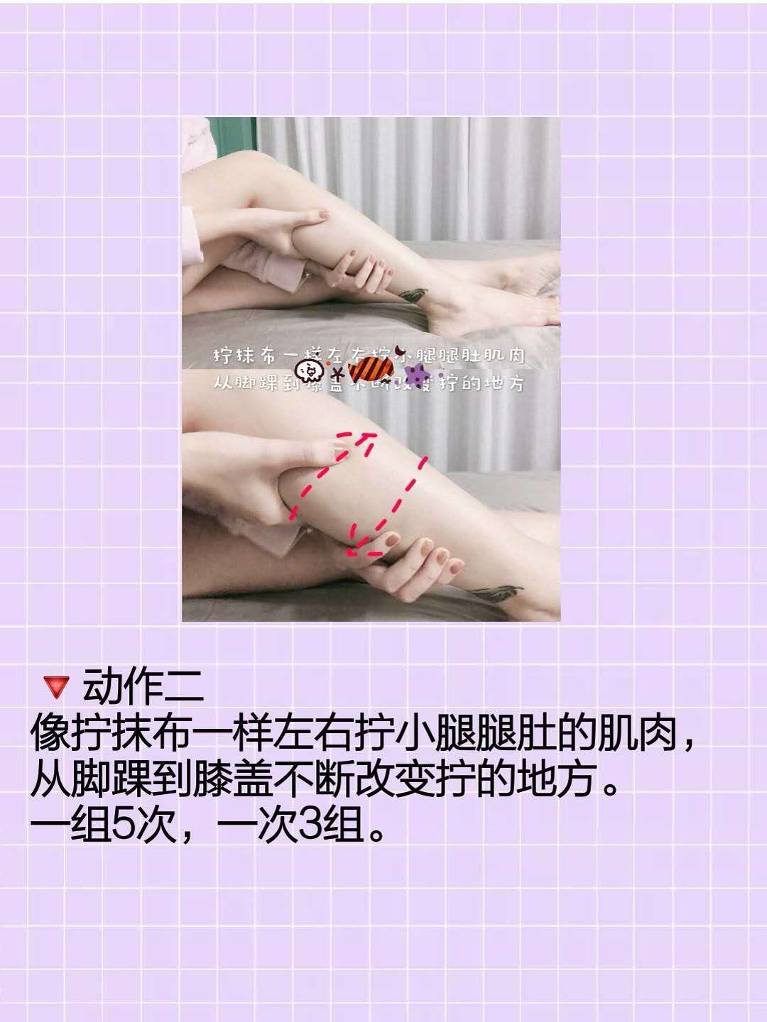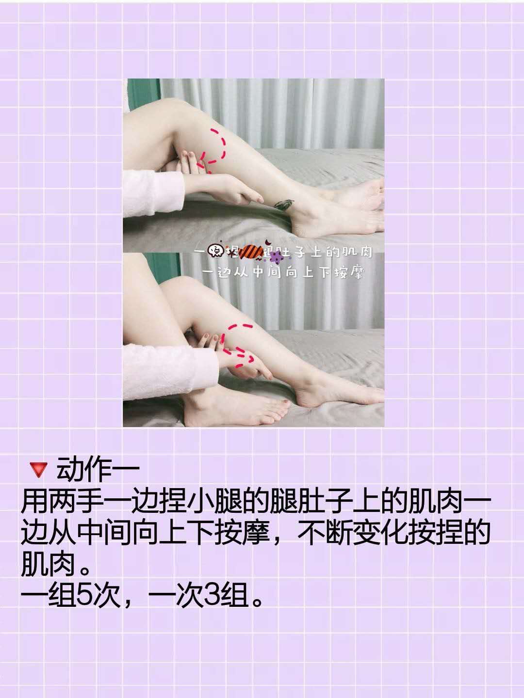 1️⃣用两手一边捏小腿的腿肚子上的肌肉,一边从中间向上下按摩,不断变化按捏肌肉,一组5次一次三组。