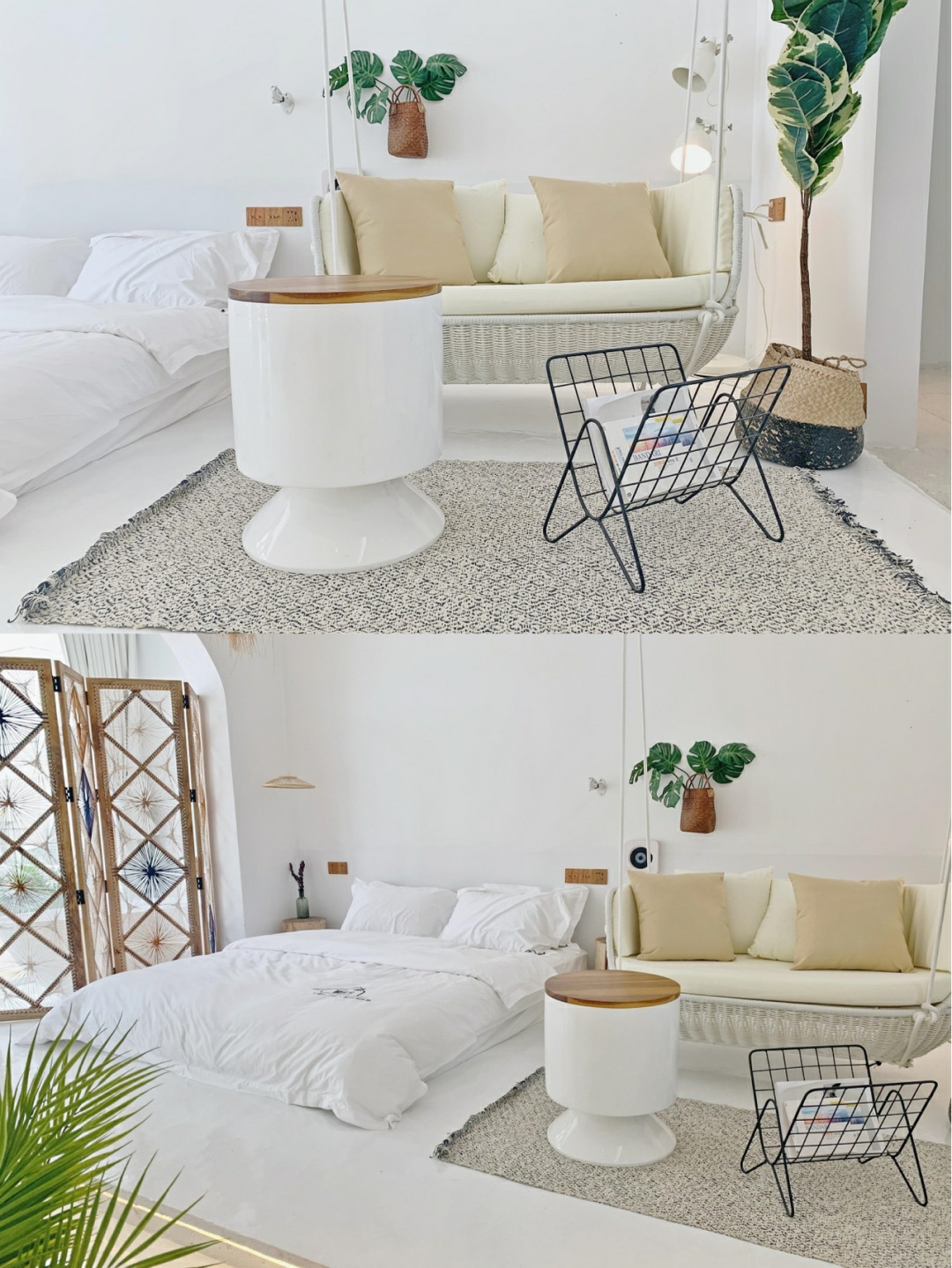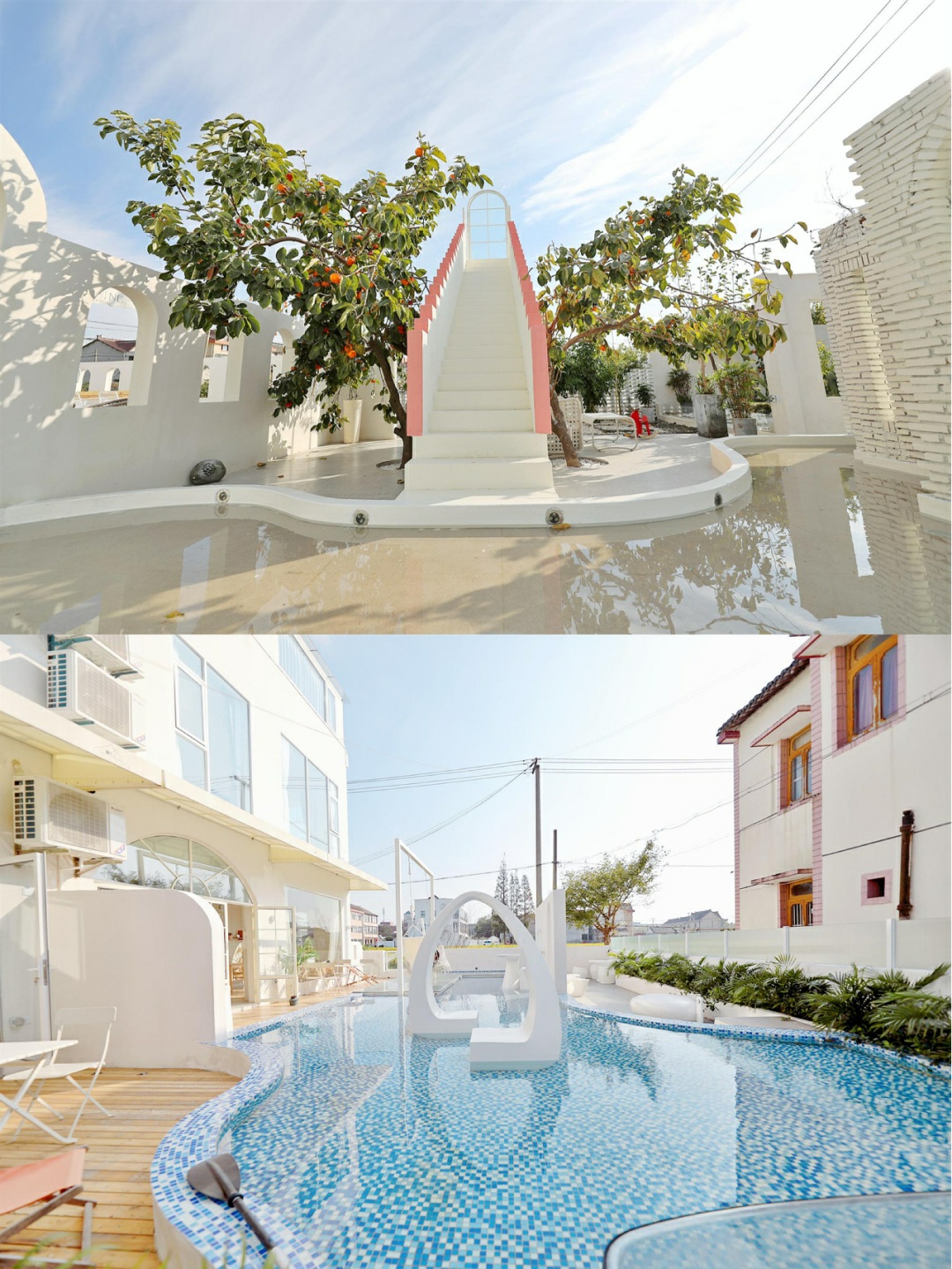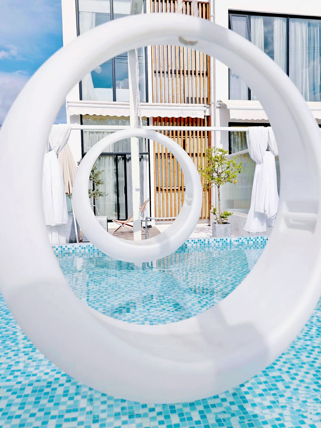蓝白色调搭配在一起很容易引起舒适感,清澈见底的泳池太迷人了,秋千网红吊椅,纯白色的墙壁有一种闪现到摩洛哥的既视感💦
