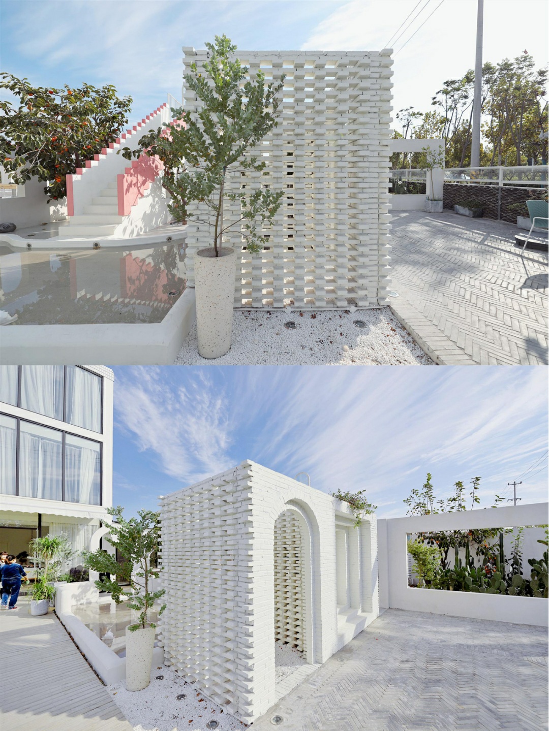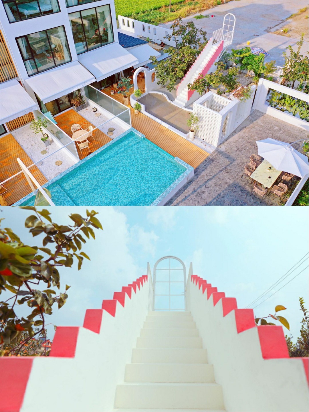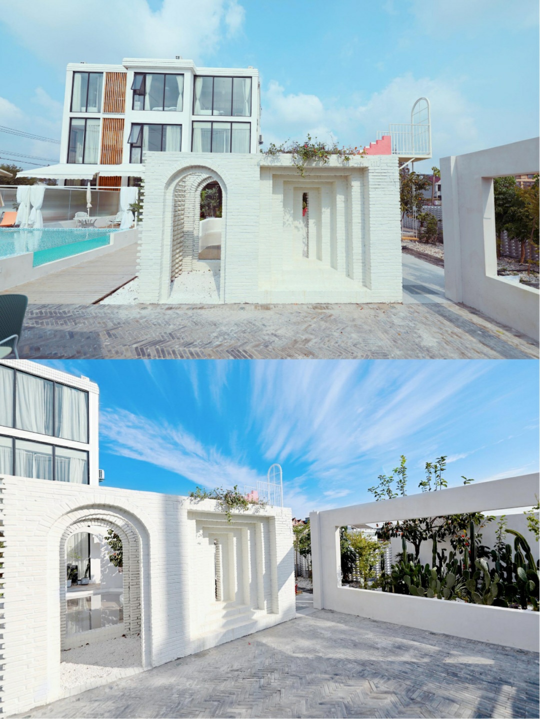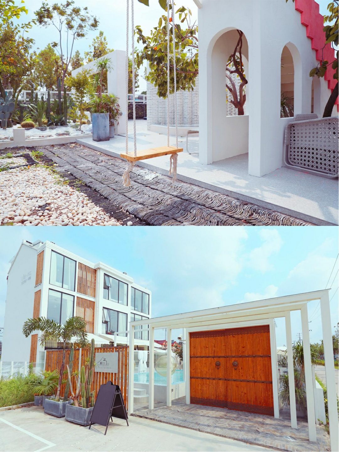蓝白色调搭配在一起很容易引起舒适感,清澈见底的泳池太迷人了,秋千网红吊椅,纯白色的墙壁有一种闪现到摩洛哥的既视感💦