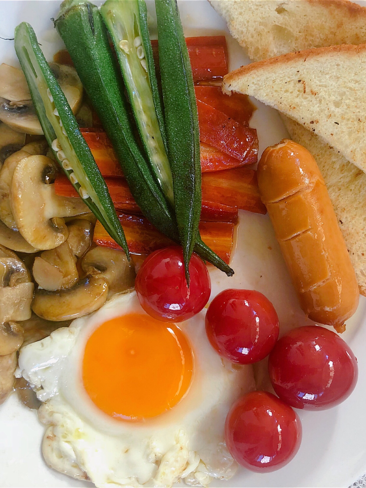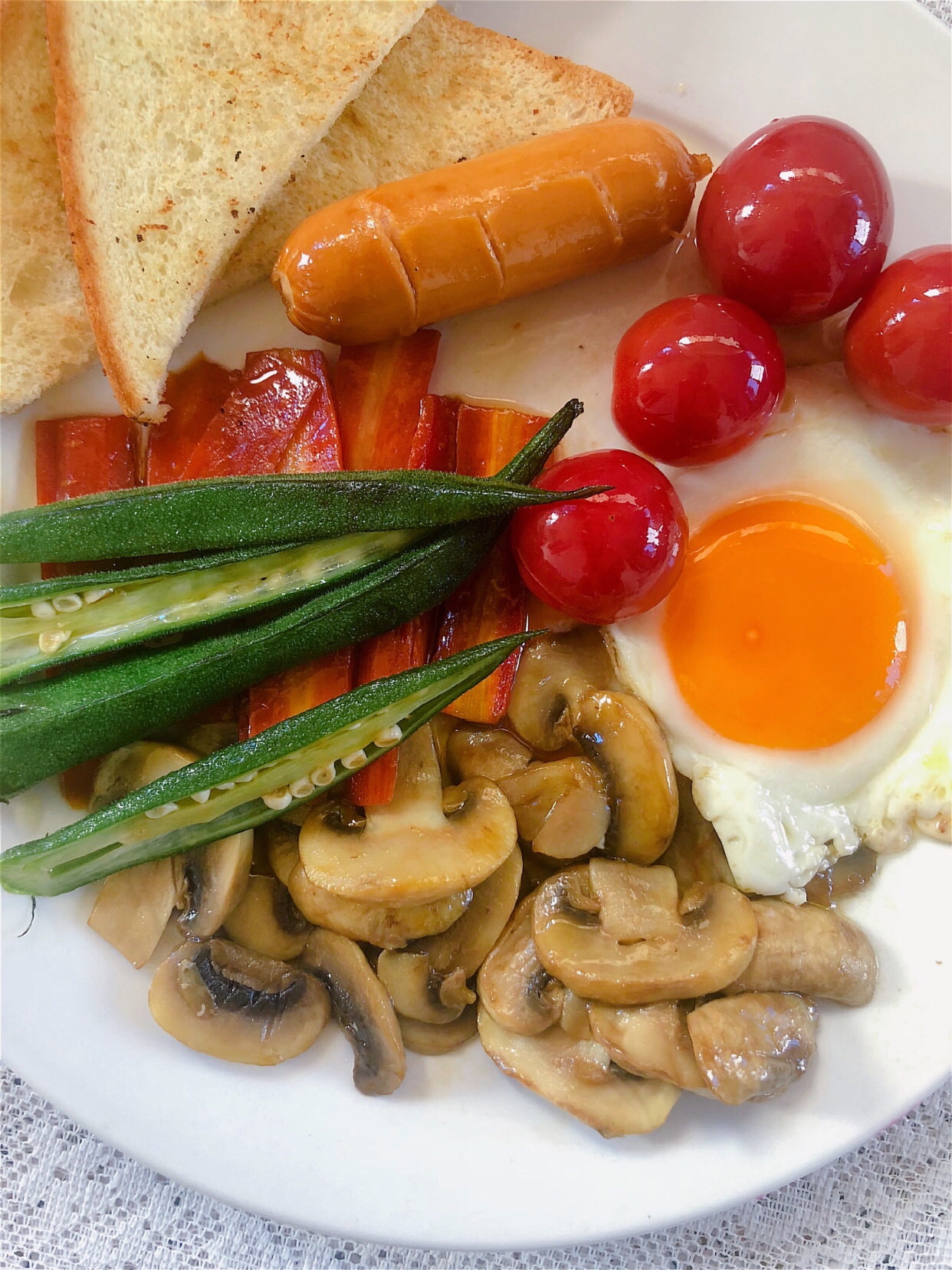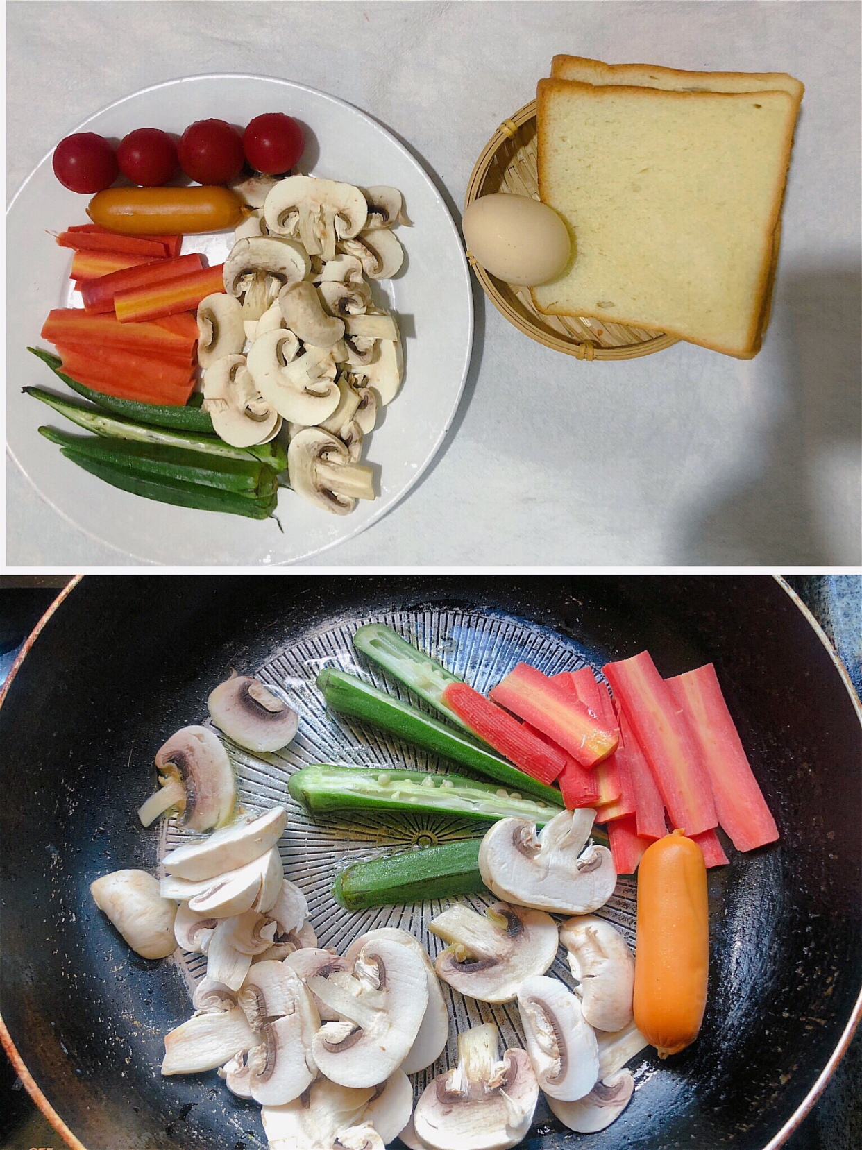 食材:吐司1片、烤肠1根、鸡蛋1个、小番茄4个、胡萝卜少许、口蘑3个、秋葵2个