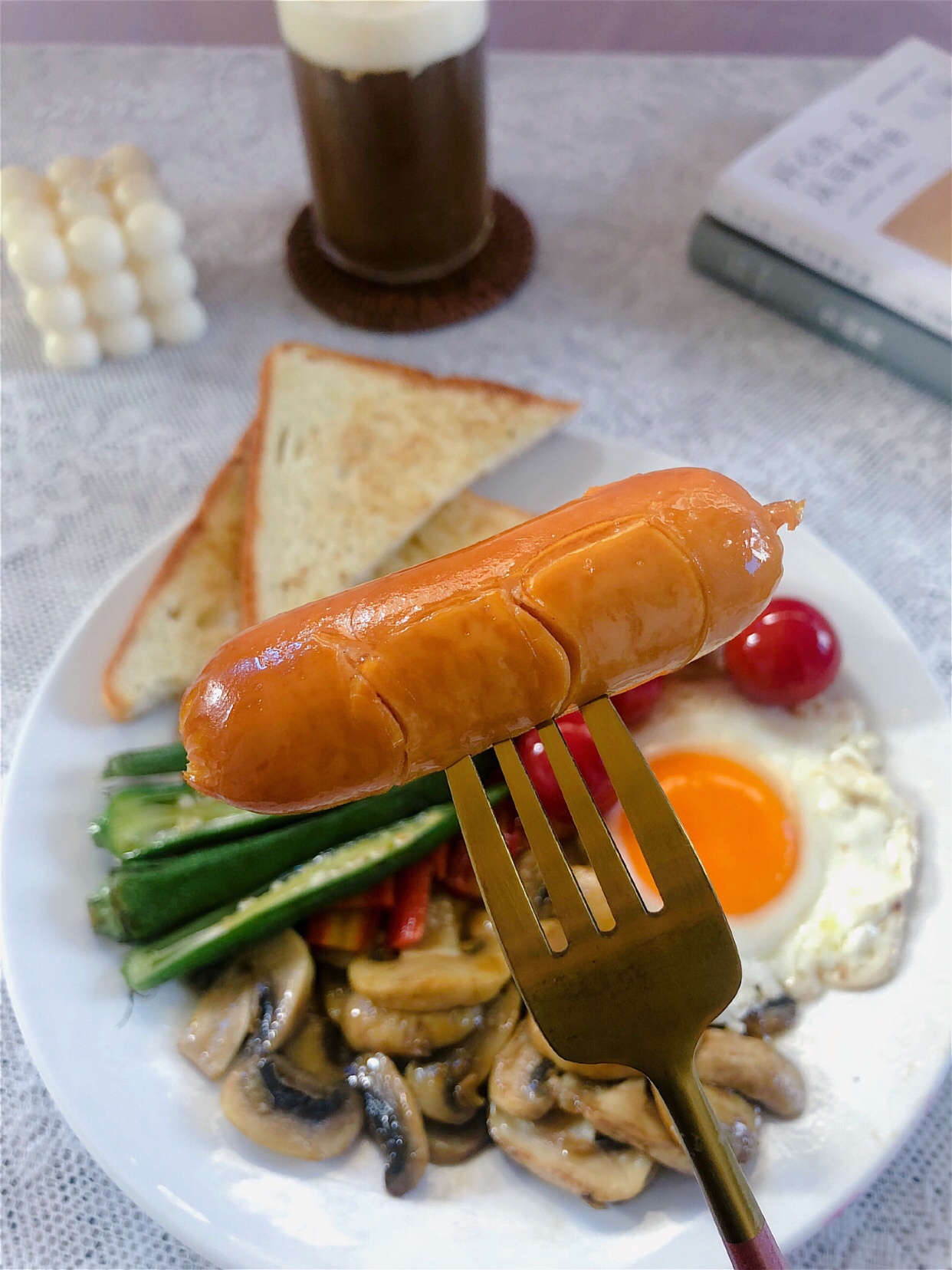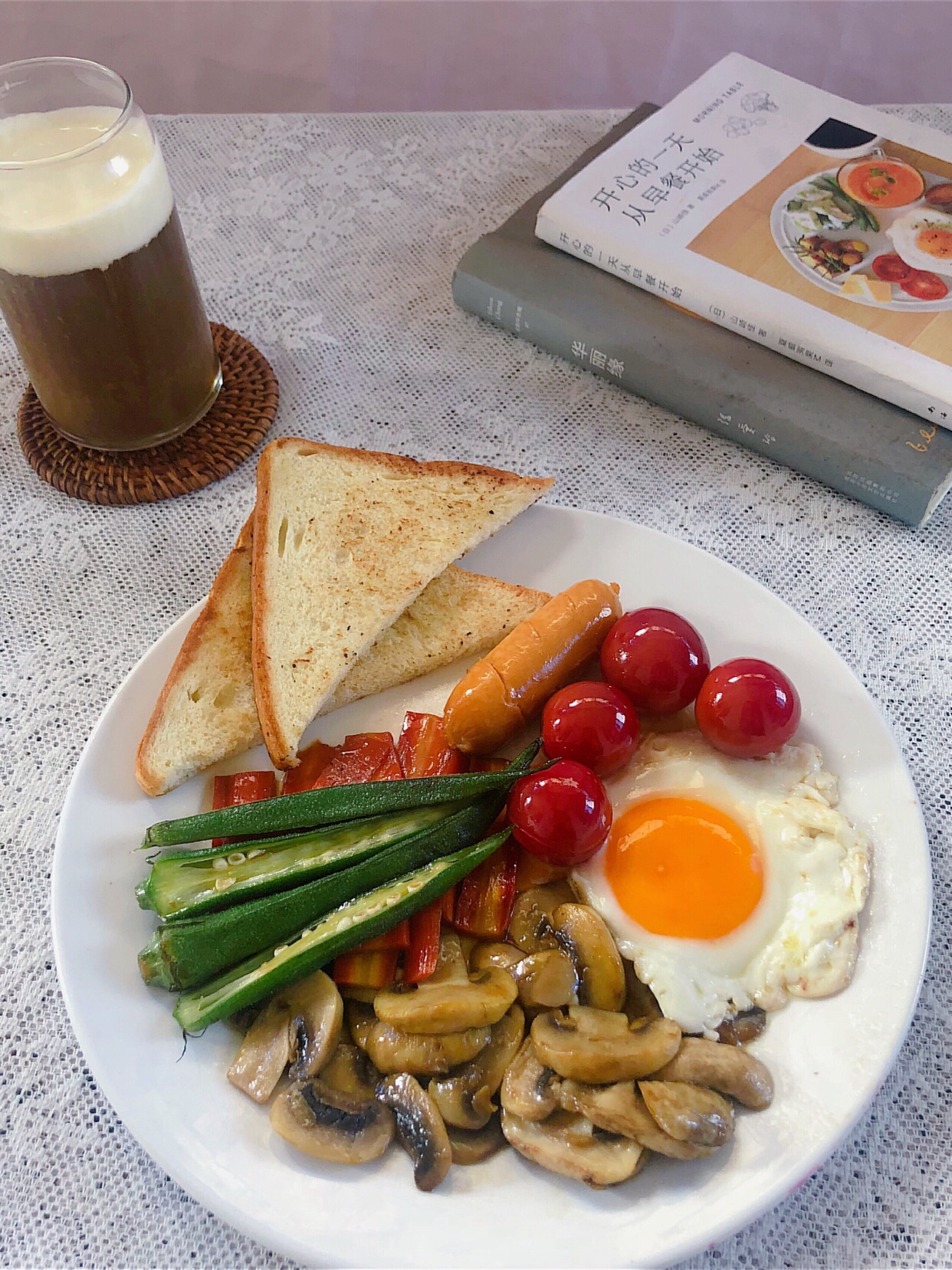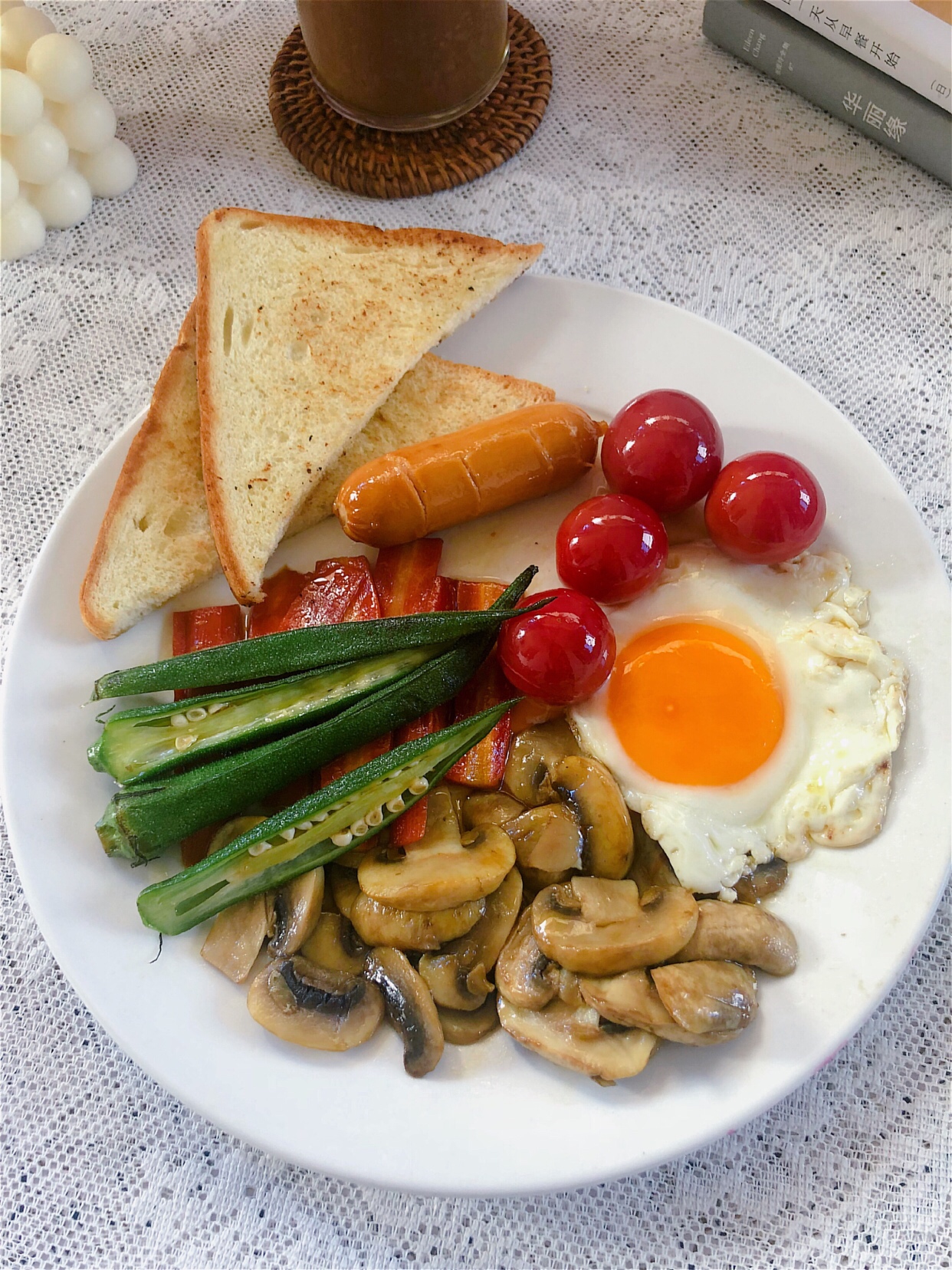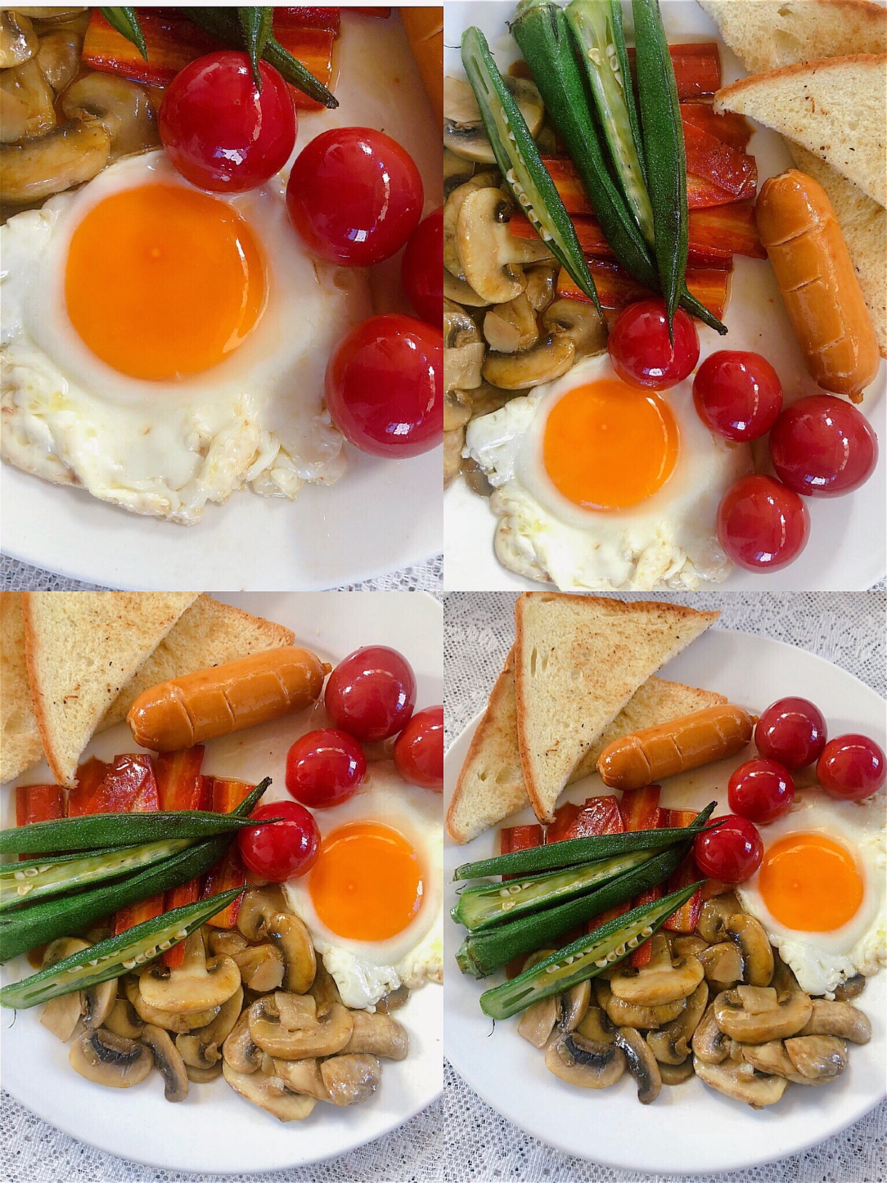 食材:吐司1片、烤肠1根、鸡蛋1个、小番茄4个、胡萝卜少许、口蘑3个、秋葵2个