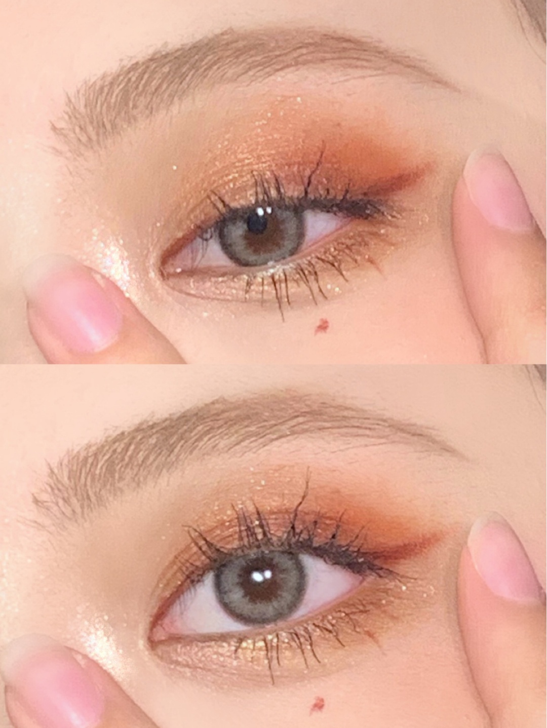 先用较浅的粉金色打底,再用金色加深一下双眼皮位置,两种颜色叠加晕染开来会显得眼色灵动,红棕色加深眼尾,金棕色提亮卧蚕
