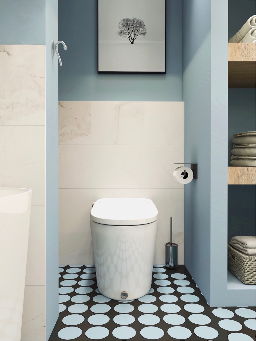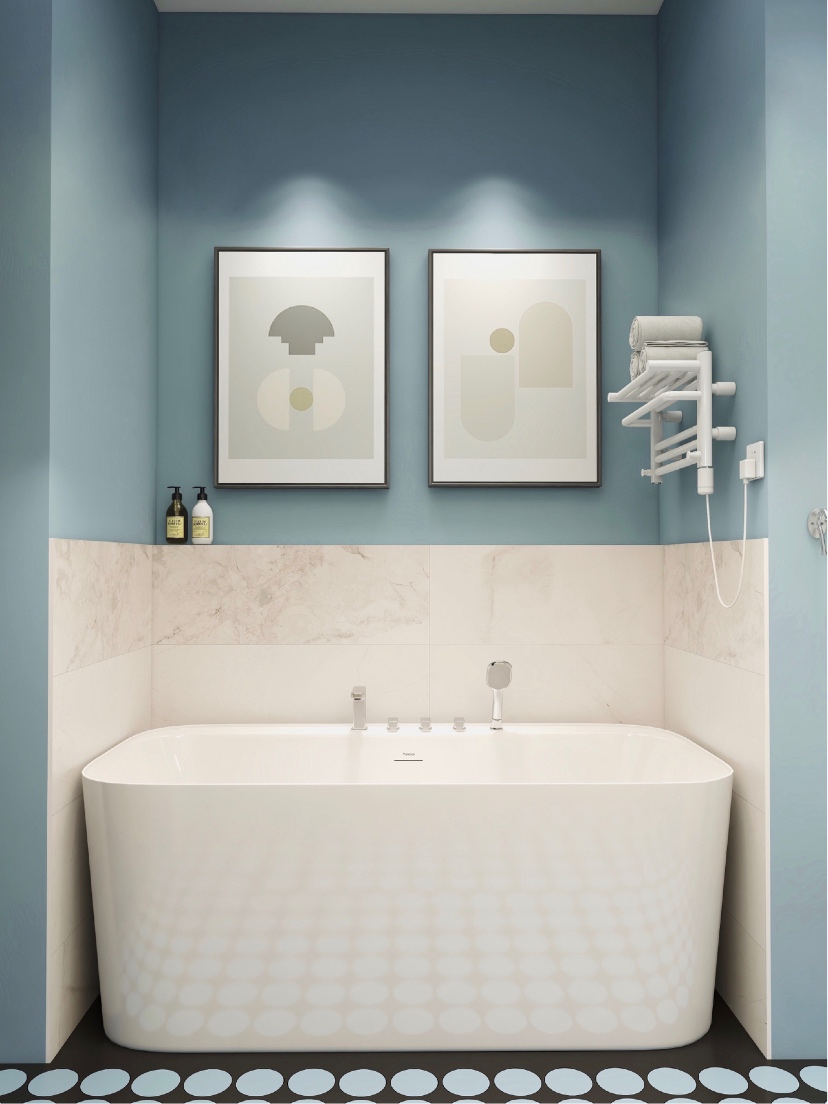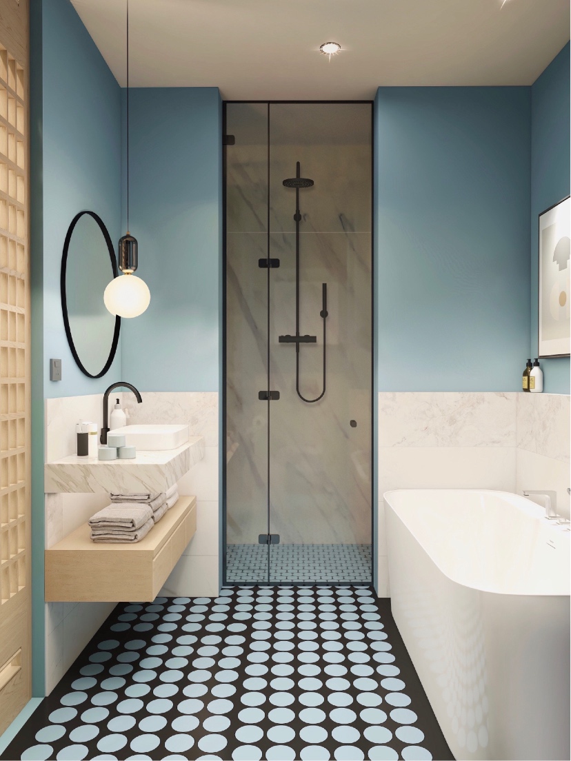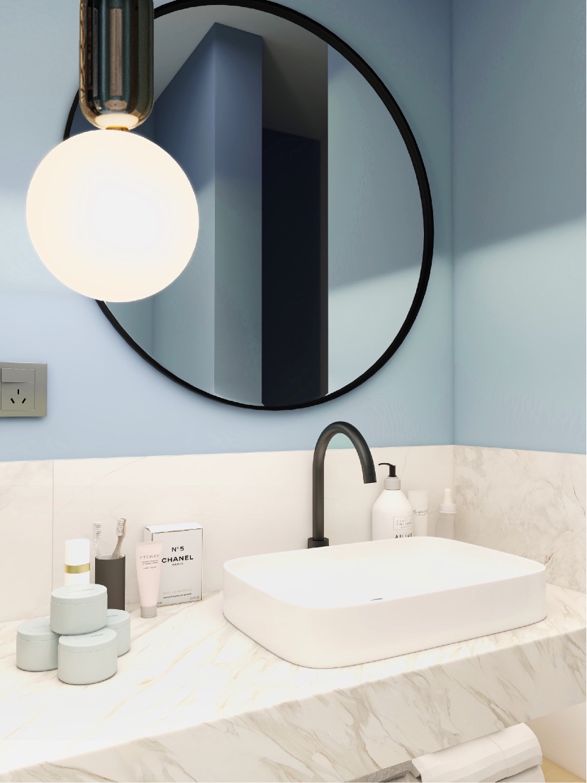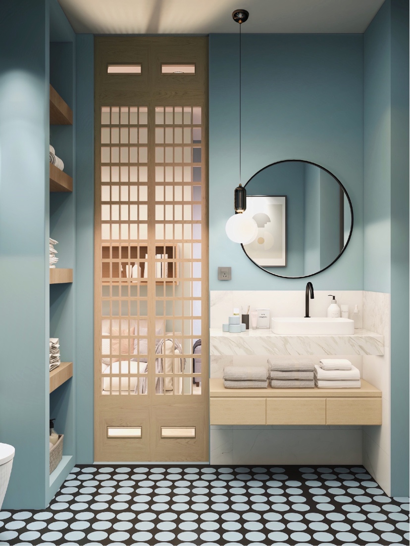 🧡整个卫生间是灰蓝色为主,灰蓝色的浴室漆做部分墙面,低饱和,低明度,🔆散发着温和宁静的氛围。地砖是蓝黑的圆点瓷砖,可以塑造这个空间的立体感和平稳感。
