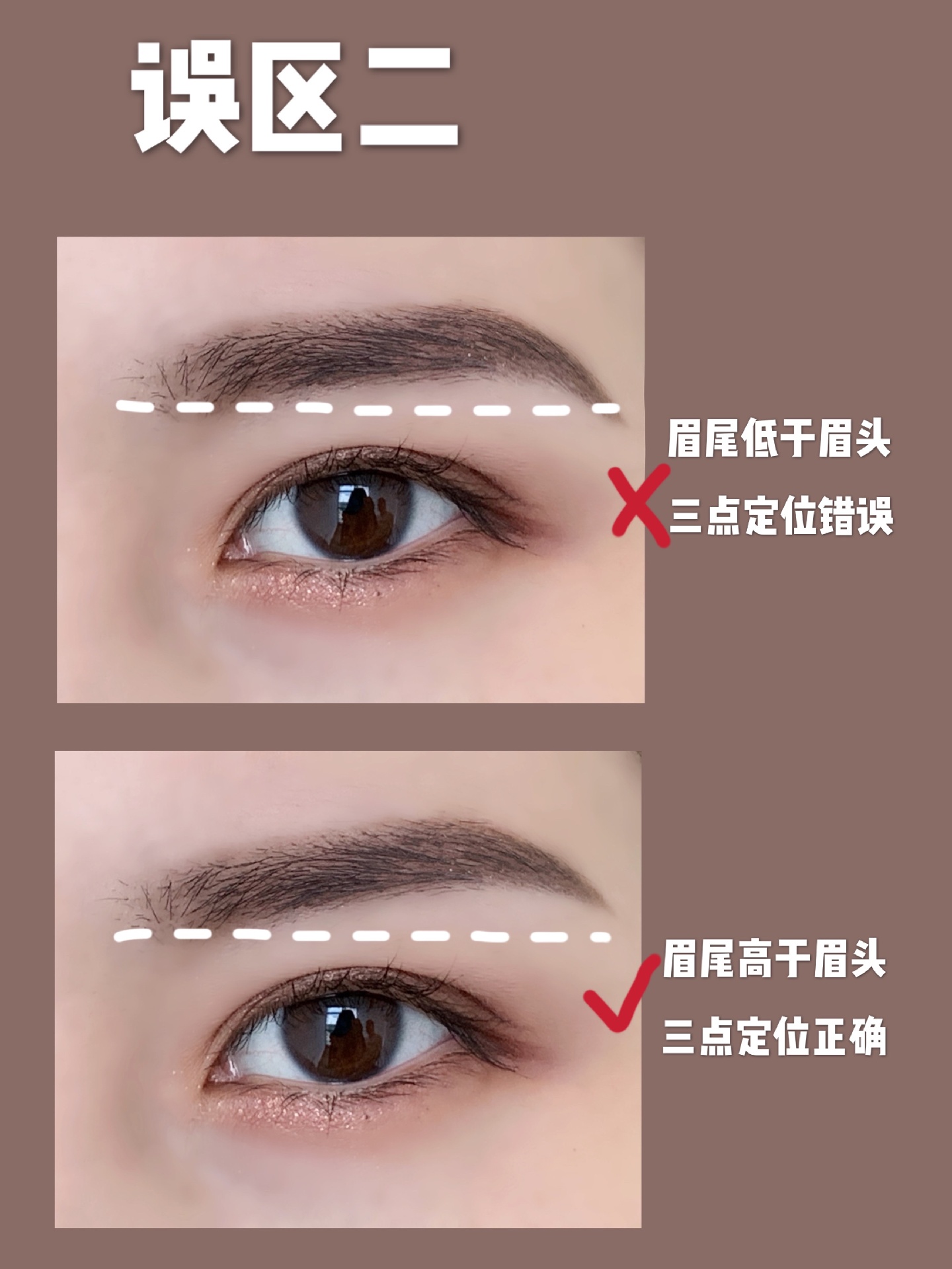 ❎眉尾低于眉头,比例不对,三点定位错误,显得没有精神