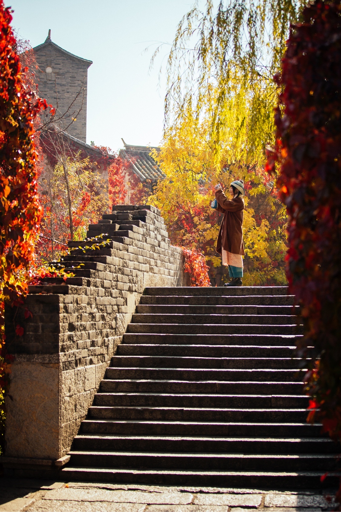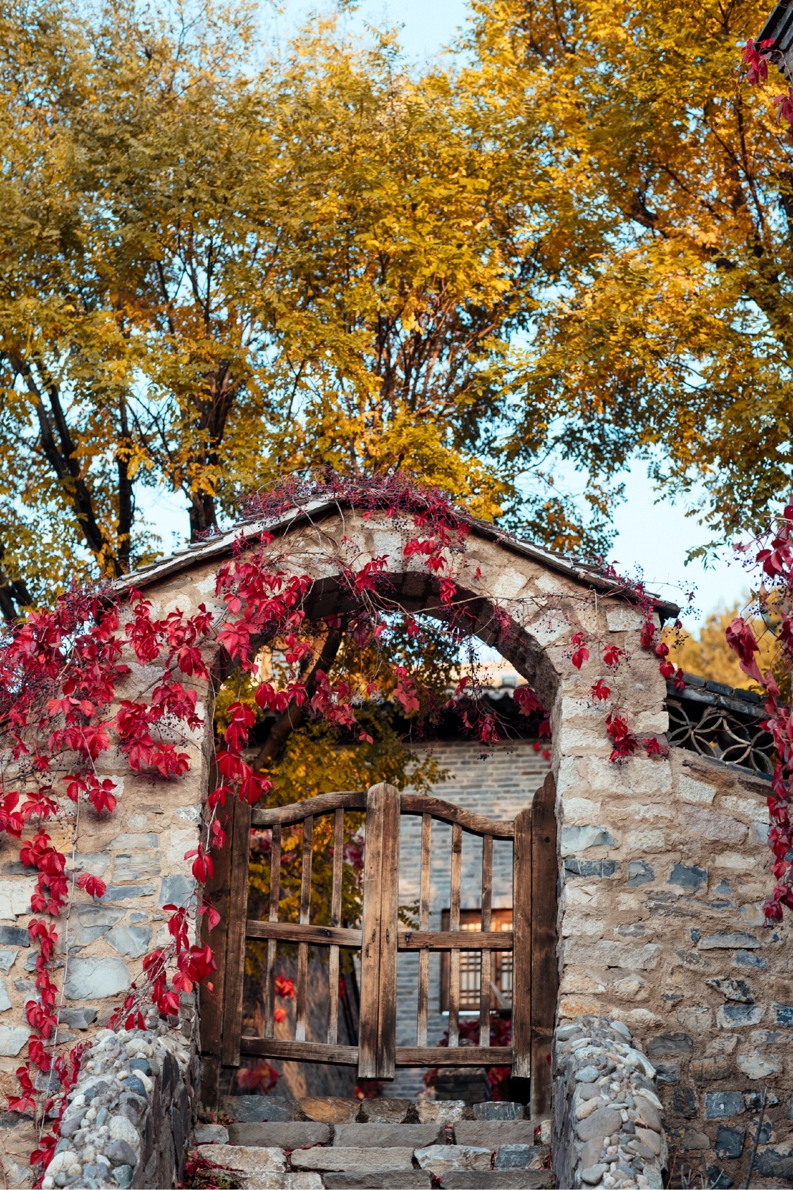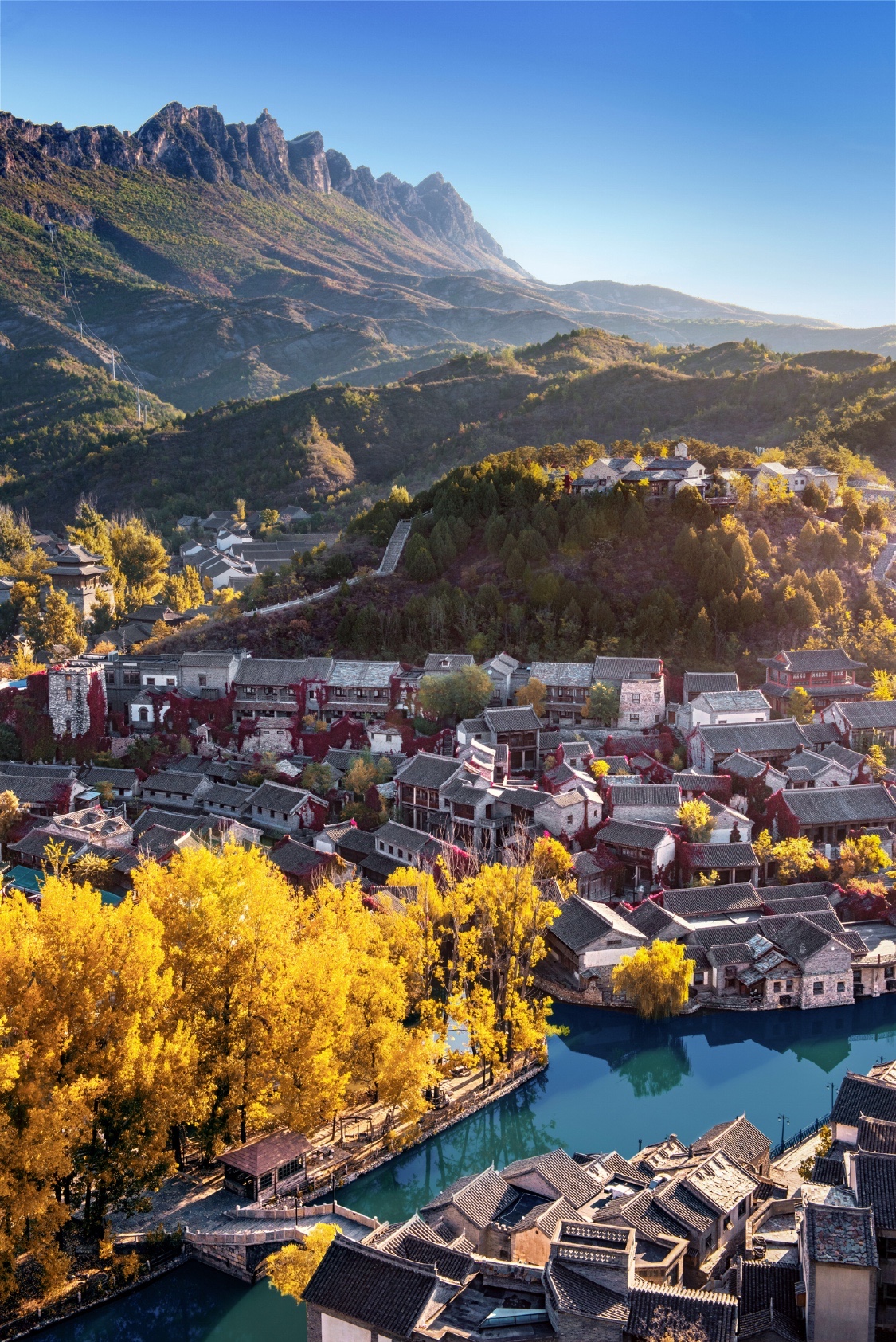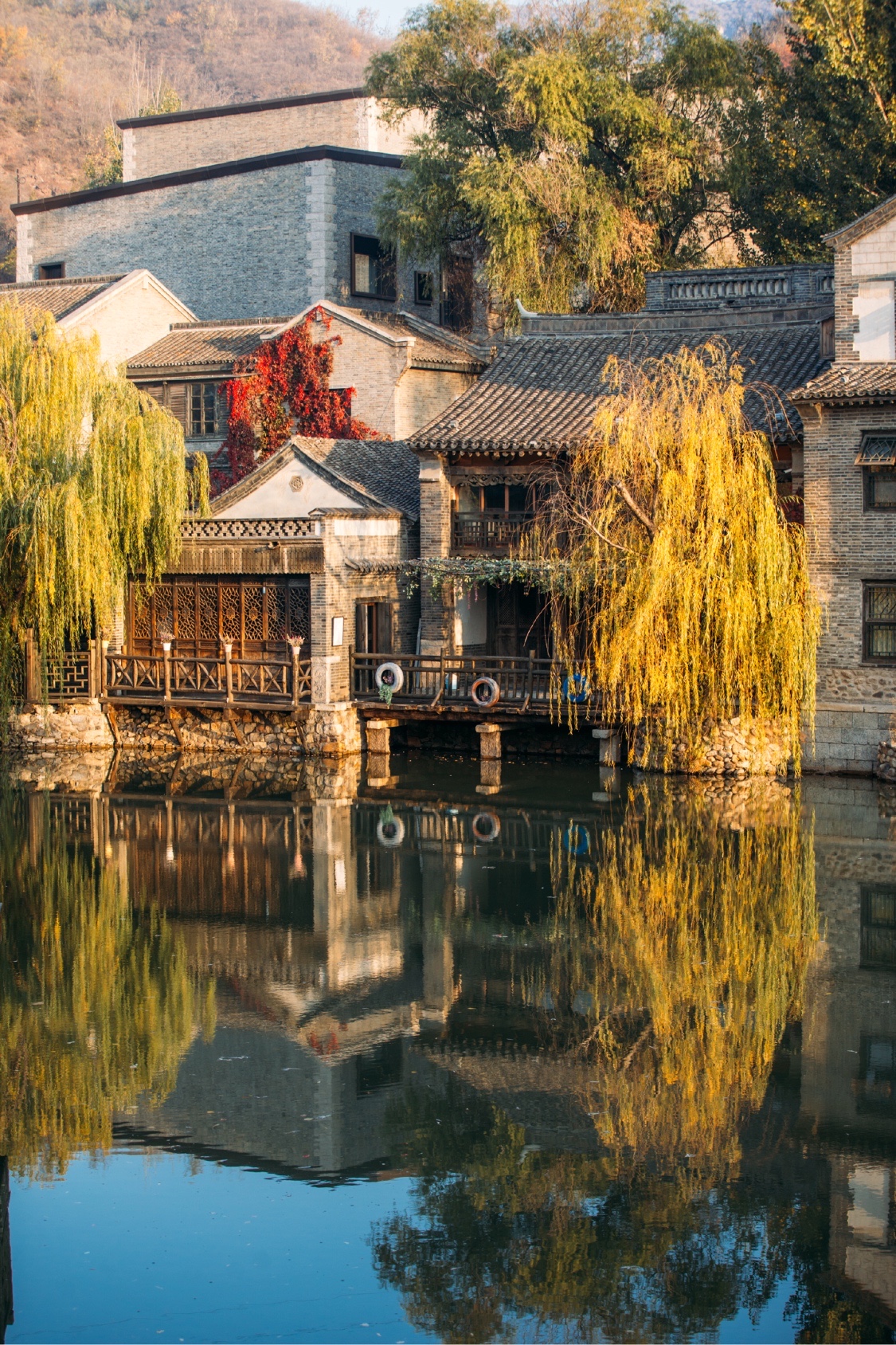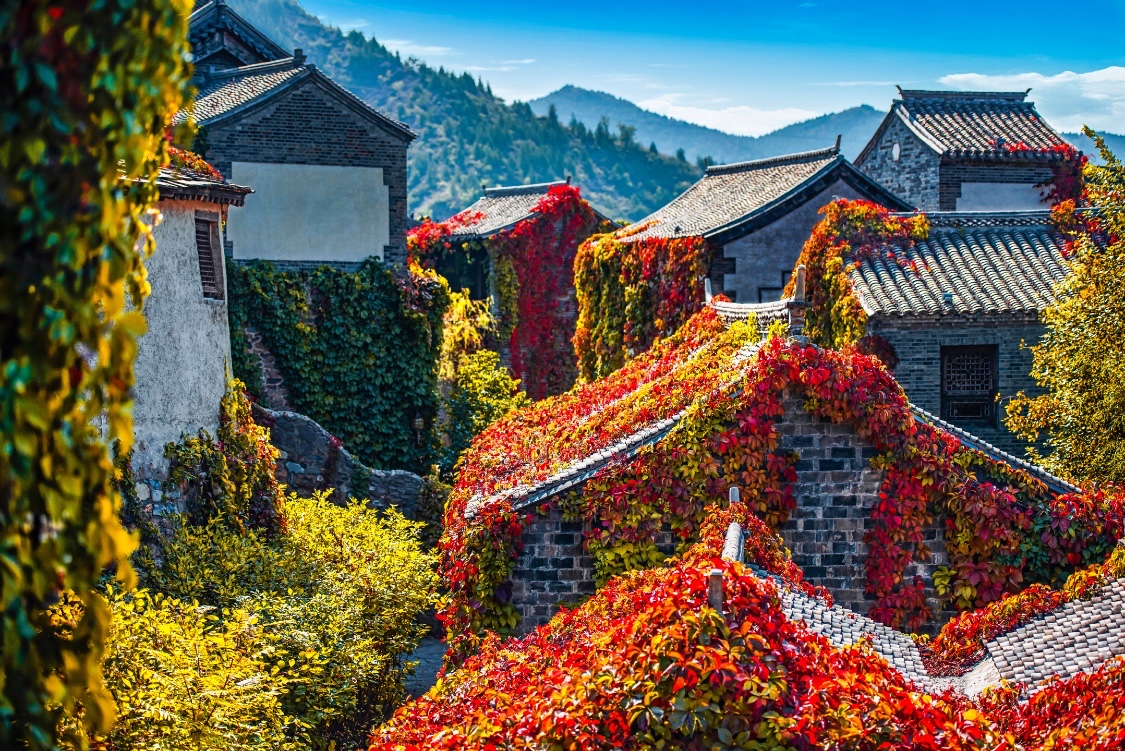 不同于香山、红螺寺、坡峰岭等景点里漫山遍野的红叶,古北水镇的红叶,有着植物与建筑、景色与人文相结合的独特美感。而此时色彩斑斓,与古北水镇的秋色呈现出炫丽的层次感,再衬映着幽幽碧水、涓涓细流,最浪漫的秋色不过如此了。