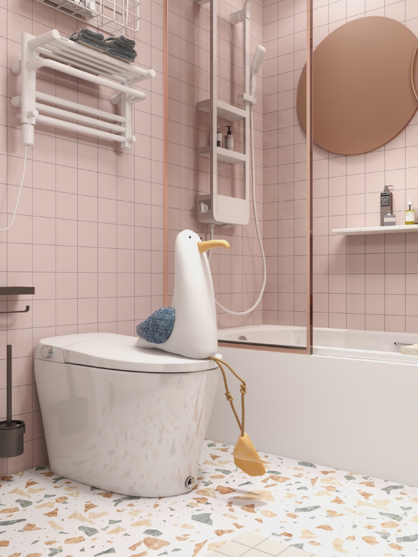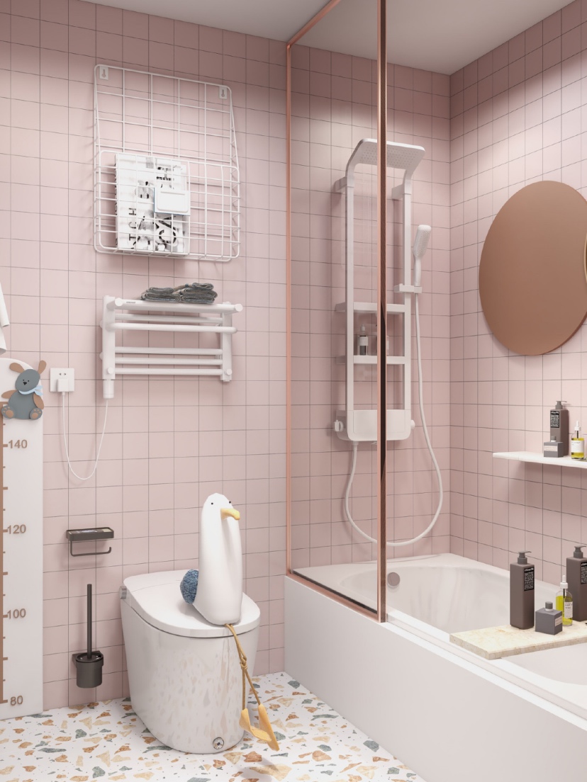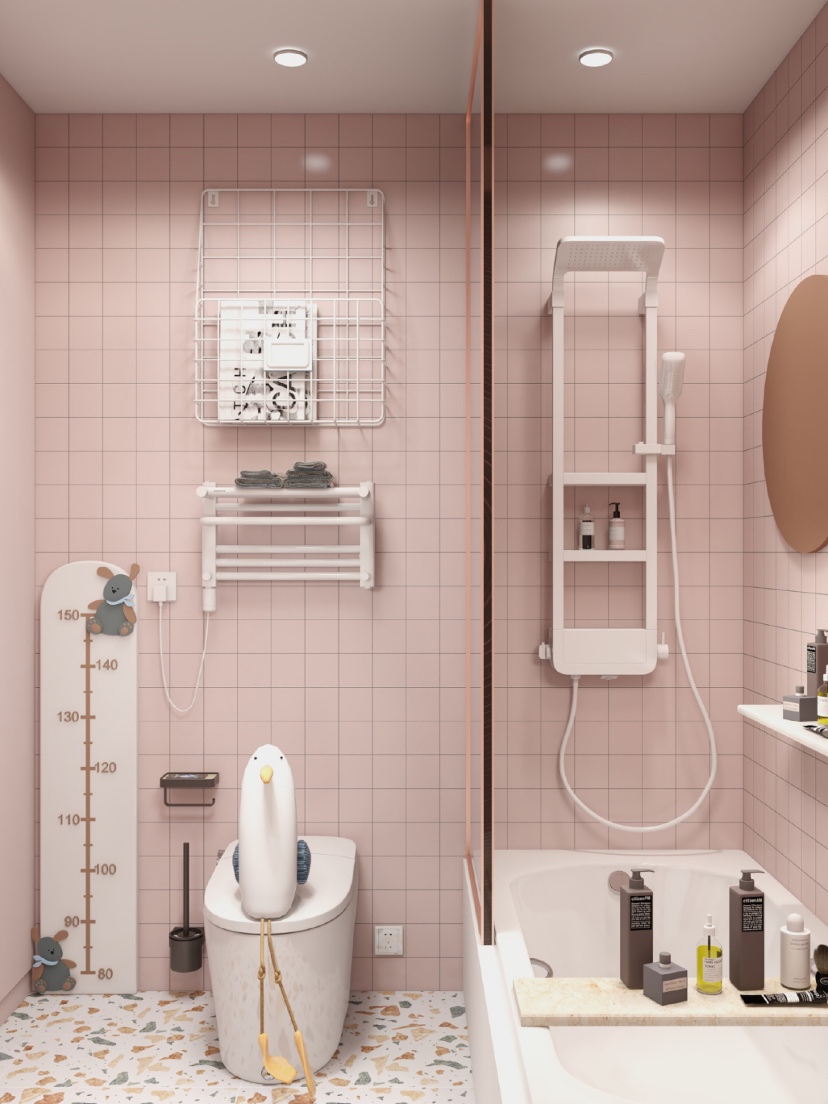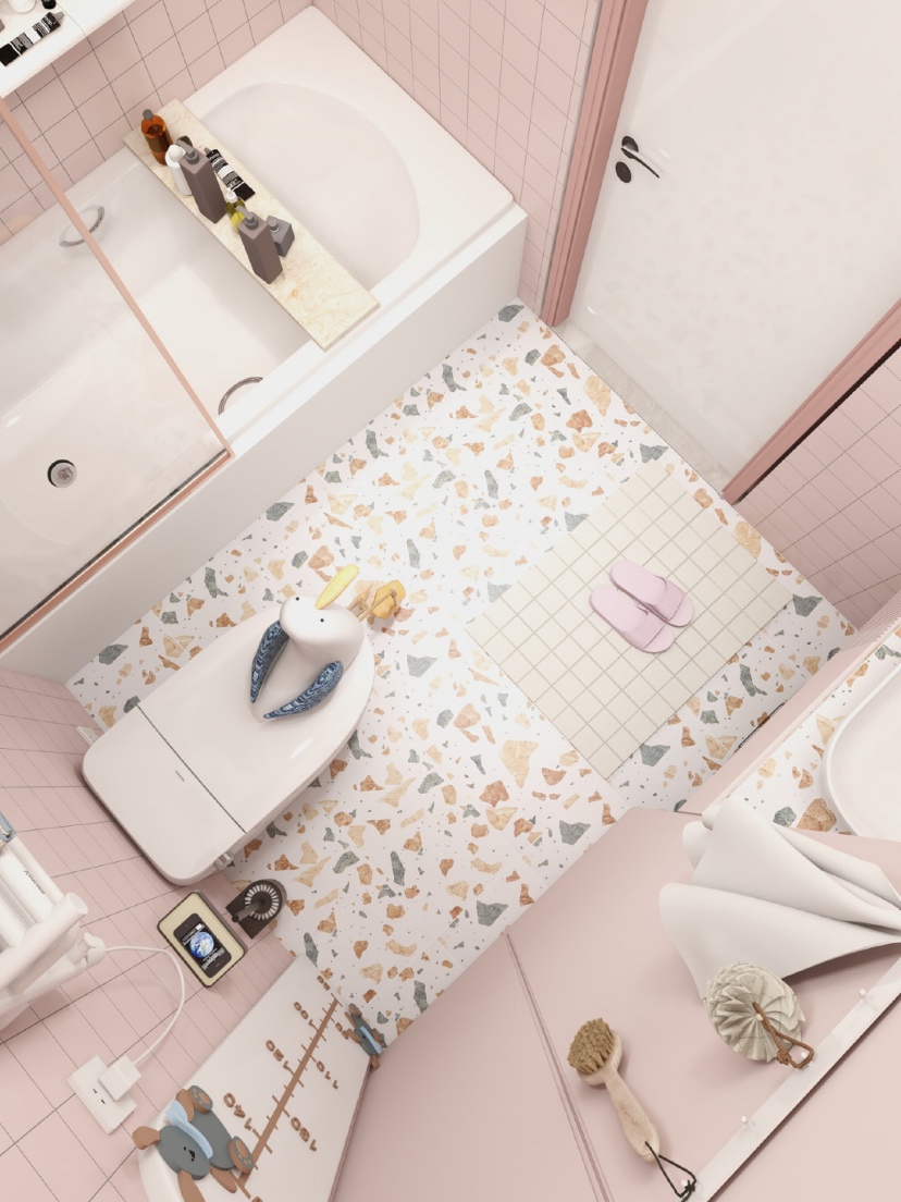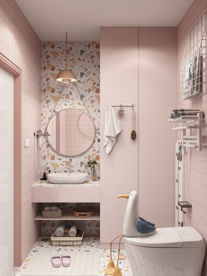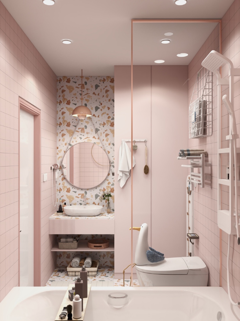 👑总面积4.5m²的马卡龙粉色系浴室,虽然是大面积使用粉色,但是看过了也不会腻味,水磨石让少女心也多了点小清新。